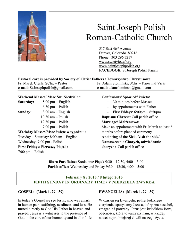 Saint Joseph Polish Roman-Catholic Church 517 East 46th Avenue Denver, Colorado 80216 Phone: 303 296 3217 www.swietyjozef.org www.saintjosephpolish.org FACEBOOK: St.Joseph Polish Parish Pastoral care is provided by Society of Christ Fathers / Towarzystwo Chrystusowe: Fr. Marek Cieśla, SChr. – Pastor Fr. Adam Słomiński, SChr. – Parochial Vicar e-mail: [email protected] e-mail: [email protected] Weekend Masses/ Msze Św. Niedzielne: Saturday: 5:00 pm – English 6:30 pm – Polish Sunday: 8:00 am – English 10:30 am – Polish 12:30 pm – Polish 7:00 pm – Polish Weekday Masses/Msze święte w tygodniu: Tuesday – Saturday: 8:00 am – English Wednesday: 7:00 pm - Polish First Fridays/ Pierwszy Piątek: 7:00 pm – Polish Confessions/ Spowiedź święta: - 30 minutes before Masses - by appointments with Father - First Fridays: 6:00pm – 6:50pm Baptism/ Chrzest: Call parish office Marriage/ Małżeństwo: Make an appointment with Fr. Marek at least 6 months before planned ceremony Anointing of the Sick, /visit the sick/ Namaszczenie Chorych, odwiedzanie chorych: Call parish office Biuro Parafialne: Środa oraz Piątek 9:30 – 12:30, 4:00 – 5:00 Parish office: Wednesday and Friday 9:30 – 12:30, 4:00 – 5:00 February 8 / 2015 / 8 lutego 2015 FIFTH SUNDAY IN ORDINARY TIME / V NIEDZIELA ZWYKŁA GOSPEL: (Mark 1, 29 - 39) EWANGELIA: (Marek 1, 29 - 39) In today’s Gospel we see Jesus, who was awash in human pain, suffering, neediness, and loss. He turned directly to God His Father in heaven and prayed. Jesus is a witnesses to the presence of God in the core of our humanity and in all of life. W dzisiejszej Ewangelii, pełnej ludzkiego cierpienia, spotykamy Jezusa, który zna nasz ból, zmagania i potrzeby. Jezus jest świadkiem Bożej obecności, która towarzyszy nam, w każdej, nawet najtrudniejszej chwili naszego życia. From the desk of Father Marek…… Saturday / Sobota – February 7 5:00 pm (E) + Jay Cramer – Mary Ann Cramer. 6:30 pm (P) W intencji Bogu wiadomej. Fifth Sunday in Ordinary Time/ V Niedziela Zwykła – February 8 8:00 am (E) + Elsie Glinski – Margaret Sillstrop and friends at Jagged Peak. 10:30 am (P) 1. Z podziękowaniem i z prośbą o dalsze łaski dla Ani i Tomka z okazji 20-tej rocznicy ślubu. 2. O przebaczenie, pokój i miłość w rodzinie. 3. O łaski dla Jana z okazji urodzin. 4. O łaski dla Zofii z okazji urodzin. 5. O łaski dla Sylwii z okazji urodzin. 6. + Damian Radzięta /zm. tragicznie/. 12:30 pm (P) O zdrowie dla Ireny Gessner. 7:00 pm (P) O zdrowie dla Zofii. Tuesday / Wtorek – February 10 8:00 am (E) No Mass. Wednesday / Środa – February11 8:00 am (E) No Mass. 7:00 pm (P) No Mass. Thursday / Czwartek – February 12 8:00 am (E) No Mass Friday / Piątek – February 13 8:00 am (E) No Mass. Saturday / Sobota – February 14 8:00am (E) ………………. 5:00 pm (E) O łaski i błogosławieństwo Boże dla Natalii, Marii, Anthony, Kathrine Mąka. 6:30 pm (P) ……………….. Sixth Sunday in Ordinary Time/ VI Niedziela Zwykła – February 15 8:00 am (E) + Eugene Bilecky. 10:30 am (P) W podziękowaniu za dotychczasowe zdrowie i łaski Boże z prośbą o dalsze w kolejną rocznicę ślubu Staszka i Sabiny. 12:30 pm (P) O łaski i błogosławieństwo Boże dla Felicji z okazji 90-tej rocznicy urodzin. 7:00 pm (P) + Rev. Lawrence B. Kaiser. Last week “Evaluation and Planning Process” began in our Parish as well as in all other parishes of Denver Archdiocese. With faith and hope we look at our own St. Joseph Community and ask the Holy Spirit to guide us in the upcoming years. Please pray for all Catholics in the Archdiocese as we continue this important process. On Monday, February 2nd the Catholic Church celebrated the World Day for Consecrated Life. This weekend all the parishes around the World are asked to continue to pray for Consecrated Life. Please pray for all those who have made commitments in the consecrated life. May they continue to be inspired by Jesus Christ and respond generously to God's gift of their vocation. This Sunday, February 8th, is also “International Day of Prayer and Awareness against Human Trafficking”. It is the feast day of St. Josephine Bakhita, who was kidnapped as a child and sold into slavery in Sudan and Italy. Once Josephine was freed, she became a Canossian nun and dedicated her life by sharing her testament of deliverance from slavery and comforting the poor and suffering. She was declared a Saint in 2000. There is a special Mass this Sunday at noon in the Upper Church of the Basilica of the National Shrine of the Immaculate Conception in Washington, DC. In Spirit we join with this celebration. Through prayer, we not only reflect on the experiences of those that have suffered through this affront to human dignity, but also comfort, strengthen, and help empower survivors. ----------------------------------------------------------Składamy serdeczne podziękowanie naszym wspaniałym Seniorom za cały trud i wysiłek jaki włożyli w przygotowanie „Festiwalu Polskich Zup”. Kolejny raz mieliśmy wspaniałą ucztę dla podniebienia. Ze sprzedaży przygotowanych przez Was zup, ciast na parafię wypracowaliście $809.00. Serdeczne Bóg zapłać. ----------------------------------------------------------Divine Mercy Chaplet - Every Second Sunday of the Month before all Sunday Masses. CONTRIBUTION STATEMENTS FOR 2014 Nadzwyczajni Szafarze Eucharystii: To request a statement of your contributions for 2014, please drop a note in the collection basket or call/email Parish Office. Include your name, address and 2014 envelope number. Any 2014 envelopes turned in from now on will automatically go on your 2015 statement. Sobota Niedziela 7 lutego: 8 lutego: E Szrek Z Steczko / T. Parol H. Trytek Sobota Niedziela 14 lutego: 15 lutego: M. Płońska T. Parol / H. Trytek A. Trytek - February 10th – 13th - No Masses in our Church due to the Workshop our Fathers must attend. - We środe 11 lutego prz