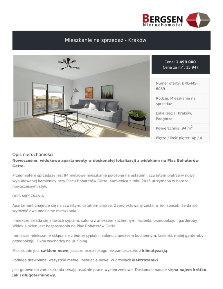 Mieszkanie na sprzedaż - Kraków Cena: 1 499 000 Cena za m2: 15 947 Numer oferty: BRG-MS6089 Rodzaj: Mieszkanie na sprzedaż Lokalizacja: Kraków, Podgórze Powierzchnia: 94 m2 Piętro / ilość pięter: 4p / 4 Opis nieruchomości Nowoczesne, widokowe apartamenty w doskonałej lokalizacji z widokiem na Plac Bohaterów Getta. Przedmiotem sprzedaży jest 94 metrowe mieszkanie położone na ostatnim, czwartym piętrze w nowo wybudowanej kamienicy przy Placu Bohaterów Getta. Kamienica z roku 2015 utrzymana w bardzo nowoczesnym stylu. OPIS MIESZKANIA Apartament znajduje się na czwartym, ostatnim piątrze. Zaprojektowany został w ten sposób, że da się wyróżnić dwa oddzielne mieszkania: – większe składa się z dwóch sypialni, salonu z aneksem kuchennym, łazienki, przedpokoju i garderoby. Widok z okien jest bezpośrednio na Plac Bohaterów Getta. -mniejsze miekszanie skłąda się z jednej sypialni, salonu z aneksem kuchennym, łasienki, małej garderoby i przedpokoju. Okna wychodzą na ul. Solną. Mieszkanie jest całkiem nowe, jeszcze przez nikogo nie zamieszkałe, z klimatyzacją. Podłoga drewniana, wszystkie meble, instalacje nowe. W drzwiach elektrozamki. Jest gotowe do zamieszkania-trwają ostatnie prace wykończeniowe. Doskonale nadaje się na najem krótko jak i długoterminowy. Obecnie w ofercie zamieszczona jest wizualizacja mieszknia. KOSZTY: 700 PLN czynsz administracyjny (w tym:zaliczki na ogrzewanie, ciepłą i zimną wodę, fundusz remontowy,utrzymanie części wspólnych, wywóz nieczystości) + prąd (według zużycia). Zapraszam do oglądania. Oferujemy BEZPŁATNĄ pomoc w uzyskaniu kredytu na zakup nieruchomości. KONTAKT: Agnieszka tel. +48 889 193 430 WIĘCEJ OFERT NA: www.bergsen.pl Kontakt w sprawie oferty Urszula Kucharska Mieszkanie na sprzedaż, Kraków, 94.00 m2, 1 499 000 ZŁ tel: +48 606 889 300 mail: [email protected] Zobacz profil