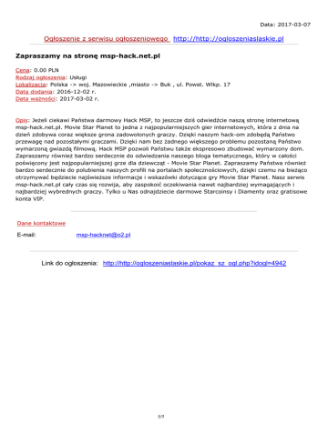 Data: 2017-03-07 Ogłoszenie z serwisu ogłoszeniowego http://http://ogloszeniaslaskie.pl Zapraszamy na stronę msp-hack.net.pl Cena: 0.00 PLN Rodzaj ogłoszenia: Usługi Lokalizacja: Polska -> woj. Mazowieckie ,miasto -> Buk , ul. Powst. Wlkp. 17 Data dodania: 2016-12-02 r. Data ważności: 2017-03-02 r. Opis: Jeżeli ciekawi Państwa darmowy Hack MSP, to jeszcze dziś odwiedźcie naszą stronę internetową msp-hack.net.pl. Movie Star Planet to jedna z najpopularniejszych gier internetowych, która z dnia na dzień zdobywa coraz większe grona zadowolonych graczy. Dzięki naszym hack-om zdobędą Państwo przewagę nad pozostałymi graczami. Dzięki nam bez żadnego większego problemu pozostaną Państwo wymarzoną gwiazdą filmową. Hack MSP pozwoli Państwu także ekspresowo zbudować wymarzony dom. Zapraszamy również bardzo serdecznie do odwiedzania naszego bloga tematycznego, który w całości poświęcony jest najpopularniejszej grze dla dziewcząt - Movie Star Planet. Zapraszamy Państwa również bardzo serdecznie do polubienia naszych profili na portalach społecznościowych, dzięki czemu na bieżąco otrzymywać będziecie najświeższe informacje i wskazówki dotyczące gry Movie Star Planet. Nasz serwis msp-hack.net.pl cały czas się rozwija, aby zaspokoić oczekiwania nawet najbardziej wymagających i najbardziej wybrednych graczy. Tylko u Nas odnajdziecie darmowe Starcoinsy i Diamenty oraz gratisowe konta VIP. Dane kontaktowe E-mail: [email protected] Link do ogłoszenia: http://http://ogloszeniaslaskie.pl/pokaz_sz_ogl.php?idogl=4942 1/1