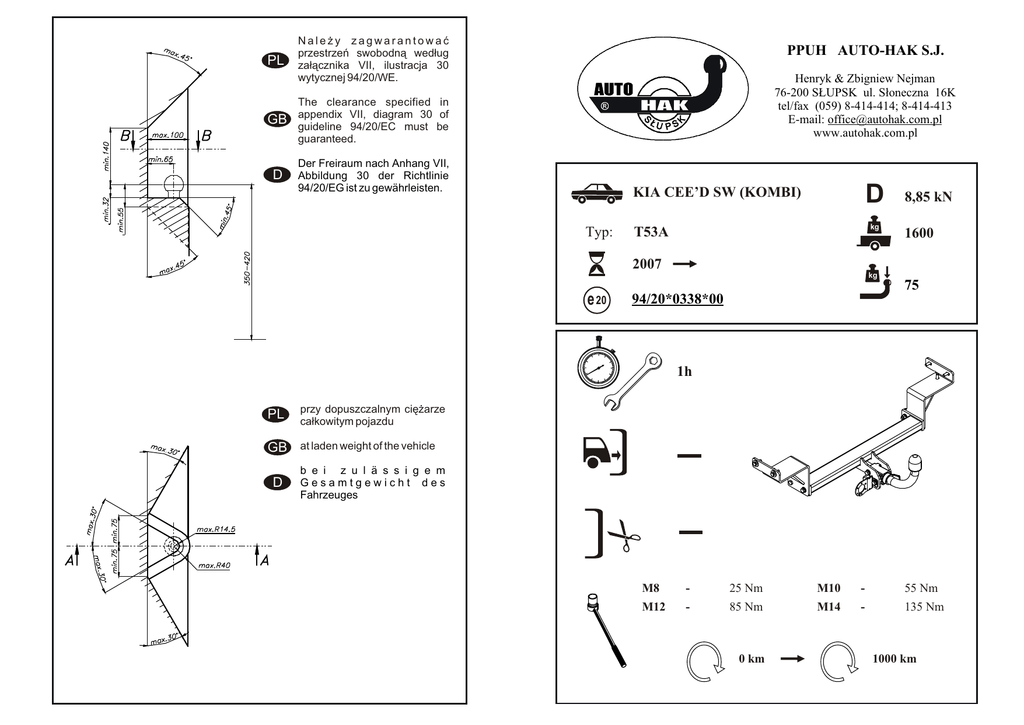 PL Nale¿y zagwarantowaæ przestrzeñ swobodn¹ wed³ug za³¹cznika VII, ilustracja 30 wytycznej 94/20/WE. GB The clearance specified in appendix VII, diagram 30 of guideline 94/20/EC must be guaranteed. D Der Freiraum nach Anhang VII, Abbildung 30 der Richtlinie 94/20/EG ist zu gewährleisten. PPUH AUTO-HAK S.J. Henryk & Zbigniew Nejman 76-200 S£UPSK ul. S³oneczna 16K tel/fax (059) 8-414-414; 8-414-413 E-mail: [email protected] www.autohak.com.pl D KIA CEE’D SW (KOMBI) Typ: kg T53A 8,85 kN 1600 2007 kg e 20 75 94/20*0338*00 1h PL przy dopuszczalnym ciê¿arze ca³kowitym pojazdu GB at laden weight of the vehicle D b e i z u l ä s s i g e m Gesamtgewicht des Fahrzeuges M8 - 25 Nm M10 - 55 Nm M12 - 85 Nm M14 - 135 Nm 0 km 1000 km PL PL OD PRODUCENTA Dziêkujemy za wybór produkowanego przez nasz¹ firmê zaczepu kulowego. Jego niezawodnoœæ zosta³a potwierdzona licznymi testami oraz opiniami zadowolonych klientów. Jednak¿e niezawodnoœæ zaczepów kulowych jest zale¿na równie¿ od prawid³owego monta¿u oraz prawid³owej eksploatacji. Z tego powodu prosimy Pañstwa o staranne przeczytanie niniejszej instrukcji monta¿u oraz przestrzeganie w³aœciwych wskazówek. Zaczep nale¿y zamontowaæ w miejscach do tego celu przeznaczonych przez producenta samochodu. GB FROM MANUFACTURER Thank you for buying our product. Their reliability has been confirmed in many tests. Reliability of towing hitch depends also on correct assembly and right operation. For this reasons we kindly ask to read carefully this instruction and apply to hints. The towing hitch should be install in points described by a car producer. D VON DEM HERSTELLER Zaczep kulowy jest skonstruowany zgodnie z zasadami bezpieczeñstwa ruchu drogowego. Zaczep kulowy jest elementem wp³ywaj¹cym na bezpieczeñstwo jazdy i mo¿e zostaæ zainstalowany wy³¹cznie przez personel wyspecjalizowany. Niedopuszczalne jest dokonywanie jakichkolwiek zmian w konstrukcji zaczepu. Powoduje to wygaœniecie dopuszczenia do stosowania. W przypadku obecnoœci masy izolacyjnej lub os³ony podwozia w miejscu przylegania zaczepu, nale¿y j¹ usun¹æ. Nieos³oniête miejsca karoserii oraz wywiercone otwory nale¿y pomalowaæ farb¹ antykorozyjn¹. Informacjami wi¹¿¹cymi odnoœnie wartoœci obci¹¿eñ s¹ dane podawane przez producenta samochodu, wzglêdnie wartoœci maksymalnej masy przyczepy oraz maksymalnego nacisku na kulê, przy czym wartoœci parametrów zaczepu kulowego nie mog¹ byæ przekroczone. Wzór do obliczania wartoœci si³y D: Maks. masa przyczepy [kg] x Maks. masa samochodu [kg] Maks. masa przyczepy [kg] + Maks. masa samochodu [kg] 9,81 x 1000 = D [kN] GB This towing hitch is designed according to rules of safety traffic regulations. The towing hitch is a safety component and can be install only by qualified personnel. Any alteration or conversion of the towing hitch is prohibited and would lead to cancellation of design certification. Remove insulating compound and underseal from vehicle (if present) in the area of the matting surfaces of the towing hitch. The vehicle manufacturer's specifications regarding trailer load and max. vertical cup load are decisive for driving whereat values for the towing hitch cannot be exceeded. D-value formula: Max trailer weight [kg] x Max vehicle weight [kg] Max trailer weight [kg] + Max vehicle weight [kg] x 9,81 1000 = D [kN] D Die Zuverlässigkeit der Anhängekupplung ist jedoch auch von der ordnungsgemäßen Montage und der richtigen Nutzung abhängig. Daher werden Sie gebeten, sorgfältig die folgende Montageanleitung zu lesen und sich an die entsprechenden Anweisungen zu beachten. Die Anhängekupplung muss an den vom Fahrzeughersteller vorgeschriebenen Befestigungsstellen montiert werden. Die Anhängekupplung erfüllt die Vorschriften der Verkehrssicherheit. Sie beeinflusst die Fahrsicherheit und daher ist ausschließlich nur vom Fachpersonal zu montieren. Es dürfen keinesfalls Konstruktionsänderungen vorgenommen werden. Sonst erlischt die Verwendungszulassung. Falls es eine Isolationsschicht oder Fahrzeugunterbodenschutz gibt, wo die Anhängerkupplung befestigt wird, so sind diese zu entfernen. Andere Karosseriestellen und gebohrte Löcher sind mit der Antikorrosionsfarbe anzustreichen. Für die Belastungswerte gelten die vom Fahrzeughersteller angegebenen Daten bzw. max. Masse der Anhänger und max. Stützlast. Dabei dürfen die Höchstkennwerte der Anhängekupplung nicht überschritten werden. D-Wert Formel: max. MasseAnhänger [kg] x Max. Fahrzeuggesamtgewicht [kg] max. MasseAnhänger [kg] + Max. Fahrzeuggesamtgewicht [kg] x 9,81 1000 = D [kN] 07 8 11 5 8 11 1 10 9 4 8 6 11 3 8 10 2 11 Item 4x M12x25mm 4x M12 4x Qty. Description Qty. 6 1 4 4 6 1 M12 Item 1 2 8 1 08 M10 M12 - 55 Nm 85 Nm 1 1 1 8 6 01 06 05 02 Rhs 4x M12x40mm 4x M12 2x M12 4x M12 3x M10x1.25x35mm 3x M10 3x ø30xø10.5x3mm 03 Lhs 3x M10x1.25x35mm 3x M10 3x ø30xø10.5x3mm 04