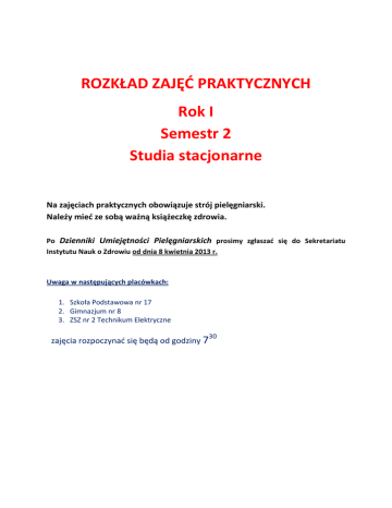 ROZKŁAD ZAJĘĆ PRAKTYCZNYCH Rok I Semestr 2 Studia stacjonarne Na zajęciach praktycznych obowiązuje strój pielęgniarski. Należy mieć ze sobą ważną książeczkę zdrowia. Po Dzienniki Umiejętności Pielęgniarskich prosimy zgłaszać się do Sekretariatu Instytutu Nauk o Zdrowiu od dnia 8 kwietnia 2013 r. Uwaga w następujących placówkach: 1. Szkoła Podstawowa nr 17 2. Gimnazjum nr 8 3. ZSZ nr 2 Technikum Elektryczne zajęcia rozpoczynać się będą od godziny 7 30 1. Data Godziny 17.04.2013 15.00 – 18.00 2. 3. 4. 5. 6. 7. 8. 9. 14.05.2013 20.05.2013 21.05.2013 22.05.2013 28.05.2013 31.05.2013 03.06.2013 04.06.2013 7.00 – 13.00 7.00 – 13.00 13.00 – 19.00 13.00 – 19.00 7.00 – 13.00 13.00 – 19.00 7.00 – 13.00 7.00 – 13.00 Placówka Cukrzycowe centrum edukacji WSZ mgr Jadwiga Zatyka Grupa Oddział płucny WSZ mgr Renata Wiśniewska A ZSZ nr 2 Technikum Elektryczne ul. Gwardii Ludowej 7 mgr Agnieszka Palusińska 10. 11. 12. 13. 05.06.2013 06.06.2013 07.06.2013 10.06.2013 13.00 – 19.00 7.00 – 13.00 7.00 – 13.00 7.00 – 13.00 1. 2. 19.04.2013 7.00 – 13.00 22.04.2013 7.00 – 13.00 Gimnazjum nr 8 Ul. Kutrzeby 2a 3. 03.06.2013 7.00 – 13.00 Zakład pielęgnacyjno – opiekuńczy Ul. Tysiąclecia 13 Oddział neurologii WSZ mgr Tomasz Michalski mgr Urszula Masiewicz mgr Maria Maruszak 4. 03.06.2013 15.00 – 18.00 5. 6. 7. 8. 04.06.2013 05.06.2013 06.06.2013 07.06.2013 13.00 – 19.00 13.00 – 19.00 7.00 – 13.00 7.00 – 13.00 Cukrzycowe centrum edukacji WSZ mgr Jadwiga Zatyka Zakład pielęgnacyjno – opiekuńczy Ul. Tysiąclecia 13 mgr Maria Maruszak 9. 10. 11. 12. 13. 10.06.2013 11.06.2013 12.06.2013 13.06.2013 14.06.2013 13.00 – 19.00 13.00 – 19.00 13.00 – 19.00 7.00 – 13.00 7.00 – 13.00 Oddział chirurgii II WSZ mgr Katarzyna Witkowska B 1. 08.05.2013 15.00 – 18.00 2. 3. 20.05.2013 7.00 – 13.00 21.05.2013 7.00 – 13.00 Cukrzycowe centrum edukacji WSZ mgr Jadwiga Zatyka ZSZ nr 2 Technikum Elektryczne ul. Gwardii Ludowej 7 mgr Agnieszka Palusińska 4. 5. 6. 7. 8. 9. 10. 11. 12. 13. 03.06.2013 04.06.2013 05.06.2013 06.06.2013 07.06.2013 10.06.2013 11.06.2013 12.06.2013 13.06.2013 14.06.2013 13.00 – 19.00 13.00 – 19.00 7.00 – 13.00 7.00 – 13.00 7.00 – 13.00 13.00 – 19.00 13.00 – 19.00 13.00 – 19.00 7.00 – 13.00 7.00 – 13.00 C Oddział chirurgii II WSZ mgr Katarzyna Witkowska Zakład pielęgnacyjno – opiekuńczy Ul. Tysiąclecia 13 mgr Maria Maruszak 1. 10.04.2013 15.00 – 18.00 2. 3. 12.04.2013 7.00 – 13.00 19.04.2013 7.00 – 13.00 4. 03.06.2013 13.00 – 19.00 Cukrzycowe centrum edukacji WSZ mgr Jadwiga Zatyka Szkoła Podstawowa nr 17 ul. Miodowa 13 a mgr Agnieszka Miszczyńska Zakład pielęgnacyjno – opiekuńczy Ul. Tysiąclecia 13 mgr Maria Maruszak 5. 6. 7. 8. 04.06.2013 05.06.2013 06.06.2013 07.06.2013 7.00 – 13.00 7.00 – 13.00 13.00 – 19.00 13.00 – 19.00 9. 10. 11. 12. 13. 10.06.2013 11.06.2013 12.06.2013 13.06.2013 14.06.2013 7.00 – 13.00 7.00 – 13.00 7.00 – 13.00 13.00 – 19.00 13.00 – 19.00 Zakład pielęgnacyjno – opiekuńczy Ul. Tysiąclecia 13 mgr Maria Maruszak Oddział chirurgii II WSZ mgr Katarzyna Witkowska D 1. 2. 16.05.2013 7.00 – 13.00 17.05.2013 7.00 – 13.00 Gimnazjum nr 8 Ul. Kutrzeby 2a mgr Urszula Masiewicz 3. 22.05.2013 15.00 – 18.00 4. 5. 6. 7. 8. 9. 10. 11. 12. 13. 03.06.2013 04.06.2013 05.06.2013 06.06.2013 07.06.2013 10.06.2013 11.06.2013 12.06.2013 13.06.2013 14.06.2013 7.00 – 13.00 7.00 – 13.00 13.00 – 19.00 13.00 – 19.00 13.00 – 19.00 7.00 – 13.00 7.00 – 13.00 7.00 – 13.00 13.00 – 19.00 13.00 – 19.00 Cukrzycowe centrum edukacji WSZ mgr Jadwiga Zatyka E Oddział płucny WSZ mgr Renata Wiśniewska Zakład pielęgnacyjno – opiekuńczy Ul. Tysiąclecia 13 mgr Maria Maruszak 1. 2. 16.05.2013 7.00 – 13.00 17.05.2013 7.00 – 13.00 3. 4. 5. 6. 7. 8. 9. 10. 11. 03.06.2013 04.06.2013 05.06.2013 06.06.2013 07.06.2013 10.06.2013 11.06.2013 12.06.2013 12.06.2013 12. 13. 13.06.2013 13.00 – 19.00 14.06.2013 13.00 – 19.00 7.00 – 13.00 7.00 – 13.00 13.00 – 19.00 13.00 – 19.00 13.00 – 19.00 7.00 – 13.00 7.00 – 13.00 7.00 – 13.00 15.00 – 18.00 Szkoła Podstawowa nr 17 ul. Miodowa 13 a mgr Agnieszka Miszczyńska Oddział chirurgii II WSZ mgr Katarzyna Witkowska Oddział płucny WSZ mgr Renata Wiśniewska Cukrzycowe centrum edukacji WSZ mgr Jadwiga Zatyka Oddział płucny WSZ mgr Renata Wiśniewska F 1. 2. 3. 23.05.2013 7.00 – 13.00 28.05.2013 7.00 – 13.00 31.05.2013 13.00 – 19.00 Zakład pielęgnacyjno – opiekuńczy Ul. Tysiąclecia 13 mgr Maria Maruszak 4. 5. 03.06.2013 7.00 – 13.00 04.06.2013 7.00 – 13.00 Gimnazjum nr 8 Ul. Kutrzeby 2a G mgr Urszula Masiewicz 6. 05.06.2013 15.00 – 18.00 7. 8. 9. 10. 11. 12. 13. 06.06.2013 07.06.2013 10.06.2013 11.06.2013 12.06.2013 13.06.2013 14.06.2013 7.00 – 13.00 7.00 – 13.00 13.00 – 19.00 13.00 – 19.00 13.00 – 19.00 7.00 – 13.00 7.00 – 13.00 1. 2. 3. 4. 5. 6. 7. 8. 11.04.2013 15.04.2013 19.04.2013 17.05.2013 28.05.2013 31.05.2013 05.06.2013 06.06.2013 13.00 – 19.00 7.00 – 13.00 7.00 – 13.00 7.00 – 13.00 7.00 – 13.00 7.00 – 13.00 7.00 – 13.00 7.00 – 13.00 Cukrzycowe centrum edukacji WSZ mgr Jadwiga Zatyka Oddział płucny WSZ mgr Renata Wiśniewska Oddział chirurgii II WSZ mgr Katarzyna Witkowska Gimnazjum nr 8 Ul. Kutrzeby 2a mgr Urszula Masiewicz 9. 10.06.2013 15.00 – 18.00 10. 11. 12. 13. 11.06.2013 12.06.2013 13.06.2013 14.06.2013 7.00 – 13.00 7.00 – 13.00 7.00 – 13.00 7.00 – 13.00 Cukrzycowe centrum edukacji WSZ mgr Jadwiga Zatyka Oddział neurologii WSZ mgr Tomasz Michalski H 1. 2. 3. 4. 5. 6. 7. 8. 9. 10. 11. 12. 13. 12.04.2013 15.04.2013 16.04.2013 19.04.2013 14.05.2013 17.05.2013 21.05.2013 24.05.2013 28.05.2013 31.05.2013 05.06.2013 06.06.2013 07.06.2013 7.00 – 13.00 7.00 – 13.00 13.00 – 19.00 7.00 – 13.00 13.00 – 19.00 7.00 – 13.00 13.00 – 19.00 7.00 – 13.00 13.00 – 19.00 7.00 – 13.00 7.00 – 13.00 7.0