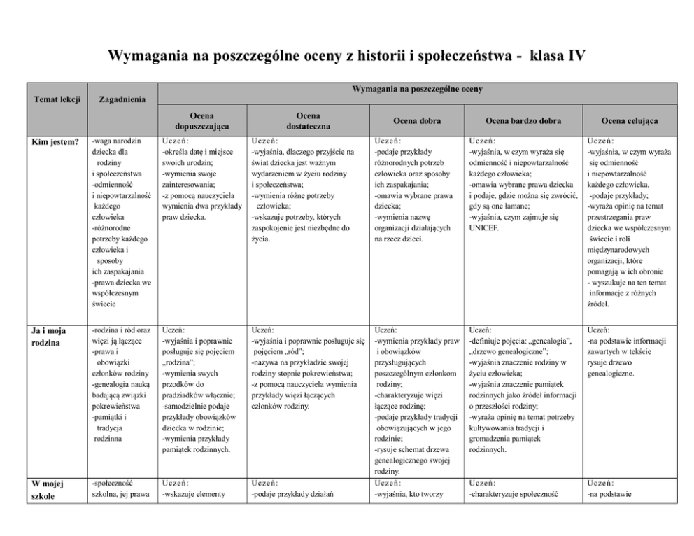 Wymagania na poszczególne oceny z historii i społeczeństwa - klasa IV Wymagania na poszczególne oceny Temat lekcji Zagadnienia Ocena dopuszczająca Ocena dostateczna Ocena dobra Ocena bardzo dobra Ocena celująca Kim jestem? -waga narodzin dziecka dla rodziny i społeczeństwa -odmienność i niepowtarzalność każdego człowieka -różnorodne potrzeby każdego człowieka i sposoby ich zaspakajania -prawa dziecka we współczesnym świecie Ucze ń : -określa datę i miejsce swoich urodzin; -wymienia swoje zainteresowania; -z pomocą nauczyciela wymienia dwa przykłady praw dziecka. Ucze ń : -wyjaśnia, dlaczego przyjście na świat dziecka jest ważnym wydarzeniem w życiu rodziny i społeczeństwa; -wymienia różne potrzeby człowieka; -wskazuje potrzeby, których zaspokojenie jest niezbędne do życia. Ucze ń : -podaje przykłady różnorodnych potrzeb człowieka oraz sposoby ich zaspakajania; -omawia wybrane prawa dziecka; -wymienia nazwę organizacji działających na rzecz dzieci. Ucze ń : -wyjaśnia, w czym wyraża się odmienność i niepowtarzalność każdego człowieka; -omawia wybrane prawa dziecka i podaje, gdzie można się zwrócić, gdy są one łamane; -wyjaśnia, czym zajmuje się UNICEF. Ucze ń : -wyjaśnia, w czym wyraża się odmienność i niepowtarzalność każdego człowieka, -podaje przykłady; -wyraża opinię na temat przestrzegania praw dziecka we współczesnym świecie i roli międzynarodowych organizacji, które pomagają w ich obronie - wyszukuje na ten temat informacje z różnych źródeł. Ja i moja rodzina -rodzina i ród oraz więzi ją łączące -prawa i obowiązki członków rodziny -genealogia nauką badającą związki pokrewieństwa -pamiątki i tradycja rodzinna Uczeń: -wyjaśnia i poprawnie posługuje się pojęciem „rodzina”; -wymienia swych przodków do pradziadków włącznie; -samodzielnie podaje przykłady obowiązków dziecka w rodzinie; -wymienia przykłady pamiątek rodzinnych. Uczeń: -wyjaśnia i poprawnie posługuje się pojęciem „ród”; -nazywa na przykładzie swojej rodziny stopnie pokrewieństwa; -z pomocą nauczyciela wymienia przykłady więzi łączących członków rodziny. Uczeń: -definiuje pojęcia: „genealogia”, „drzewo genealogiczne”; -wyjaśnia znaczenie rodziny w życiu człowieka; -wyjaśnia znaczenie pamiątek rodzinnych jako źródeł informacji o przeszłości rodziny; -wyraża opinię na temat potrzeby kultywowania tradycji i gromadzenia pamiątek rodzinnych. Uczeń: -na podstawie informacji zawartych w tekście rysuje drzewo genealogiczne. W mojej szkole -społeczność szkolna, jej prawa Ucze ń : -wskazuje elementy Ucze ń : -podaje przykłady działań Uczeń: -wymienia przykłady praw i obowiązków przysługujących poszczególnym członkom rodziny; -charakteryzuje więzi łączące rodzinę; -podaje przykłady tradycji obowiązujących w jego rodzinie; -rysuje schemat drzewa genealogicznego swojej rodziny. Ucze ń : -wyjaśnia, kto tworzy Ucze ń : -charakteryzuje społeczność Ucze ń : -na podstawie Jestem częścią społeczeństwa Moja mała ojczyzna i obowiązki -samorząd szkolny -historia i tradycja szkoły -uprzejmość, Sprawiedliwość i tolerancja jako przejawy zachowań pozytywnych -poszanowanie Godności i odmienności kolegów -konflikty międzyludzkie i sposoby ich rozwiązywania -społeczeństwo jako forma zbiorowości -grupy społeczne i zasady przynależności do nich -praca i jej rola w życiu człowieka łączące zespół klasowy (np. wiek, wspólne lekcje, wychowawca); -wymienia elementy tradycji własnej szkoły; -wskazuje uprzejmość i koleżeńskość jako zachowania konieczne dla dobrego funkcjonowania zespołu klasowego. samorządu szkolnego; -na podanych przykładach -wskazuje zachowania świadczące o poszanowaniu godności i odmienności innych; -uzasadnia konieczność przestrzegania zasad koleżeństwa i przyjaźni. społeczność szkolną; -wyjaśnia zasady funkcjonowania samorządu szkolnego; -podaje przykłady działań samorządu w swojej szkole; -podaje przykłady konfliktów między ludźmi i proponuje sposoby ich rozwiązywania. szkolną z uwzględnieniem swoich praw i obowiązków; -wyjaśnia, odwołując się do przykładów, na czym polega postępowanie sprawiedliwe ; -wyjaśnia, w czym przejawia się uprzejmość i tolerancja. samodzielnej analizy statutu szkoły przedstawia zasady funkcjonowania samorządu w swojej szkole. Ucze ń : -wymienia swoje zainteresowania; -podaje przykład grupy społecznej, do której należy; -określa na podanych przykładach pozytywne i negatywne zachowania. Ucze ń : -definiuje pojęcie „społeczeństwo”; -podaje dziedzinę wiedzy lub umiejętności, które rozwijają się pod wpływem własnych zainteresowań; -określa swoją przynależność do grup społecznych. Ucze ń : -wskazuje zainteresowania jako płaszczyznę kontaktów i wymiany doświadczeń z rówieśnikami. Ucze ń : -wskazuje, przytaczając odpowiednie argumenty, osiągnięcia współczesnej cywilizacji jako efekt pracy minionych pokoleń. -mała ojczyzna – społeczność, historia i kultura -formy upamiętniania przeszłości małej ojczyzny Ucze ń : -nazywa i pokazuje na mapie region i województwo, w którym mieszka; -wymienia przykłady zabytków architektury i przyrody swojego regionu. Ucze ń : -opisuje położenie geograficzne swojej miejscowości; -w kilku zdaniach prezentuje atrakcje turystyczne małej ojczyzny; -wymienia nazwy miejscowości w najbliższej okolicy. Ucze ń : -definiuje pojęcie „grupa społeczna”; -uzasadnia konieczność przestrzegania przyjętych norm współżycia w najbliższym otoczeniu; -opisuje różne grupy społeczne, wskazując ich role w społeczeństwie; -wyjaśnia znaczenie pracy w życiu człowieka. Ucze ń : -prezentuje swoją małą ojczyznę, uwzględniając tradycję historycznokulturową; -zbiera i prezentuje informacje o rozmaitych formach upamiętniania postaci i wydarzeń z prze