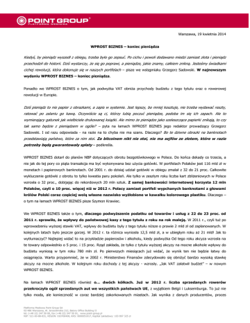 Warszawa, 19 kwietnia 2014 WPROST BIZNES – koniec pieniądza Kiedyś, by pieniądz wyszedł z obiegu, trzeba było go zepsuć. Po cichu i powoli dodawano miedzi zamiast złota i pieniądz przechodził do historii. Dziś wystarczy, że się go poprawi, a pieniądze, jakie znamy, całkiem znikną. Jesteśmy świadkami cichej rewolucji, która dokonuje się w naszych portfelach – pisze we wstępniaku Grzegorz Sadowski. W najnowszym wydaniu WPROST BIZNES – koniec pieniądza. Ponadto we WPROST BIZNES o tym, jak podwyżka VAT obniża przychody budżetu z tego tytułu oraz o rowerowej rewolucji w Europie. Dziś pieniądz to nie papier z obrazkami, a zapis w systemie. Jest lepszy, bo mniej kosztuje, nie trzeba wydawać reszty, ratować po zalaniu go kawą. Oczywiście są ci, którzy lubią poczuć pieniądze, podoba im się ich zapach. Ale to wymierający gatunek jak wielbiciele drukowanej książki. Ale mimo że pieniądze jako szeleszczące papierki znikają, to czy tak samo będzie z pieniądzem w ogóle? – pyta na łamach WPROST BIZNES jego redaktor prowadzący Grzegorz Sadowski. I od razu odpowiada - na razie na to chyba nie ma szans. Dlaczego? Bo te dziwne obrazki na banknotach przedstawiają państwo, które za nim stoi. Za bitcoinem nikt nie stoi, nie ma sejfów ze złotem, które w razie potrzeby będą gwarantowały spłaty – podkreśla. WPROST BIZNES dotarł do planów NBP dotyczących obrotu bezgotówkowego w Polsce. Do końca dekady co trzecia, a nie jak do tej pory co piąta transakcja ma być wykonywana bez użycia gotówki. W portfelach Polaków jest 116 mld zł w monetach i papierowych banknotach. Od 2001 r. do dzisiaj udział gotówki w obiegu zmalał z 32 do 21 proc. Całkowite wykluczenie gotówki z obrotu to tylko kwestia paru pokoleń. Ale tylko w zeszłym roku liczba kart zbliżeniowych w Polsce wzrosła o 32 proc., dobijając do rekordowych 20 mln sztuk. Z samej bankowości internetowej korzysta 12 mln Polaków, czyli o 10 proc. więcej niż w 2012 r. Polacy zamiast portfeli wypchanych banknotami z głowami królów Polski coraz częściej wolą własne nazwisko wyżłobione w kawałku kolorowego plastiku. Dlaczego – o tym na łamach WPROST BIZNES pisze Szymon Krawiec. We WPROST BIZNES także o tym, dlaczego podwyższenie podatku od towarów i usług z 22 do 23 proc. od 2011 r. sprawiło, że wpływy do państwowej kasy z tego tytułu z roku na rok maleją. W 2011 r., czyli tuż po wprowadzeniu wyższej stawki VAT, wpływy do budżetu były z tego tytułu niższe o prawie 2 mld zł od zaplanowanych. W kolejnych latach było jeszcze gorzej. W 2012 r. ta różnica wyniosła 12,5 mld zł, a w ubiegłym roku aż 21 mld! Jak to wytłumaczyć? Najlepiej widać to na przykładzie papierosów i alkoholu, kiedy podwyżka Od tego roku akcyza wzrosła na te towary odpowiednio o 5 proc. i 15 proc. Rząd zakłada, że tylko z tytułu wyższej akcyzy na mocne alkohole wpływy do budżetu wyniosą w tym roku 780 mln zł. Po pierwszych miesiącach już widać, że wynik ten nie będzie łatwy do osiągnięcia. Warto przypomnieć, że w 2002 r. Ministerstwo Finansów zdecydowało się obniżyć bardzo wysoką stawkę akcyzy na mocne alkohole. W kolejnym roku dochody z tej akcyzy - wzrosły. „Jak VAT załatwił budżet” – w nowym WPROST BIZNES. Na łamach WPROST BIZNES również o… dwóch kółkach. Już w 2012 r. liczba sprzedanych rowerów przekroczyła ogół sprzedanych aut we wszystkich państwach UE, z wyjątkiem Belgii i Luksemburga. To już nie tylko moda, ale konieczność w coraz bardziej zakorkowanych miastach. Jak wynika z danych producentów, proces Platforma Mediowa Point Group SA 02-486 Warszawa, Al. Jerozolimskie 212, Batory Office Building II tel. (+48 22) 347 50 00, fax (+48 22) 347 50 01, www.point-group.pl NIP: 521-00-88-831, REGON: 010768408, KRS: 0000051017, Kapitał zakładowy: 103 897 325 zł odchodzenia od samochodów przyspieszył kryzys finansowy z 2007 r. Rowerowej ofensywie, także w Polsce, towarzyszą intensywne zmiany w otoczeniu biznesowym oraz w „rowerowej nadbudowie”. W kierunku upodmiotowującym rowerzystów przepracowano prawo o ruchu drogowym, trwa wręcz rewolucja w instytucjonalnej i społecznej świadomości zdrowotnej i ekologicznej. Następują trwałe zmiany kulturowe – rower staje się jednym z najwyraźniejszych i coraz droższych atrybutów postępu. WPROST BIZNES to nowy tygodnik gospodarczy dostępny wyłącznie w formie e-wydania. Tygodnik jest dostępny w formie cyfrowej dla prenumeratorów w systemie dystrybucji e-wydań wydawcy na stronie: ewydanie.wprostbiznes.pl. Magazyn jest także dostępny u wszystkich dystrybutorów prasy cyfrowej oraz na platformach na urządzenia mobilne w formie pojedynczych wydań i prenumeraty. Czytelnicy, którzy kupują papierowe wydanie WPROST, co tydzień znajdą w nim kod dostępu do e-wydania WPROST BIZNES, którym mogą się zalogować na stronie wydawcy. Ważne linki: - e-wydanie dostępne z kodem i główna strona www www.wprostbiznes.pl - e-wydanie dostępne odpłatnie: www.ewydanie.wprostbiznes.pl Twitter: www.twitter.com/Wprostbiznes, @WprostBiznes FB: www.facebook.com/WprostBiznes LinkedIn: www.linkedin.com/company/wprost-biznes e-mail: [email protected] Wersje mobilne w aplikacji WPROST: Apple Store: https://itunes.apple.com/pl/app/wprost-kiosk/id459708380?mt=8 Google Play: https://play.google.com/store/apps/details?id=com.paperlit.android.wprost Platforma Mediowa Point Group SA 02-486 Warszawa, Al. Jerozolimskie 212, Batory Office Building II tel. (+48 22) 347 50 00, fax (+48 22) 347 50 01, www.point-group.pl NIP: 521-00-88-831, REGON: 010768408, KRS: 0000051017, Kapitał zakładowy: 103 897 325 zł