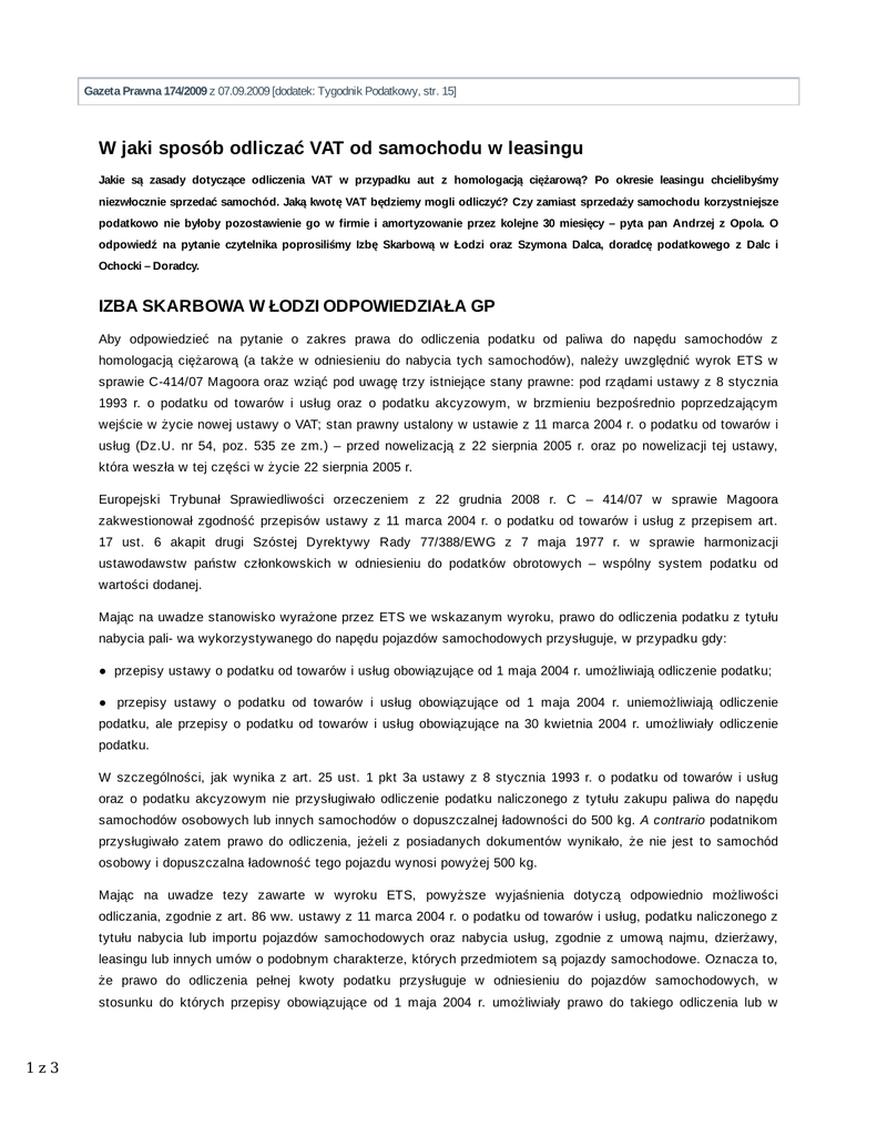 Gazeta Prawna 174/2009 z 07.09.2009 [dodatek: Tygodnik Podatkowy, str. 15] W jaki sposób odliczać VAT od samochodu w leasingu Jakie są zasady dotyczące odliczenia VAT w przypadku aut z homologacją ciężarową? Po okresie leasingu chcielibyśmy niezwłocznie sprzedać samochód. Jaką kwotę VAT będziemy mogli odliczyć? Czy zamiast sprzedaży samochodu korzystniejsze podatkowo nie byłoby pozostawienie go w firmie i amortyzowanie przez kolejne 30 miesięcy – pyta pan Andrzej z Opola. O odpowiedź na pytanie czytelnika poprosiliśmy Izbę Skarbową w Łodzi oraz Szymona Dalca, doradcę podatkowego z Dalc i Ochocki – Doradcy. IZBA SKARBOWA W ŁODZI ODPOWIEDZIAŁA GP Aby odpowiedzieć na pytanie o zakres prawa do odliczenia podatku od paliwa do napędu samochodów z homologacją ciężarową (a także w odniesieniu do nabycia tych samochodów), należy uwzględnić wyrok ETS w sprawie C-414/07 Magoora oraz wziąć pod uwagę trzy istniejące stany prawne: pod rządami ustawy z 8 stycznia 1993 r. o podatku od towarów i usług oraz o podatku akcyzowym, w brzmieniu bezpośrednio poprzedzającym wejście w życie nowej ustawy o VAT; stan prawny ustalony w ustawie z 11 marca 2004 r. o podatku od towarów i usług (Dz.U. nr 54, poz. 535 ze zm.) – przed nowelizacją z 22 sierpnia 2005 r. oraz po nowelizacji tej ustawy, która weszła w tej części w życie 22 sierpnia 2005 r. Europejski Trybunał Sprawiedliwości orzeczeniem z 22 grudnia 2008 r. C – 414/07 w sprawie Magoora zakwestionował zgodność przepisów ustawy z 11 marca 2004 r. o podatku od towarów i usług z przepisem art. 17 ust. 6 akapit drugi Szóstej Dyrektywy Rady 77/388/EWG z 7 maja 1977 r. w sprawie harmonizacji ustawodawstw państw członkowskich w odniesieniu do podatków obrotowych – wspólny system podatku od wartości dodanej. Mając na uwadze stanowisko wyrażone przez ETS we wskazanym wyroku, prawo do odliczenia podatku z tytułu nabycia pali- wa wykorzystywanego do napędu pojazdów samochodowych przysługuje, w przypadku gdy: ● przepisy ustawy o podatku od towarów i usług obowiązujące od 1 maja 2004 r. umożliwiają odliczenie podatku; ● przepisy ustawy o podatku od towarów i usług obowiązujące od 1 maja 2004 r. uniemożliwiają odliczenie podatku, ale przepisy o podatku od towarów i usług obowiązujące na 30 kwietnia 2004 r. umożliwiały odliczenie podatku. W szczególności, jak wynika z art. 25 ust. 1 pkt 3a ustawy z 8 stycznia 1993 r. o podatku od towarów i usług oraz o podatku akcyzowym nie przysługiwało odliczenie podatku naliczonego z tytułu zakupu paliwa do napędu samochodów osobowych lub innych samochodów o dopuszczalnej ładowności do 500 kg. A contrario podatnikom przysługiwało zatem prawo do odliczenia, jeżeli z posiadanych dokumentów wynikało, że nie jest to samochód osobowy i dopuszczalna ładowność tego pojazdu wynosi powyżej 500 kg. Mając na uwadze tezy zawarte w wyroku ETS, powyższe wyjaśnienia dotyczą odpowiednio możliwości odliczania, zgodnie z art. 86 ww. ustawy z 11 marca 2004 r. o podatku od towarów i usług, podatku naliczonego z tytułu nabycia lub importu pojazdów samochodowych oraz nabycia usług, zgodnie z umową najmu, dzierżawy, leasingu lub innych umów o podobnym charakterze, których przedmiotem są pojazdy samochodowe. Oznacza to, że prawo do odliczenia pełnej kwoty podatku przysługuje w odniesieniu do pojazdów samochodowych, w stosunku do których przepisy obowiązujące od 1 maja 2004 r. umożliwiały prawo do takiego odliczenia lub w 1z3 przypadku jeżeli nie umożliwiały, ale prawo takie przysługiwałoby według zasad obowiązujących 30 kwietnia 2004 r. EKSPERT WYJAŚNIA Szymon Dalc, doradca podatkowy, Dalc i Ochocki – Doradcy SZYMON DALC doradca podatkowy, Dalc i Ochocki – Doradcy Wyrok Europejskiego Trybunału Sprawiedliwości z 22 grudnia 2008 r. nr C-414/07 w sprawie spółki Magoora oraz powołujące się na niego późniejsze liczne orzeczenia sądów krajowych wydane w podobnych sprawach rozstrzygają na korzyść podatnika nie tylko prawo do odliczenia VAT zapłaconego przy zakupie paliwa do samochodów o ładowności powyżej 500 kg, ale także prawo do odliczenia całego podatku przy nabyciu takiego samochodu. Należy jednak pamiętać, że według stanu prawnego obowiązującego na dzień poprzedzający przystąpienie Polski do Unii Europejskiej prawo do odliczenia całości VAT przysługiwało tylko wobec (innych niż osobowe) samochodów o ładowności powyżej 500 kg, pod warunkiem że wydana była dla nich homologacja wymagana dla tego rodzaju samochodów. Homologacja ta zwana popularnie homologacją ciężarową wydawana była na wniosek producenta lub importera i dotyczyła nie tyle konkretnego samochodu, co typu (rodzaju) pojazdu. Jeżeli użytkowany przez czytelnika samochód spełnia powyższe warunki, możliwe będzie odliczenie całości VAT przy wykupie samochodu po zakończeniu umowy leasingu. W takim przypadku sprzedaż samochodu podlegać będzie opodatkowaniu niezależnie od terminu, w jakim nastąpi. Niestety, nie wszystkie urzędy skarbowe podzielają taki pogląd i dlatego wskazane byłoby wystąpienie o indywidualną interpretację. To, czy przy zakupie podatnik miał prawo – zdaniem rozliczającego go urzędu skarbowego – do pełnego odliczenia podatku, ma w tym przypadku istotne znaczenie na przebieg transakcji z uwagi na brzmienie art. 43 ust. 1 pkt 2 oraz ust. 2 ustawy o podatku od towarów i usług. 1 stycznia 2009 r. ustawodawca wprowadził zmiany dotyczące definicji towarów używanych oraz ich opodatkowania w przypadku dostawy. Dostawa towarów używanych jest zwolniona z opodatkowania, pod 2z3 warunkiem że w stosunku do tych towarów nie przysługiwało dokonującemu ich dostawy prawo do obniżenia kwoty podatku należnego o kwotę podatku naliczonego. Przez towary używane rozumie się ruchomości, których okres używania przez podatnika dokonującego ich dostawy w