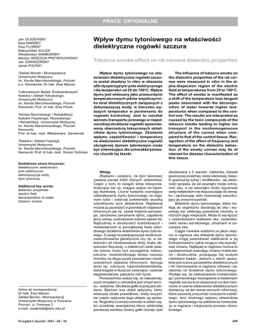 PRACE ORYGINALNE Jan OLSZEWSKI1 Ewa MARZEC1 Ewa FLOREK2 Maksymilian KULZA2 W³odzimierz SAMBORSKI3 Monika SEÑCZUK-PRZYBY£OWSKA2 Jan ZAWADZIÑSKI1 Jacek PI¥TEK4 Zak³ad Bioniki i Bioimpedancji, Uniwersytet Medyczny im. Karola Marcinkowskiego, Poznañ p.o. Kierownika: Dr hab. Ewa Marzec 1 Laboratorium Badañ rodowiskowych, Katedra i Zak³ad Toksykologii, Uniwersytet Medyczny im. Karola Marcinkowskiego, Poznañ Kierownik: Prof. dr hab. Ewa Florek 2 Klinika Reumatologii i Rehabilitacji, Katedra Fizjoterapii, Reumatologii i Rehabilitacji, Uniwersytet Medyczny im. Karola Marcinkowskiego, Poznañ Kierownik: Prof. dr hab. med. W³odzimierz Samborski 3 Katedra i Zak³ad Fizjologii, Uniwersytet Medyczny im. Karola Marcinkowskiego, Poznañ Kierownik: Prof. dr hab. med. Teresa Torliñska 4 Dodatkowe s³owa kluczowe: dielektryczne w³aciwoci pole elektryczne dekompozycja wody dym tytoniowy Additional key words: dielectric properties electric field decomposition of water tobacco smoke Adres do korespondencji: Dr hab. Ewa Marzec Zak³ad Bioniki i Bioimpedancji Uniwersytet Medyczny w Poznaniu Poznañ, ul. Parkowa 2 e-mail: [email protected] Przegl¹d Lekarski 2011 / 68 / 10 Wp³yw dymu tytoniowego na w³aciwoci dielektryczne rogówki szczura Tobacco smoke effect on rat corneal dielectric properties Wp³yw dymu tytoniowego na w³aciwoci dielektryczne rogówki szczura zosta³ zbadany in vitro w obszarze alfa-dyspersyjnym pola elektrycznego i dla temperatur od 25 do 150oC. Wp³yw dymu jest widoczny jako przesuniêcie temperaturowych pików wspó³czynnika strat dielektrycznych zwi¹zanych z dekompozycj¹ wody, w kierunku wy¿szych temperatur w porównaniu do rogówki kontrolnej. Jest to rezultat wzrostu transportu jonowego w niejednorodnej strukturze rogówki spowodowany obecnoci¹ toksycznych sk³adników dymu tytoniowego. Zbadanie wp³ywu czêstotliwoci i temperatury na w³aciwoci dielektryczne rogówki obci¹¿onej dymem tytoniowym mo¿e byæ interesuj¹ce dla scharakteryzowania chorób tej tkanki. The influence of tobacco smoke on the dielectric properties of the rat cornea were measured in vitro in the alpha-dispersion region of the electric field at temperatures from 25 to 150oC. The effect of smoke is manifested as a shift of the temperature loss tangent peaks associated with the decomposition of water towards higher temperatures when compared to the control one. The results are interpreted as caused by the toxic compounds of the tobacco smoke leading to higher ion transport in the nonhomogeneous structure of the cornea when compared to that of the control tissue. Recognition of the effect of frequency and temperature on the dielectric behaviour of the smoky cornea may be of interest for disease characterization of this tissue. Wstêp Zbadano i ustalono, ¿e dym tytoniowy zawiera ponad 4300 ró¿nych sk³adników. Czêæ z nich, to zwi¹zki silnie toksyczne, dra¿ni¹ce lub np. maj¹ce wp³yw na hipoksjê tkankow¹. Liczne badania oceniaj¹ce oddzia³ywanie dymu tytoniowego na organizm ludzi i zwierz¹t potwierdzi³y wysok¹ szkodliwoæ tych sk³adników. Naj³atwiej mo¿na j¹ zauwa¿yæ w powsta³ych objawach klinicznych jak np. zawa³ miênia sercowego, zarostowe zamykanie têtnic, zapalenie jamy ustnej, uszkodzenie szkliwa zêbów itd. Najtrudniej w strukturach komórkowych i molekularnych w pocz¹tkowej fazie szkodliwego dzia³ania sk³adników dymu tytoniowego. Z uwagi na predyspozycje osobnicze, uwarunkowania genetyczne czy np. w zale¿noci od niestosowania diety, braku aktywnoci fizycznej, u niektórych osób palenie tytoniu mo¿e byæ szczególnie niebezpieczne, zwielokrotniaj¹c tempo rozwoju choroby na d³ugo przed powstaniem nieodwracalnych objawów klinicznych. Sprzyja temu np. cukrzyca, hipercholesterolemia, dieta bogata w t³uszcze zwierzêce, nadmiar wêglowodanów, pasywny tryb ¿ycia. Powszechnie uwa¿a siê, ¿e najwa¿niejszym zmys³em u cz³owieka jest zmys³ wzroku - widzenie. Struktura ga³ki ocznej jest z³o¿ona. Stanowi ona uk³ad optyczny, który wówczas dzia³a prawid³owo, kiedy wszystkie czêci optyczne tego uk³adu s¹ sprawne. Rogówka (cornea) wchodzi w sk³ad czêci przedniej zewnêtrznej b³ony w³óknistej pierwszej warstwy ciany ga³ki ocznej i jest zbudowana z 5 warstw: nab³onka, blaszki granicznej przedniej, istoty w³aciwej, blaszki granicznej tylnej i ródb³onka. Jej z³o¿onoæ sprawia, ¿e od zewn¹trz mo¿e ochraniaæ oko, a od wewn¹trz mo¿e regulowaæ swój metabolizm nie dopuszczaj¹c do obrzêku i zachowuj¹c stan równowagi warunkuj¹cy jej przezroczystoæ. Sk³adniki dymu tytoniowego, które trafiaj¹ do organizmu docieraj¹ do oka i wywo³uj¹ lub u³atwiaj¹ powstanie choroby w ró¿nych jego miejscach. Mo¿e to siê ³¹czyæ z uszkodzeniem siatkówki oka, uszkodzeniem nerwu wzrokowego, zmianami w soczewce oka. Ci¹gle niewiele wiadomo w jakim stopniu w rogówce oka sk³adniki dymu tytoniowego mog¹ powodowaæ zak³ócenia w jej funkcjonowaniu i jakie mog¹ w niej wywo³ywaæ zmiany. Najlepiej w rogówce mo¿na to zaobserwowaæ oceniaj¹c zmiany molekularne i strukturalne, pos³uguj¹c siê czu³ymi metodami badañ. Jednym z takich sposobów jest ocena parametrów dielektrycznych i ich ró¿nicowanie w rogówce zdrowej i nara¿onej na dzia³anie dymu tytoniowego. Wydaje siê, ¿e zastosowanie nowatorskiego i pionierskiego rozwi¹zania w badaniach rogówki szczura po ekspozycji na dym tytoniowy w ocenie w³aciwoci dielektrycznych dostarczy na ten temat cennych informacji, które pozwol¹ zrozumieæ znaczenie subtelnego, lecz istotnego wp³ywu sk³adników dymu tytoniowego na zak³ócenia homeostazy w rogówce i inicjowanie procesu chorobowego. 699 powiednio dla 2 i 60kHz s¹ podobne dla rogówek z obu badanych grup. Rycina 1 Temperaturowe zale¿noci wspó³czynnika strat dielektrycznych dla rogówki pobranej od zwierz¹t z grupy kontrolnej (D2kHz, p60kHz) i z grupy po ekspozycji na dym tytoniowy (O2kHz, ● 60kHz). Temperature dependencies o
