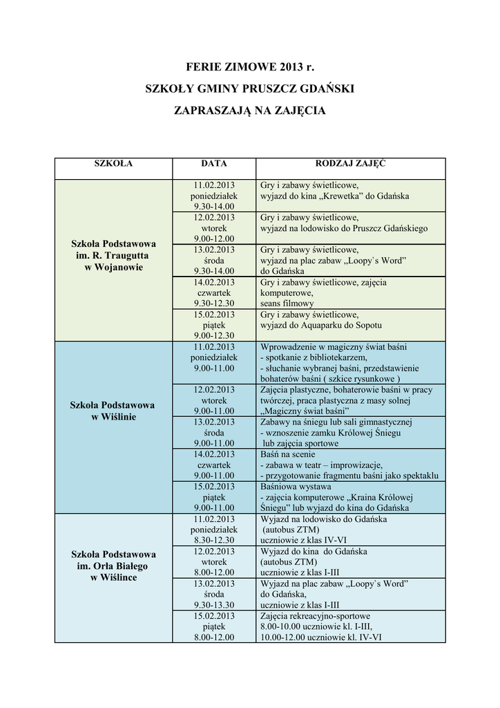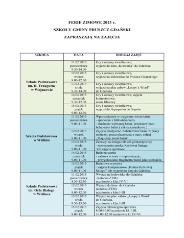 FERIE ZIMOWE 2013 r. SZKOŁY GMINY PRUSZCZ GDAŃSKI ZAPRASZAJĄ NA ZAJĘCIA SZKOŁA Szkoła Podstawowa im. R. Traugutta w Wojanowie Szkoła Podstawowa w Wiślinie Szkoła Podstawowa im. Orła Białego w Wiślince DATA 11.02.2013 poniedziałek 9.30-14.00 12.02.2013 wtorek 9.00-12.00 13.02.2013 środa 9.30-14.00 14.02.2013 czwartek 9.30-12.30 15.02.2013 piątek 9.00-12.30 11.02.2013 poniedziałek 9.00-11.00 12.02.2013 wtorek 9.00-11.00 13.02.2013 środa 9.00-11.00 14.02.2013 czwartek 9.00-11.00 15.02.2013 piątek 9.00-11.00 11.02.2013 poniedziałek 8.30-12.30 12.02.2013 wtorek 8.00-12.00 13.02.2013 środa 9.30-13.30 15.02.2013 piątek 8.00-12.00 RODZAJ ZAJĘĆ Gry i zabawy świetlicowe, wyjazd do kina „Krewetka” do Gdańska Gry i zabawy świetlicowe, wyjazd na lodowisko do Pruszcz Gdańskiego Gry i zabawy świetlicowe, wyjazd na plac zabaw „Loopy`s Word” do Gdańska Gry i zabawy świetlicowe, zajęcia komputerowe, seans filmowy Gry i zabawy świetlicowe, wyjazd do Aquaparku do Sopotu Wprowadzenie w magiczny świat baśni - spotkanie z bibliotekarzem, - słuchanie wybranej baśni, przedstawienie bohaterów baśni ( szkice rysunkowe ) Zajęcia plastyczne, bohaterowie baśni w pracy twórczej, praca plastyczna z masy solnej „Magiczny świat baśni” Zabawy na śniegu lub sali gimnastycznej - wznoszenie zamku Królowej Śniegu lub zajęcia sportowe Baśń na scenie - zabawa w teatr – improwizacje, - przygotowanie fragmentu baśni jako spektaklu Baśniowa wystawa - zajęcia komputerowe „Kraina Królowej Śniegu” lub wyjazd do kina do Gdańska Wyjazd na lodowisko do Gdańska (autobus ZTM) uczniowie z klas IV-VI Wyjazd do kina do Gdańska (autobus ZTM) uczniowie z klas I-III Wyjazd na plac zabaw „Loopy`s Word” do Gdańska, uczniowie z klas I-III Zajęcia rekreacyjno-sportowe 8.00-10.00 uczniowie kl. I-III, 10.00-12.00 uczniowie kl. IV-VI 11.02.2013 poniedziałek 9.00-13.00 12.02.2013 wtorek 9.00-13.00 Zespół Szkół w Łegowie 13.02.2013 środa 9.00-13.00 Ferie na sportowo 14.02.2013 czwartek 9.00-13.00 15.02.2013 piątek 9.00-13.00 Zespół Szkół im. Karola Wojtyły w Rotmance 11.02.2013 poniedziałek 10.30-15.30 12.02.2013 wtorek 10.30-14.30 13.02.2013 środa 10.30-14.30 14.02.2013 czwartek 10.30-14.00 15.02.2013 piątek 10.30-15.30 11.02.-15.02.2013 poniedziałek – piątek 9.00-13.00 Turniej tenisa stołowego chłopcy: 9.00-11.00 uczniowie szkoły podstawowej, 11.00-13.00 uczniowie gimnazjum Turniej piłki ręcznej chłopcy: 9.00-11.00 uczniowie gimnazjum, 11.00-13.00 uczniowie szkoły podstawowej Turniej piłki ręcznej dziewczęta: 9.00-11.00 uczniowie gimnazjum, 11.00-13.00 uczniowie szkoły podstawowej Ścianka wspinaczkowa: 9.00-11.00 uczniowie szkoły podstawowej, 11.00-13.00 uczniowie gimnazjum Gry i zabawy rekreacyjne: 9.00-11.00 uczniowie szkoły podstawowej, Turniej piłki koszykowej: 11.00-13.00 uczniowie szkoły podstawowej, Turniej piłki koszykowej chłopcy: 9.00-11.00 uczniowie gimnazjum, Turniej piłki siatkowej chłopcy: 11.00-13.00 uczniowie gimnazjum Turniej tenisa stołowego dziewczęta: 9.00-11.00 uczniowie szkoły podstawowej, 11.00-13.00 uczniowie gimnazjum Turniej piłki siatkowej dziewczęta: 9.00-11.00 uczniowie gimnazjum, 11.00-13.00 uczniowie szkoły podstawowej Turniej piłki nożnej: 9.00-11.00 uczniowie szkoły podstawowej, 11.00-13.00 uczniowie gimnazjum Turniej unihokeja: 9.00-11.00 uczniowie szkoły podstawowej, 11.00-13.00 uczniowie gimnazjum Wyjazd do Aquaparku do Sopotu koszt 25 zł Wyjazd na plac zabaw „Loopy`s Word” do Gdańska koszt 20 zł Wyjazd do Trzepowa. Zjazdy na „oponach” koszt 28 zł Wyjazd na kulig z ogniskiem i kiełbaskami koszt 15 zł Wyjazd do EDUPARKU do Gdańska koszt 25 zł Zajęcia świetlicowe, zajęcia sportowe na hali sportowej Zespół Szkół w Straszynie Publiczne Gimnazjum im. prof. E. Kwiatkowskiego Szkoła Podstawowa Im. J. Brzechwy w Borkowie 11.02.2013 poniedziałek 9.00-12.00 12.02.2013 wtorek 9.00-12.00 13.02.2013 środa 9.00-12.00 14.02.2013 czwartek 9.00-12.00 15.02.2013 piątek 9.00-12.00 11.02.2013 poniedziałek 9.00-14.00 12.02.2013 wtorek 9.00-12.00 13.02.2013 środa 9.00-12.00 14.02.2013 czwartek 9.00-12.00 15.02.2013 piątek 9.00-12.00 x Organizatorami zajęć są dyrektorzy szkół. Szczegółowe informacje w sekretariatach szkół Sporządziła: Bożena Chodkowska Gry i zabawy sportowe na hali sportowej, Zajęcia plastyczno-techniczne Gry i zabawy na boisku szkolnym, Zespołowe gry stolikowe - ćwiczymy umysł ( szachy, warcaby itp.) Wyjazd do kina „Krewetka” do Gdańska Bawimy się przy muzyce, wykonanie gazetki ściennej przez uczniów nt. Jak spędziliśmy ferie w szkole?” Wyjazd na kręgle do kręgielni U7 w Gdańsku Warsztaty animacji Zajęcia plastyczne Zajęcia sportowe Zajęcia „Z logiką na ty” Zajęcia komputerowe Zajęcia w czasie ferii nie odbędą się z uwagi konieczność prowadzenia prac budowlanych w związku rozbudową budynku szkoły.