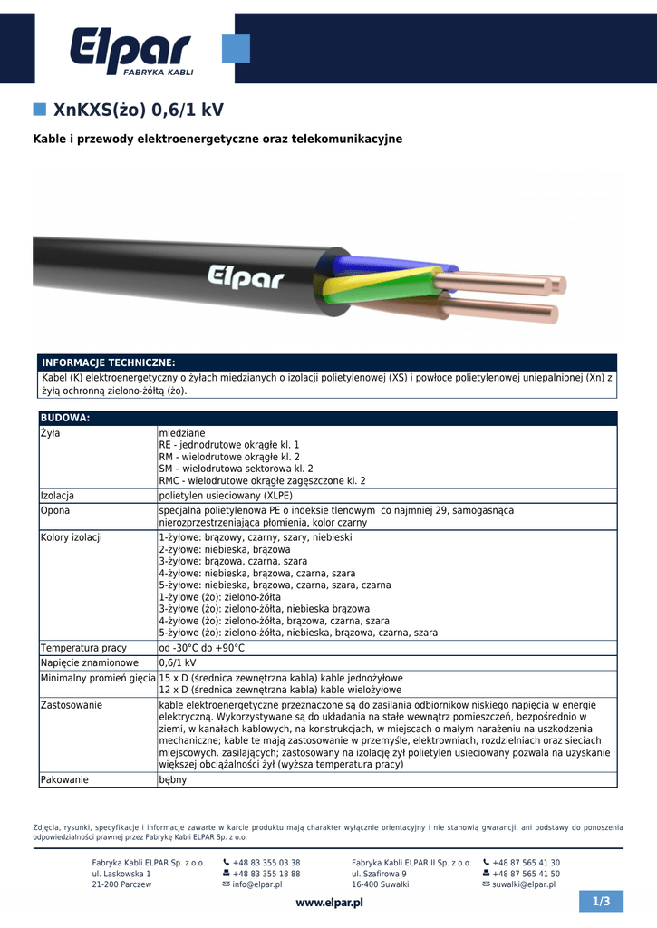 XnKXS(żo) 0,6/1 kV Kable i przewody elektroenergetyczne oraz telekomunikacyjne INFORMACJE TECHNICZNE: Kabel (K) elektroenergetyczny o żyłach miedzianych o izolacji polietylenowej (XS) i powłoce polietylenowej uniepalnionej (Xn) z żyłą ochronną zielono-żółtą (żo). BUDOWA: Żyła miedziane RE - jednodrutowe okrągłe kl. 1 RM - wielodrutowe okrągłe kl. 2 SM – wielodrutowa sektorowa kl. 2 RMC - wielodrutowe okrągłe zagęszczone kl. 2 Izolacja polietylen usieciowany (XLPE) Opona specjalna polietylenowa PE o indeksie tlenowym co najmniej 29, samogasnąca nierozprzestrzeniająca płomienia, kolor czarny Kolory izolacji 1-żyłowe: brązowy, czarny, szary, niebieski 2-żyłowe: niebieska, brązowa 3-żyłowe: brązowa, czarna, szara 4-żyłowe: niebieska, brązowa, czarna, szara 5-żyłowe: niebieska, brązowa, czarna, szara, czarna 1-żylowe (żo): zielono-żółta 3-żyłowe (żo): zielono-żółta, niebieska brązowa 4-żyłowe (żo): zielono-żółta, brązowa, czarna, szara 5-żyłowe (żo): zielono-żółta, niebieska, brązowa, czarna, szara Temperatura pracy od -30°C do +90°C Napięcie znamionowe 0,6/1 kV Minimalny promień gięcia 15 x D (średnica zewnętrzna kabla) kable jednożyłowe 12 x D (średnica zewnętrzna kabla) kable wielożyłowe Zastosowanie kable elektroenergetyczne przeznaczone są do zasilania odbiorników niskiego napięcia w energię elektryczną. Wykorzystywane są do układania na stałe wewnątrz pomieszczeń, bezpośrednio w ziemi, w kanałach kablowych, na konstrukcjach, w miejscach o małym narażeniu na uszkodzenia mechaniczne; kable te mają zastosowanie w przemyśle, elektrowniach, rozdzielniach oraz sieciach miejscowych. zasilających; zastosowany na izolację żył polietylen usieciowany pozwala na uzyskanie większej obciążalności żył (wyższa temperatura pracy) Pakowanie bębny Zdjęcia, rysunki, specyfikacje i informacje zawarte w karcie produktu mają charakter wyłącznie orientacyjny i nie stanowią gwarancji, ani podstawy do ponoszenia odpowiedzialności prawnej przez Fabrykę Kabli ELPAR Sp. z o.o. Fabryka Kabli ELPAR Sp. z o.o. ul. Laskowska 1 21-200 Parczew +48 83 355 03 38 +48 83 355 18 88 [email protected] Fabryka Kabli ELPAR II Sp. z o.o. ul. Szafirowa 9 16-400 Suwałki +48 87 565 41 30 +48 87 565 41 50 [email protected] 1/3 XnKXS(żo) 0,6/1 kV Liczba i przekrój znamionowy żył [n x mm2] Przybliżona średnica zewnętrzna kabla [mm] Orientacyjna masa kabla [kg/km] 1 x 1 RE 5,2 36 1 x 1,5 RE 5,4 42 1 x 2,5 RE 5,8 52 1 x 4 RE 6,6 72 1 x 6 RE 7,1 92 1 x 10 RE 8,0 130 1 x 16 RE 8,8 182 1 x 16 RMC 9,6 194 1 x 25 RMC 10,9 279 1 x 35 RMC 12,0 368 1 x 50 RMC 13,5 486 1 x 70 RMC 14,9 648 1 x 95 RMC 17,1 896 1 x 120 RMC 18,5 1107 1 x 150 RMC 20,6 1370 1 x 185 RMC 22,7 1683 1 x 240 RMC 25,6 2164 1 x 300 RMC 28,1 2674 1 x 400 RMC 32,2 3494 1 x 500 RMC 34,6 4403 1 x 630 RMC 40,4 5533 2 x 1 RE 8,4 90 2 x 1,5 RE 8,9 104 2 x 2,5 RE 9,6 130 2 x 4 RE 11,2 186 2 x 6 RE 12,2 235 2 x 10 RE 14,0 336 2 x 16 RE 17,1 552 2 x 25 RMC 21,4 866 2 x 35 RMC 23,9 1135 2 x 50 RMC 27,1 1491 3 x 1 RE 9,0 112 3 x 1,5 RE 9,5 131 3 x2,5 RE 10,3 166 3 x 4 RE 12,2 243 3 x 6 RE 13,1 308 3 x 10 RE 14,8 421 3 x 16 RE 18,3 688 3 x 25 RMC 22,7 1067 3 x 35,RMC 25,0 1384 3 x 50 RMC 28,8 1864 3 x 70 RMC 32,1 2454 3 x 95 RMC 36,8 3209 3 x 120 RMC 40,1 4131 3 x 150 RMC 45,1 5168 Zdjęcia, rysunki, specyfikacje i informacje zawarte w karcie produktu mają charakter wyłącznie orientacyjny i nie stanowią gwarancji, ani podstawy do ponoszenia odpowiedzialności prawnej przez Fabrykę Kabli ELPAR Sp. z o.o. Fabryka Kabli ELPAR Sp. z o.o. ul. Laskowska 1 21-200 Parczew +48 83 355 03 38 +48 83 355 18 88 [email protected] Fabryka Kabli ELPAR II Sp. z o.o. ul. Szafirowa 9 16-400 Suwałki +48 87 565 41 30 +48 87 565 41 50 [email protected] 2/3 3 x 185 RMC 49,4 6311 3 x 240 RMC 55,8 8108 4 x 1 RE 9,8 132 4 x 1,5 RE 10,3 156 4 x2,5 RE 11,2 200 4 x 4 RE 13,2 292 4 x 6 RE 14,3 377 4 x 10 RE 16,2 527 4 x 16 RE 19,7 840 4 x 25 RMC 24,9 1325 4 x 35 RMC 27,6 1741 4 x 50 SM 26,5 2219 4 x 70 SM 30,0 2836 4 x 95 SM 35,2 3607 4 x 120 SM 40,0 4484 4 x 150 SM 42,7 5555 4 x 185 SM 47,4 6775 4 x 240 SM 53,9 8863 5 x 1 RE 10,5 155 5 x 1,5 RE 11,1 184 5 x2,5 RE 12,0 238 5 x 4 RE 14,3 350 5 x 6 RE 15,6 456 5 x 10 RE 18,5 691 5 x 16 RE 20,9 982 5 x 25 RMC 27,4 1611 5 x 35 RMC 30,8 2155 5 x 50 RMC 35,0 2859 5 x 70 RMC 39,2 3804 5 x 95 RMC 45,4 5272 5 x 120 RMC 49,2 6459 5 x 150 RMC 55,3 8069 5 x 185 RMC 61,1 9911 Zdjęcia, rysunki, specyfikacje i informacje zawarte w karcie produktu mają charakter wyłącznie orientacyjny i nie stanowią gwarancji, ani podstawy do ponoszenia odpowiedzialności prawnej przez Fabrykę Kabli ELPAR Sp. z o.o. Fabryka Kabli ELPAR Sp. z o.o. ul. Laskowska 1 21-200 Parczew +48 83 355 03 38 +48 83 355 18 88 [email protected] Fabryka Kabli ELPAR II Sp. z o.o. ul. Szafirowa 9 16-400 Suwałki +48 87 565 41 30 +48 87 565 41 50 [email protected] 3/3