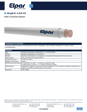 NLgN-K 3,6/6 kV Kable i przewody kolejowe INFORMACJE TECHNICZNE: Przewody elektroenergetyczne jednożyłowe do taboru kolejowego z żyłami giętkimi miedzianymi o izolacji i oponie bezhalogenowej. BUDOWA: Żyły miedziane ocynowane, wielodrutowe kl. 5, wg IEC 60228 Izolacja specjalna bezhalogenowa usieciowana Powłoka specjalna bezhalogenowa, samogasnąca nierozprzestrzeniająca płomienia, kolor szary Kolory izolacji szara, inne kolory na życzenie klienta Temperatura pracy od -40°C do +90°C Napięcie znamionowe 3,6/6 kV Minimalny promień gięcia do instalowania na stałe – 3 x średnica zewnętrzna kabla do odbiorników ruchomych – 5 x średnica zewnętrzna kabla Zastosowanie przewody do układania w szynowym taborze kolejowym, w tym również w miejscach narażonych na działanie warunków atmosferycznych oraz smarów Pakowanie krążki, bębny Zdjęcia, rysunki, specyfikacje i informacje zawarte w karcie produktu mają charakter wyłącznie orientacyjny i nie stanowią gwarancji, ani podstawy do ponoszenia odpowiedzialności prawnej przez Fabrykę Kabli ELPAR Sp. z o.o. Fabryka Kabli ELPAR Sp. z o.o. ul. Laskowska 1 21-200 Parczew +48 83 355 03 38 +48 83 355 18 88 [email protected] Fabryka Kabli ELPAR II Sp. z o.o. ul. Szafirowa 9 16-400 Suwałki +48 87 565 41 30 +48 87 565 41 50 [email protected] 1/2 NLgN-K 3,6/6 kV Liczba i przekrój znamionowy żył (n x mm²) Przybliżona średnica zewnętrzna przewodu (mm) Orientacyjna masa przewodu (kg/km) 1 x 1,5 5,8 51 1 x 2,5 6,3 66 1x4 7,2 93 1x6 8,3 118 1 x 10 9,8 172 1 x 16 11,3 237 1 x 25 13,4 340 1 x 35 14,2 433 1 x 50 15,2 596 1 x 70 18,2 802 1 x 95 21,1 1018 1 x 120 22,5 1270 1 x 150 25,9 1545 1 x 185 27,4 1879 1 x 240 28,9 2497 Zdjęcia, rysunki, specyfikacje i informacje zawarte w karcie produktu mają charakter wyłącznie orientacyjny i nie stanowią gwarancji, ani podstawy do ponoszenia odpowiedzialności prawnej przez Fabrykę Kabli ELPAR Sp. z o.o. Fabryka Kabli ELPAR Sp. z o.o. ul. Laskowska 1 21-200 Parczew +48 83 355 03 38 +48 83 355 18 88 [email protected] Fabryka Kabli ELPAR II Sp. z o.o. ul. Szafirowa 9 16-400 Suwałki +48 87 565 41 30 +48 87 565 41 50 [email protected] 2/2