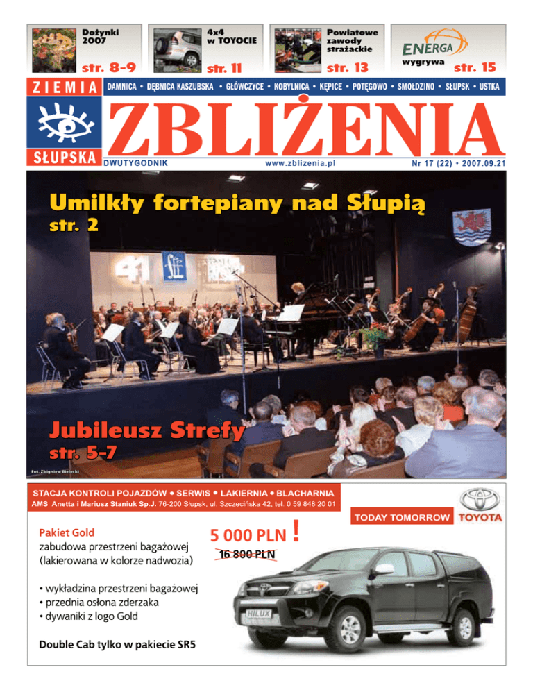 Dożynki 2007 4x4 w TOYOCIE Powiatowe zawody strażackie str. 8-9 str. 11 str. 13 DWUTYGODNIK www.zblizenia.pl wygrywa Nr 17 (22) • 2007.09.21 Umilkły fortepiany nad Słupią str. 2 Jubileusz Strefy str. 5-7 Fot. Zbigniew Bielecki str. 15 AKTUALNOŚCI JERZY RAUBE KOMENTARZ Wojna na Bałtyku - Od dorsza tylko g... gorsze – mawiały gospodynie domowe w czasach komuny. Bo to było najtańsze drugie danie obiadowe w tamtych czasach. Teraz dorsz wyraźnie przebija tradycyjnego schaboszczaka. Porcja tej rybychwastu – jak mawiają starzy rybacy – w usteckiej smażalni kosztuje dwie-trzy „dychy”. Trudno liczyć na obniżkę cen zważywszy, że Komisja Europejska wprowadziła na wschodnim Bałtyku całkowity zakaz połowu dorsza. I tak ma być do końca tego roku. Co prawda minister Gospodarki Morskiej Marek Gróbarczyk próbował przekonywać w Brukseli unijnych decydentów do zmiany decyzji, ale niewiele wskórał. Urzędnicy wprowadzili zakaz, bowiem uważają, że polscy rybacy, już w pierwszej połowie roku przekroczyli roczny limit na połów dorsza. Rybacy odpierają zarzuty i twierdzą, że to dane sfałszowane. Łowią na podobnym poziomie jak ich koledzy z Zachodu. Tyle, że tamci są pod specjalnym parasolem Unii – komentują gorzko. Polak średnio zjada 6 kg ryby rocznie, średnio na zachodzie „na twarz” wychodzi ponad 20 kg. I te proporcje będą, niestety, rosły. Niewiele bowiem pomogło poparcie byłego ministra Rafała Wiecheckiego, którego wciągnął w niebyt wir politycznego zamieszania. Jego następca próbuje coś zmienić, ale wygląda na to, że na próbach się skończy. Komisarze unijni są nieugięci. Jak dosadnie, ale trafnie skomentował jeden z młodych rybaków w Ustce: – Unia przypomina taką cnotkę-niewydymkę, która gra wyłącznie tylko na pokaz. Udaje, że to nie ona się źle prowadzi, tylko my. Nie nasza wina, że spadła populacja dorsza. To wina wszystkich łowiących. Tylko dlaczego my mamy ponieść konsekwencje, a Duńczycy, Niemcy, Szwedzi nadal będą łowić i nam sprzedawać. – pytał gorzko. Podobno jest już ciche przyzwolenie na prowadzenie połowów w czasie zakazu. Oficjalnie nikt nic nie wie. Z kolei unijni komisarze straszą. Jeśli polscy rybacy będą łowić, to zakaz będzie przedłużany o kolejne lata. Dodatkowo Polska zapłaci grzywnę, bagatela, kilkadziesiąt milionów euro. I taka może być cena za wojnę na Bałtyku. 21 września 2007 UMILKŁY FORTEPIANY Po raz 41 Słupsk rozbrzmiewał dźwiękami fortepianu. Festiwal Pianistyki Polskiej już na stałe wpisał się w kalendarz imprez kulturalnych. W tym roku wystąpiło kilkunastu artystów, wśród nich takie sławy jak prof. Andrzej Jasiński, Krzysztof Jabłoński, czy Kevin Kenner. Następny festiwal – za rok! Orkiestra Symfoniczna Filharmonii Gdańskiej pod batutą Michała Nesterowicza 41. Festiwal Pianistyki Polskiej w Słupsku trwał od 8 do 14 września. Zainaugurowany został w Sali Filharmonii i Teatru koncertem symfonicznym Pawła Kowalskiego i Krzysztofa Jabłońskiego z Orkiestrą Polskiej Filharmonii „Sinfonia Baltica” ze Słupska pod batutą Bohdana Jarmołowicza. W drugim dniu festiwalu podczas "Spotkania z mistrzem" na sali Filharmonii i Teatru wystąpił jeden z największych polskich pianistów, prof. Andrzej Jasiński. Wieczór był nie tylko z okazji 70 rocznicy urodzin Profesora ale i otrzymania tytułu doktora honoris causa Akademii Muzycznej w Katowicach i Akademii Muzycznej w Warszawie. W poniedziałek “W solo i w duecie “ na scenie wystąpili Krzysztof Jabłoński oraz jego gość specjalny, Kevin Kenner. Następnego dnia festiwalu na dziedzińcu słupskiego ratusza miała miejsce Inaugu- racja 30-jubileuszowego sezonu artystycznego Polskiej Filharmonii „Sinfonia Baltica” w Słupsku pod batutą Bohdana Jarmołowicza. Usłyszeliśmy utwór „Exodus” Wojciecha Kilara. W środę odbył się koncert symfoniczny Ewy Osińskiej i Jerzego Sterczyńskiego. Pianistom towarzyszyła Orkiestra Symfoniczna Filharmonii Koszalińskiej, dyrygował Ruben Silva.13 września w “Solo i kameralnie” na Zamku Książąt Pomorskich wystąpiło trio: Sara Orłowska Fot. Zbigniew Bielecki Melomani finału 41 FPP. Na pierwszym planie Stanisław Turczyk – prezes Słupskiego Towarzystwa Społeczno-Kulturalnego !!! KONKURS ROZSTRZYGNIĘTY !!! Prawidłowa odpowiedź na konkurs ogłoszony w ostatnim numerze „Zbliżeń” brzmi: Alexandrow. Zwycięzcami są panie: Halina Dremo z Dębnicy Kaszubskiej i Bożena Puppel ze Słupska, które prosimy o kontakt z naszą redakcją. Impresariat Koncertu: Joanna Marcinkowska – fortepian, Bartosz Bryła – skrzypce oraz Stanisław Firlej – wiolonczela. Tego dnia podczas koncertu wieczornego wystąpili Agata Szymczewska (skrzypce) i Marcin Sikorski (fortepian). Na zakończenie Festiwalu Pianistyki Polskiej wystąpili Laureaci Estrady młodych Słupsk 2007 oraz Orkiestra Symfoniczna Filharmonii Gdańskiej pod batutą Michała Nesterowicza. Na Estradzie Młodych wystąpili młodzi pianiści: Krzysztof Trzaskowski, Piotr Szczepanik, Maciej Gański, Dawid Andraszewski, Łukasz Trepczyński oraz Marcin Koza. Andrzej Cwojdziński, pomysłodawca festiwalu, to właśnie dla rozpoczynających karierę, młodych i utalentowanych pianistów, 41 lat temu zorganizował pierwszy festiwal. Bilety indywidualne: tel. 0 663-784-114 Zamówienia zbiorowe: tel. 0 696-303-708 REKLAMA 21 września 2007 PRYWATNY ZESPÓŁ SZKÓŁ ul. Przemysłowa 100, Słupsk Szkoła Policealna nr 1 kształci w zawodach: •technik administracji, •technik rachunkowości, •technik hotelarstwa, •technik organizacji usług gastronomicznych, •technik obsługi turystycznej, •technik informatyk, •technik bezpieczeństwa i higieny pracy, •technik ochrony fizycznej osób i mienia, •opiekun w domu pomocy społecznej, •opiekunka środowiskowa, •asystent osoby niepełnosprawnej, Nowe atrakcyjne zawody: higienistka stomatologic