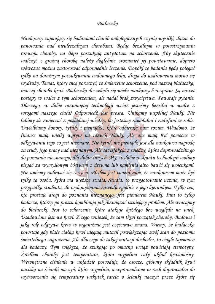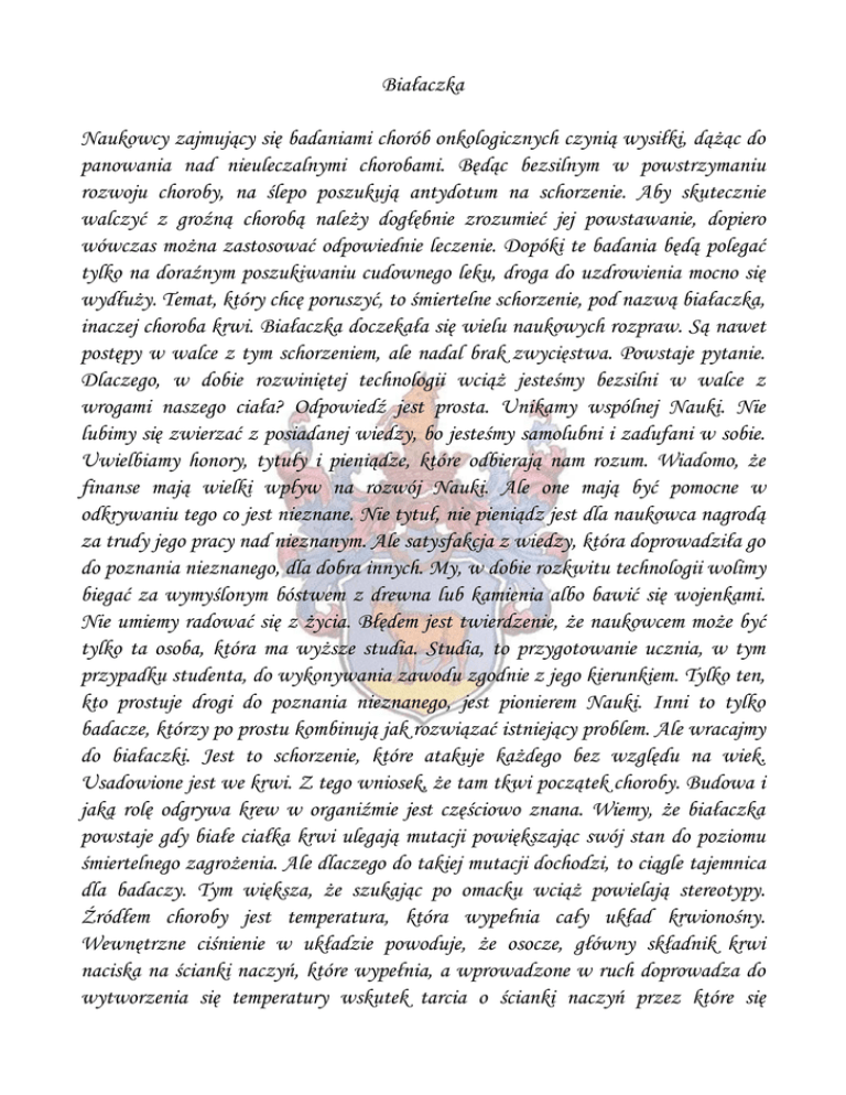 Białaczka Naukowcy zajmujący się badaniami chorób onkologicznych czynią wysiłki, dążąc do panowania nad nieuleczalnymi chorobami. Będąc bezsilnym w powstrzymaniu rozwoju choroby, na ślepo poszukują antydotum na schorzenie. Aby skutecznie walczyć z groźną chorobą należy dogłębnie zrozumieć jej powstawanie, dopiero wówczas można zastosować odpowiednie leczenie. Dopóki te badania będą polegać tylko na doraźnym poszukiwaniu cudownego leku, droga do uzdrowienia mocno się wydłuży. Temat, który chcę poruszyć, to śmiertelne schorzenie, pod nazwą białaczka, inaczej choroba krwi. Białaczka doczekała się wielu naukowych rozpraw. Są nawet postępy w walce z tym schorzeniem, ale nadal brak zwycięstwa. Powstaje pytanie. Dlaczego, w dobie rozwiniętej technologii wciąż jesteśmy bezsilni w walce z wrogami naszego ciała? Odpowiedź jest prosta. Unikamy wspólnej Nauki. Nie lubimy się zwierzać z posiadanej wiedzy, bo jesteśmy samolubni i zadufani w sobie. Uwielbiamy honory, tytuły i pieniądze, które odbierają nam rozum. Wiadomo, że finanse mają wielki wpływ na rozwój Nauki. Ale one mają być pomocne w odkrywaniu tego co jest nieznane. Nie tytuł, nie pieniądz jest dla naukowca nagrodą za trudy jego pracy nad nieznanym. Ale satysfakcja z wiedzy, która doprowadziła go do poznania nieznanego, dla dobra innych. My, w dobie rozkwitu technologii wolimy biegać za wymyślonym bóstwem z drewna lub kamienia albo bawić się wojenkami. Nie umiemy radować się z życia. Błędem jest twierdzenie, że naukowcem może być tylko ta osoba, która ma wyższe studia. Studia, to przygotowanie ucznia, w tym przypadku studenta, do wykonywania zawodu zgodnie z jego kierunkiem. Tylko ten, kto prostuje drogi do poznania nieznanego, jest pionierem Nauki. Inni to tylko badacze, którzy po prostu kombinują jak rozwiązać istniejący problem. Ale wracajmy do białaczki. Jest to schorzenie, które atakuje każdego bez względu na wiek. Usadowione jest we krwi. Z tego wniosek, że tam tkwi początek choroby. Budowa i jaką rolę odgrywa krew w organiźmie jest częściowo znana. Wiemy, że białaczka powstaje gdy białe ciałka krwi ulegają mutacji powiększając swój stan do poziomu śmiertelnego zagrożenia. Ale dlaczego do takiej mutacji dochodzi, to ciągle tajemnica dla badaczy. Tym większa, że szukając po omacku wciąż powielają stereotypy. Źródłem choroby jest temperatura, która wypełnia cały układ krwionośny. Wewnętrzne ciśnienie w układzie powoduje, że osocze, główny składnik krwi naciska na ścianki naczyń, które wypełnia, a wprowadzone w ruch doprowadza do wytworzenia się temperatury wskutek tarcia o ścianki naczyń przez które się przetacza, nagrzewając krew do ustalonej wartości. Nagrzana krew przekazuje część temperatury całemu organizmowi, dlatego odczuwamy ciepłotę ciała. Błędne jest twierdzenie, że spalanie się związków biochemicznych wytwarza temperaturę. W osoczu znajdują się białe i czerwone płytki krwi. Dla płytek osocze, to źródło życia. Każda żywa komórka do rozwoju potrzebuje wilgoci, ciepła i energii, którą właśnie jest temperatura. Przy temperaturze krwi 36,6 kresek Celesjusza białe płytki jak i czerwone są utrzymywane na stałym poziomie. Wzrost temperatury krwi powyżej normy powoduje, że białe płytki będą się nadmiernie rozwijać a czerwone ulegać uszkodzeniu. Wysoka temperatura krwi sprzyja rozwojowi białych krwinek. Obniżenie temperatury o jeden stopień Celesjusza od jej normy, powinno doprowadzić do wstrzymania klonowania białych krwinek. Wysokie ciśnienie w obwodzie krwionośnym to jedno z przyczyn powstawania białaczki. Białaczka nie ma następstw genetycznie obciążonych. Takie choroby w ogóle nie istnieją. Człowieka atakują różne wirusy. Jedne pochodzą z poza ciała, inne powstają bezpośrednio w nas na skutek zmian termicznych, którym sprzyja wyższa temperatura ciała i nadmiar wody, której przyczyną jest brak pocenia się. Żadne ciało nie jest wyposażone w ukrytą chorobę, ani żaden gen nie jest budulcem choroby. Nam po prostu brakuje wiedzy o nas samych. Na przykład, uważamy otyłość za chorobę, nawet obwiniamy geny za jej powstanie, ale nie zwracamy uwagę na to, że spożywamy delikatny i łatwo rozpuszczalny pokarm, który jest gwałtownie wchłaniany przez organizm a nadmiar natychmiast odkładany jako zapas. Taki pokarm wywołuje ciągłe pragnienie niedosytu, wskutek pustego żołądka, dlatego czujemy głód, który wymusza na nas jego ciągłe zaspakajanie. I wymyślamy następny objaw choroby, łaknienie. Ale wracajmy do białaczki. Rozwój choroby może mieć początek już w wieku niemowlęcym. Niemowlęta jak i starsze dzieci często mają zapalenie oskrzeli, które bardzo utrudnia oddychanie. Ta czynność ma podstawowy wpływ na wzrost temperatury krwi. Nasze płuca są wypełnione pęcherzykami, przez które przepływa krew. Służą one nam nie do uzupełniania tlenu i wydalania dwutlenku ale do schładzania krwi. Gdy wykonujemy wdech powodujemy, że strumień chłodnego powietrza przechodzi przez oskrzela, które pełnią rolę filtra. Następnie powietrze owiewa pęcherzyki wypełnione ciepłą krwią, odbierając część temperatury i ogrzane wydechamy na zewnątrz aby nie dopuścić do jej przegrzania. Gdyby krew pochłaniała tlen i jednocześnie wydalała go pod postacią dwutlenku jak to jest obecnie przedstawiane, wówczas ciśnienie krwi podobne byłoby do amplitudy drgań prądu zmiennego. A tak się nie dzieje. Albo, jak tlen ma być wchłaniany, kiedy krew od wewnątrz znajduje się pod ciśnieniem? Wykonując zastrzyk do żyły, zmuszeni jesteśmy użyć siły. Co by się wydarzyło? gdyby tlen pod ciśnieniem był wtłaczany do płuc, bo o samoistnym wchłanianiu nie może być mowy. Kiedy otacza nas wysoka temperatura powietrza wykonujemy głębokie wdechy, ale gdy mamy do czynienia z niską ogra