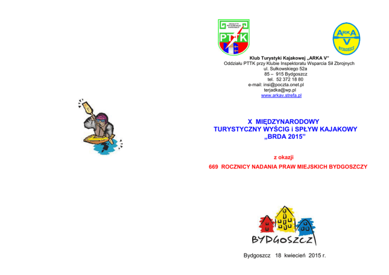 Klub Turystyki Kajakowej „ARKA V” Oddziału PTTK przy Klubie Inspektoratu Wsparcia Sił Zbrojnych ul. Sułkowskiego 52a 85 – 915 Bydgoszcz tel. 52 372 18 80 e-mail: [email protected] [email protected] www.arkav.strefa.pl X MIĘDZYNARODOWY TURYSTYCZNY WYŚCIG i SPŁYW KAJAKOWY „BRDA 2015” z okazji 669 ROCZNICY NADANIA PRAW MIEJSKICH BYDGOSZCZY Bydgoszcz 18 kwiecień 2015 r. WSPÓŁORGANIZATORZY: WSPÓŁORGANIZATORZY: ZASADNICZA SZKOŁA ZAWODOWA RZEMIOSŁA I PRZEDSIĘBIORCZOŚCI w Bydgoszczy Urząd Miasta Bydgoszczy POLICEALNE SZKOŁY COSINUS Kujawsko – Pomorski Związek Kajakowy Zespół Szkół Nr 29 Bydgoszcz CWZS „Zawisza” Stowarzyszenie Kajakowe Bydgoszcz Centrum Tańca GABI PAŁAC MŁODZIEŻY – UKS „KOPERNIK” Bydgoszcz CENTRUM GALANTERII SKÓRZANEJ I BAGAŻU Bydgoszcz www.marwal.pl PRODUCENT KAJAKÓW www.gokajak.com Pepsi - Cola General Bottlers Sp. z o. o. Bydgoskie Towarzystwo Hipoterapeutyczne „Myślęcinek” TEB Edukacja – szkoły policealne KOMITET ORGANIZACYJNY: Teresa Kaczmarek Maciej Juhnke Piotr Paradowski - Prezes Klubu Turystyki Kajakowej” ARKA V” - V-ce Prezes Klubu Turystyki Kajakowej „ARKA V” - Klub Turystyki Kajakowej „ARKA V” tel. 505 661 399 tel. 602 408 996 tel. 604 220 443 KIEROWNICTWO IMPREZY TURYSTYCZNEJ: Komandor: Sędzia główny : Sędziowie: Lech Boczkowski - Instruktor Rekreacji Kajakowej Teresa Kaczmarek - Sędzia kl. zw. Andrzej Zaremba - Sędzia kl. zw. Zofia Nowak - Sędzia kl. zw. Sekretariat: Danuta Plewa - Sędzia kl. okr. KTKaj „ARKA V” Magdalena Pabisek - KTKaj „ARKA V” Alicja Kodzik - KTKaj. „ARKA V” Kwatermistrz: Andrzej Krysiak - KTKaj. „ARKA V” Pilot początkowy: Marek Lubiszewski - Przodownik Turystyki Kajakowej X MIĘDZYNARODOWY TURYSTYCZNY WYŚCIG I SPŁYW KAJAKOWY „BRDA 2015” I. Cel i zadania spływu: - popularyzacja turystyki kajakowej jako formy aktywnego wypoczynku, - promocja Miasta Bydgoszczy, - uczestnictwo w obchodach 669 rocznicy nadania praw miejskich Bydgoszczy, - zapoznanie uczestników z walorami rzeki Brdy, II. Data i trasa imprezy: Bydgoszcz, dnia 18 kwietnia 2015 r. Przystań Wodna UKS „Kopernik” Pałac Młodzieży ul. Babia Wieś – Wyspa Młyńska - przystań KTKaj „ARKA V” ul. Witebska 4 dł. 13 km III. Warunki uczestnictwa: 1. W imprezie mogą brać udział turyści indywidualni, zrzeszeni i niezrzeszeni. 2. W imprezie mogą brać udział osoby pełnoletnie, młodzież niepełnoletnia pod opieką osoby dorosłej, o dobrym stanie zdrowia, posiadające umiejętności pływania, nie uprawiające czynnie sportu wyczynowego i na sprzęcie turystycznym. 3. Uczestnicy imprezy startują na własną odpowiedzialność, za ewentualne straty i szkody Kierownictwo nie bierze odpowiedzialności 4. Uczestnicy dokonują zgłoszenia na odpowiednich drukach – kartach zgłoszeń i składają oświadczenia o odpowiedzialności za osobę niepełnoletnią ( wg załączników nr 1 i 2 ) 5. Zgłoszenia należy przesłać na adres drogą elektroniczną; e-mail: [email protected] lub pisemnie KTKaj „ARKA V” Oddziału PTTK przy Klubie IWspSZ ul. Sułkowskiego 52a 85-915 Bydgoszcz z dopiskiem „kajaki” w terminie nie przekraczalnym do dnia 09.04.2015 roku. 6. Koszt uczestnictwa w imprezie wynosi: dzieci do lat 12 – 20,00 zł; dorośli - 40,00 zł od osoby. Opłaty należy dokonać na konto : PTTK Oddział przy Klubie IWspSZ ul. Sułkowskiego 52a 85 - 915 Bydgoszcz nr: 20 1020 1462 0000 7202 0125 5363 z dopiskiem „kajaki” 7. W razie nie przybycia na start na imprezę lub rezygnację 7 dni przed rozpoczęciem imprez – wpisowe nie podlega zwrotowi. 8. W przypadku wnoszenia opłaty w dniu imprezy pobierana będzie opłata w wysokości 5 zł od zgłoszonej osoby. IV. Sprzęt Uczestnicy biorą udział w imprezie na własnym sprzęcie (kajaki, kamizelki asekuracyjne), ponoszą pełną odpowiedzialność za poziom techniczny posiadanego sprzętu. Istnieje możliwość wypożyczenia kajaków od organizatora za opłatą 10 zł od osoby, decyduje kolejność zgłoszeń. V. Konkurencje: K-1 K-1 K-2 K-2 K-2 Kobiet Mężczyzn Kobiet Mężczyzn Mix VI. Program spływu i wyścigu: 9.00 – 10.00 10.30 11.30 11.40 14.00 13.00 14.30 - weryfikacja uczestników, przygotowanie sprzętu / Przystań Wodna UKS Kopernik - uroczystość otwarcia X Międzynarodowego Turystycznego Wyścigu i Spływu - start wyścigu kajaków K – 1; K – 2 - start spływu - zamknięcie mety spływu i wyścigu w Brdyujściu Przystań KTKaj. „ARKA V” - gorący posiłek na przystani klubowej Brdyujście / ul. Witebska 4 / - uroczyste zakończenie imprezy i wręczenie nagród dla uczestników imprezy. VII. Nagrody w wyścigu i spływie kajakowym w konkurencjach indywidualnych Organizator przewiduje medale, puchary, dyplomy, nagrody rzeczowe. VIII. Obowiązki uczestnika spływu i wyścigu: - podporządkowanie się zarządzeniom kierownictwu imprezy - przestrzeganie regulaminu imprezy - zakaz spożywania alkoholu w czasie imprezy - wszyscy uczestnicy spływu i wyścigu płyną obowiązkowo w kamizelce asekuracyjnej, IX. Organizator w ramach wpisowego zapewnia: - ubezpieczenie NW - asekurację na wodzie i obsługę ratowniczą - wklejki TOK - gorący posiłek, napoje i gadżety Zgłaszający ponosi pełną odpowiedzialność za stan zdrowia oraz umiejętności pływackie. INFORMATOR Nie zwlekaj ze zgłoszeniem, zgłoś się już dziś , impreza będzie jak zawsze udana i wspaniała dzięki Twojej obecności na pięknym szlaku wodnym rzeki Brdy. REGULAMIN