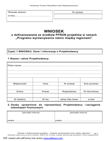 Państwowy Fundusz Rehabilitacji Osób Niepełnosprawnych Wniosek złożono Nr sprawy: w dniu................................................... WNIOSEK o dofinansowanie ze środków PFRON projektów w ramach „Programu wyrównywania różnic między regionami” Część 1 WNIOSKU: Dane i informacje o Projektodawcy 1. Nazwa i adres Projektodawcy Pełna nazwa : ................................................................................................................ ...................................................................................................................................... ...................................................................................................................................... Miejscowość Ulica Nr posesji Kod pocztowy Gmina Powiat Województwo Nr kierunkowy Nr telefonu Nr fax adres http://www e-mail 2. Osoby uprawnione do reprezentacji Projektodawcy i zaciągania zobowiązań finansowych (pieczątka imienna) (pieczątka imienna) podpis............................................................. podpis............................................................. Wniosek o dofinansowanie projektów – „Program wyrównywania różnic między regionami” str.1 Dokument nadzorowany do dnia wydruku: 2008-03-06. Po dacie wydruku sprawdź jego aktualność w bazie komputerowej. PDF created with pdfFactory trial version www.pdffactory.com Państwowy Fundusz Rehabilitacji Osób Niepełnosprawnych 3. Informacje o realizacji obowiązku wpłat na rzecz PFRON Czy Projektodawca jest zobowiązany do wpłat na rzecz PFRON tak: nie: tak: nie: Podstawa zwolnienia z wpłat na rzecz PFRON Czy Projektodawca zalega z wpłatami na rzecz PFRON Numer identyfikacyjny PFRON Kwota zaległości z tytułu wpłat, których termin płatności upłynął w miesiącu poprzedzającym miesiąc złożenia wniosku .................................zł 4. Informacje o Projektodawcy Zakres terytorialny działania Projektodawcy: REGON Nr identyfikacyjny NIP Nazwa banku Nr rachunku bankowego Czy Projektodawca jest podatnikiem VAT: tak: nie: podstawa prawna zwolnienia z podatku VAT ................................................................... Wnioskodawca jest podatnikiem VAT, lecz w ramach wnioskowanych do dofinansowania kosztów nie może obniżyć kwoty podatku należnego o podatek naliczony tak: nie: podstawa prawna:..................................................................................................... 5. Informacja o korzystaniu ze środków PFRON (za okres ostatnich 3 lat) Czy Projektodawca korzystał ze środków PFRON Cel (nazwa zadania ustawowego oraz /lub nazwa programu, w ramach którego przyznana została pomoc) Nr i data zawarcia umowy Kwota przyznana Razem kwota przyznana: tak Termin rozliczenia nie Kwota rozliczona Razem kwota rozliczona: Wniosek o dofinansowanie projektów – „Program wyrównywania różnic między regionami” str.2 Dokument nadzorowany do dnia wydruku: 2008-03-06. Po dacie wydruku sprawdź jego aktualność w bazie komputerowej. PDF created with pdfFactory trial version www.pdffactory.com Państwowy Fundusz Rehabilitacji Osób Niepełnosprawnych 6. Załączniki (dokumenty) wymagane do wniosku L.p. Załączono do wniosku tak nie Nazwa załącznika 1. Aktualny dokument potwierdzający prawny Projektodawcy. Uzupełniono Data tak/nie uzupełnienia status 2. Pełnomocnictwo w przypadku, gdy wniosek podpisany jest przez osoby upełnomocnione do reprezentowania Projektodawcy. 3. Zaświadczenie z ZUS o niezaleganiu w składkach na ubezpieczenia społeczne za zatrudnionych pracowników. 4. Dokumenty z Urzędu Skarbowego: decyzja o ewentualnym zwolnieniu z podatków, zaświadczenie o niezaleganiu z podatkami oraz zaświadczenie, o którym mowa w Rozdziale V. - Zasady przekazywania i rozliczania środków PFRON, pkt 8 Procedur realizacji programu – Program wyrównywania różnic między regionami. 5. Oświadczenie o nieposiadaniu wymagalnych zobowiązań wobec PFRON i zaległości w obowiązkowych wpłatach na PFRON (kopia deklaracji wpłat na PFRON ostatniego miesiąca obowiązku dokonania wpłaty wraz z kopią dowodu dokonania ostatniej wpłaty). 6. Wydane przez bank (banki) zaświadczenie o posiadaniu rachunku bankowego (rachunków bankowych), wraz z informacją o ewentualnych obciążeniach. Potwierdzam kompletność złożonych dokumentów wymienionych w części 1 Wniosku: pieczątka imienna, podpis pracownika data, podpis: Wniosek o dofinansowanie projektów – „Program wyrównywania różnic między regionami” str.3 Dokument nadzorowany do dnia wydruku: 2008-03-06. Po dacie wydruku sprawdź jego aktualność w bazie komputerowej. PDF created with pdfFactory trial version www.pdffactory.com Państwowy Fundusz Rehabilitacji Osób Niepełnosprawnych Wykaz projektów planowanych do realizacji przez Projektodawcę w ramach obszaru B programu: Lp. Nazwa projektu Wniosek o dofinansowanie projektów – „Program wyrównywania różnic między regionami” str.4 Dokument nadzorowany do dnia wydruku: 2008-03-06. Po dacie wydruku sprawdź jego aktualność w bazie komputerowej. PDF created with pdfFactory trial version www.pdffactory.com Państwowy Fundusz Rehabilitacji Osób Niepełnosprawnych Część 2B WNIOSKU: Informacje o projektach planowanych do realizacji w ramach obszaru B programu UWAGA! W przypadku większej ilości projektów zgłoszonych w części 2 Wniosku, część 2B Wniosku należy skopiować i wypełnić dla każdego projektu oddzielnie 1. Opis projektu Nazwa projektu (nazwa zgodna z nazwą zapisaną w części 2 Wniosku): ....................................................................................................................................... ....................................................................................................................................... Cel projektu: (w przypadku obszernego opisu – w załączeniu) ........................................