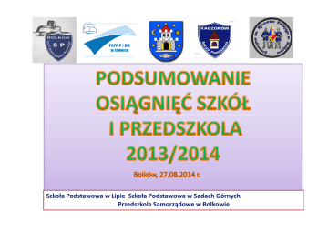 Szkoła Podstawowa w Lipie Szkoła Podstawowa w Sadach Górnych Przedszkole Samorządowe w Bolkowie WSPÓŁZAWODNICTWO SPORTOWE W RAMACH Powiatowego Szkolnego Związku Sportowego w Jaworze Gmina Liczba punktów Jawor 1172 Bolków 549 Wądroże Wielkie 517 Paszowice 424 Mściwojów 389 Męcinka 283 ZESTAWIENIE UDZIAŁU UCZNIÓW GMINY BOLKÓW W KONKURSACH LP. KONKURSY LICZBA KONKURSÓW LICZBA UCZESTNIKÓW 1. KONKURSY GMINNE 71 638 2. KONKURSY POWIATOWE 48 542 3. KONKURSY WOJEWÓDZKIE, REGIONALNE, OGÓLNOPOLSKIE 87 941 206 2121 RAZEM SZKOŁA PODSTAWOWA W SADACH GÓRNYCH Dyrektor: Bogumiła Ogrodniczak • Certyfikat potwierdzający udział I klasy w V edycji programu "Klub Bezpiecznego Puchatka " w roku szkolnym 2013/2014 • Dyplom dla Szkoły Podstawowej w Sadach Górnych za udział w konkursie plastycznym zrealizowanym w ramach projektu "Międzynarodowy Salon Sztuki Dziecięcej Jawor - Turnov 2013 " • Podziękowanie dla Szkoły Podstawowej w Sadach Górnych za czynny udział w społecznej akcji " Nakrętki dla FEMINY " oraz propagowanie wśród młodzieży idei recyklingu oraz profilaktyki zdrowotnej • Podziękowanie dla szkoły za udział w konkursie " Zbieramy zużyte baterie 2013 " organizowanym przez Marszałka Województwa Dolnośląskiego w ramach publicznej kampanii edukacyjnej na terenie Województwa Dolnośląskiego Dyplom Akademii Czystych Rąk Carex dla Szkoły Podstawowej w Sadach Górnych .Szkoła uczestniczyła w IV edycji Akademii Czystych Rąk Carex, promując wśród uczniów prawidłowe nawyki mycia rąk zgodnie z zasadą "Zdrowy uczeń , to wzorowy uczeń „ ( patronat Centrum Zdrowia Dziecka ) Dyplom dla Szkoły Podstawowej w Sadach Górnych za udział w półfinale X KONKURSU BEZPIECZEŃSTWA Zarządu Województwa Dolnośląskiego i Stowarzyszenia Gmin Polskich Euroregionu Nysa " Uczę się bezpiecznie żyć „ Dyplom uczestnictwa w Rejonowym Konkursie Recytatorskim " Maluchy lubią Wiersze " ( MCK w Legnicy ) Dyplom uznania za udział szkoły w Ogólnopolskim Konkursie Ekologiczno - Przyrodniczym Dyplom poświadczający przygotowanie uczniów do ponadprogramowej ogólnopolskiej olimpiady przedmiotowej Olimpus Sesja wiosenna Podziękowanie za udział uczniów w Ogólnopolskim Programie EKSTRA KLASA .Trening umiejętności dla klas 3. Podziękowanie dla Szkoły Podstawowej w Sadach Górnych za udział w I Festiwalu Piosenki Przedszkolnej "GIGANCI 2014 „ Dyplom uczestnictwa w Rejonowym Konkursie Recytatorskim " Maluchy lubią Wiersze " ( MCK w Legnicy ) Podziękowanie za udział szkoły w Ogólnopolskim projekcie "Świerszczykowy Klub Pożeraczy Liter " ( w ramach akcji Cała Polska Czyta Dzieciom - Czytające Szkoły ) Telewizja Polska Oddział Wrocław. Kuratorium Oświaty we Wrocławiu . Podziękowania dla Szkoły Podstawowej w Sadach Górnych za udział w V edycji akcji „Mogiłę Pradziada Ocal od Zapomnienia”. Dzięki Waszej pomocy możemy ratować polskie mogiły pozostawione za wschodnią granicą, łączyć Dolnoślązaków z małymi ojczyznami ich przodków ( podpisano - dnia 16 maja 2014 r.: Dolnośląski Wicekurator Oświaty -Pani inż . Danuta Leśniewska , Dyrektor Telewizji Polskiej S.A. Oddział we Wrocławiu - Pani Ewa Wolniewicz - Dżeljilji . ) Szkoła Podstawowa w Sadach Górnych otrzymuje Dyplom za udział w III edycji projektu Szkoła z Prawami Dziecka - Dyrektor Generalny UNICEF Polska Certyfikat Akademii Przyjaciół Pszczół . Szkoła Podstawowa w Sadach Górnych przyłączyła się do ogólnopolskiego programu Akademie Przyjaciół Pszczół 2014 w ramach IV edycji programu " Z Kujawskim Pomagamy Pszczołom ". W trakcie projektu edukacyjnego zajęcia szkolne realizowane były zgodnie z materiałami dydaktycznymi związanymi z wiedzą o pszczołowatych i ich roli w środowisku . Dyplom otrzymuje Szkoła Podstawowa w Sadach Górnych ( Julia Siwiec, Wiktoria Larysz, Amelia Koper, Kacper Ogrodniczak , Lucia Zuchantke ) za udział w VI Powiatowym Konkursie Matematycznym "ABAK " dla uczniów klas II -III szkół podstawowych Podziękowanie za udział uczniów w Ogólnopolskim Konkursie Literackim EKSTRA KLASA SZKOŁA PODSTAWOWA W KACZOROWIE Dyrektor: Helena Sawicka-Kręcichwost • • • • • Dyplom dla szkoły za udział w konkursie plastycznym zrealizowanym w ramach projektu ,,Międzynarodowy Salon Sztuki Dziecięcej Jawor – Turnov 2013”. Certyfikat of license – is licensed as a Local Organizer of the action 3rd World Muliplication Table Day – September 2013. Dyplom dla szkoły za udział w konkursie plastycznym ,,Kolory jesieni”. Dyplom dla szkoły za udział w konkursie plastycznym ,,Boże Narodzenie”. Dyplom dla szkoły za udział w konkursie plastycznym ,,Pocztówka do św. Mikołaja”. •Dyplom za udział w XXVII Młodzieżowym rajdzie ,,Bulwa” •Dyplom dla szkoły za udział w konkursie ,,Moja walentynka”. •Dyplom dla szkoły za udział w konkursie plastycznym ,,Pejzaż zimowy”. •Dyplom dla szkoły za udział w konkursie plastycznym ,,Wielkanocne malowanie”. •Dyplom dla szkoły za udział w VI Powiatowym Konkursie Matematycznym ,,ABAK” dla uczniów klas II – III szkół podstawowych. •Dyplom dla szkoły za udział w konkursie plastycznym ,,Wiosenne barwy”. •Dyplom dla szkoły za udział w rajdzie ,,Szlakiem Trzech Wąwozów”. SZKOŁA PODSTAWOWA W LIPIE Dyrektor: Bogusława Radecka - Bych • Certyfikat potwierdzający udział w V edycji programu ,,Klub Bezpiecznego Puchatka" • Certyfikat potwierdzający udział w ogólnopolskim programie ,,Śniadanie Daje Moc" • Podziękowanie od Wojewódzkiej Rady Bezpieczeństwa Ruchu Drogowego we Wrocławiu za zaangażowanie i aktywne działania na rzecz propagowania bezpieczeństwa w ruchu drogowym na terenie województwa dolnośląskiego • Podziękowanie od Przewodniczącego Rady Miejskiej w Bolkowie za aktywny udział w XX Sportowym Turnieju Miast i Gmin • List Gratulacyjny od Starosty Jaworskiego za wspieranie uczniów w ich rozwoju indy