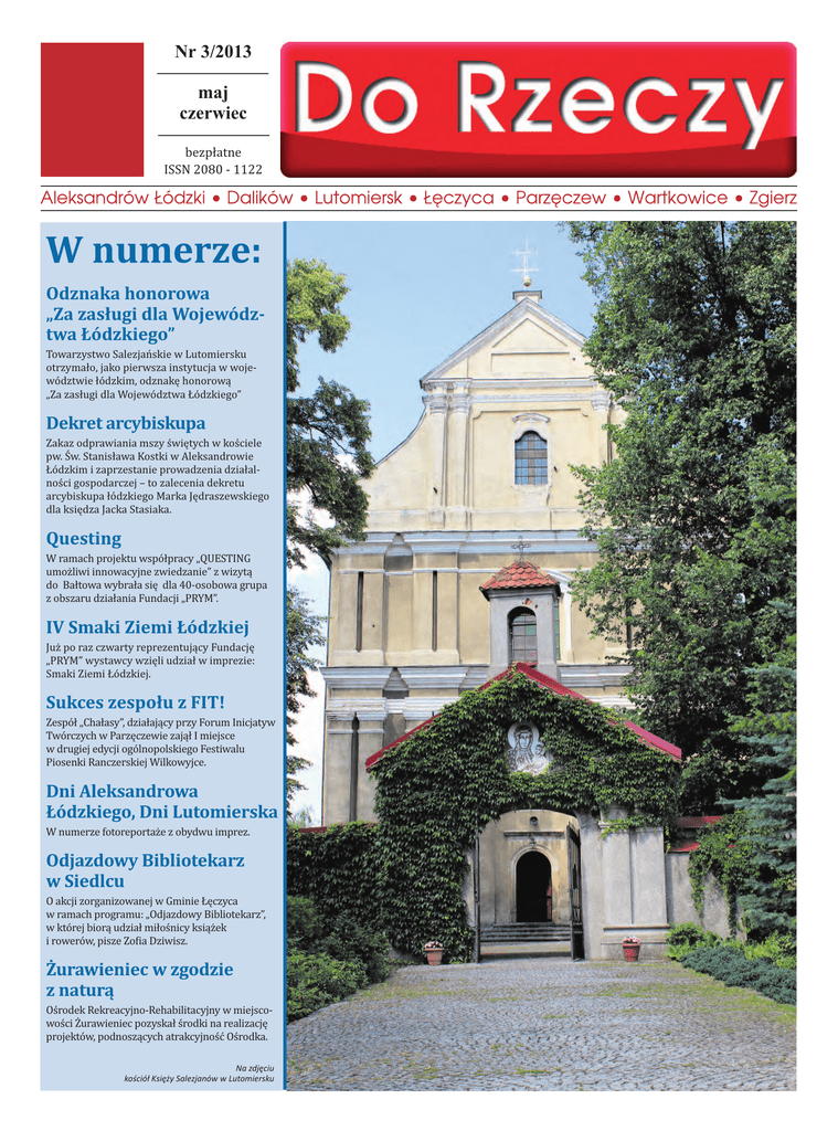 Nr 3/2013 maj czerwiec bezpłatne ISSN 2080 - 1122 W numerze: Odznaka honorowa „Za zasługi dla Wojewódz twa Łódzkiego” Towarzystwo Salezjańskie w Lutomiersku otrzymało, jako pierwsza instytucja w woje wództwie łódzkim, odznakę honorową „Za zasługi dla Województwa Łódzkiego” Dekret arcybiskupa Zakaz odprawiania mszy świętych w kościele pw. Św. Stanisława Kostki w Aleksandrowie Łódzkim i zaprzestanie prowadzenia działalności gospodarczej – to zalecenia dekretu arcybiskupa łódzkiego Marka Jędraszewskiego dla księdza Jacka Stasiaka. Questing W ramach projektu współpracy „QUESTING umożliwi innowacyjne zwiedzanie” z wizytą do Bałtowa wybrała się dla 40-osobowa grupa z obszaru działania Fundacji „PRYM”. IV Smaki Ziemi Łódzkiej Już po raz czwarty reprezentujący Fundację „PRYM” wystawcy wzięli udział w imprezie: Smaki Ziemi Łódzkiej. Sukces zespołu z FIT! Zespół „Chałasy”, działający przy Forum Inicjatyw Twórczych w Parzęczewie zajął I miejsce w drugiej edycji ogólnopolskiego Festiwalu Piosenki Ranczerskiej Wilkowyjce. Dni Aleksandrowa Łódzkiego, Dni Lutomierska W numerze fotoreportaże z obydwu imprez. Odjazdowy Bibliotekarz w Siedlcu O akcji zorganizowanej w Gminie Łęczyca w ramach programu: „Odjazdowy Bibliotekarz”, w której biorą udział miłośnicy książek i rowerów, pisze Zofia Dziwisz. Żurawieniec w zgodzie z naturą Ośrodek Rekreacyjno-Rehabilitacyjny w miejscowości Żurawieniec pozyskał środki na realizację projektów, podnoszących atrakcyjność Ośrodka. Na zdjęciu kościół Księży Salezjanów w Lutomiersku 2 czerwiec 2013 Realizowane są kolejne działania w ramach projektu współpracy „QUESTING umożliwi innowacyjne zwiedzanie”. W dniach 25-26 kwietnia br. odbył się wyjazd do Bałtowa zorganizowany dla 40-osobowej grupy z obszaru działania Fundacji „PRYM”. Grupę tą tworzyli przede wszystkim uczniowie i nauczyciele z 7 szkół uczestniczących w projekcie (SP im. Orła Białego w Lutomiersku, SP w Chociszewie, Gimnazjum im. Czesława Miłosza w Topoli Królewskiej, Zespołu Szkół w Wartkowicach, Zespołu Szkolno-Gimnazjalnego w Szczawinie, Szkoły Podstawowej im. Ryszarda Wyrzykowskiego w Bełdowie oraz Zespołu Szkół w Dalikowie). Podczas wyjazdu uczestnicy zapoznali się z metodologią tworzenia tras questingowych oraz przeszli w terenie przykładowe questy. W wyjeździe uczestniczyli również przedstawiciele dwóch pozostałych LGD, które realizują ten projekt tj.: „Doliny rzeki Grabi” i Stowarzyszenia „BUD-UJ RAZEM”, łącznie ok. 100 osób. Pierwszy dzień pobytu w Bałtowie uczestnicy rozpoczęli od udziału w seminarium „Dobre praktyki w metodzie interpretacji Turystyki Dziedzictwa – Questing”. W spotkaniu wzięli udział przedstawiciele Konsorcjum Planet MILA, które jest głównym wykonawcą w ramach realizacji projektu współpracy, Prezes Stowarzyszenia LGD „Krzemienny Krąg”. Questing zaistniał w Bałtowie dzięki realizacji projektu „Bałtów – polska stolica questingu”. W jego wyniku opracowano dziesięć questów, które zostały przygotowane przez mieszkańców (właścicieli gospodarstw agroturystycznych) przy aktywnym wsparciu młodzieży. Po spotkaniu każda z trzech grup wyruszyła w teren, aby przejść pierwszą trasę questingową. Nasza drużyna zdobywała „Żydowski Jar”. Ścieżka questingowa „Śladami historii w Żydowskim Jarze” wiedzie przez wąwóz lessowy, który kryje tajemnice stworzeń, żyjących tu przed milionami lat. QUESTING Pora ruszyć na poszukiwania! 25 kwietnia grupa przeszła również quest „Ukryte skarby Kamiennej”. Ten quest to odkrywanie tajemnic rzeki Kamiennej podczas wędrówki jej doliną, której strome zbocza zdobią wapienne skałki. Drugiego dnia pobytu w Bałtowie nasza grupa ruszyła szlakiem questu pn. „Druckich-Lubeckich historia rodowa, co wśród drzew się chowa”, który związany jest ze znajdującymi się w Bałtowie „książęcymi włościami” kniaziowskiego rodu Druckich-Lubeckich. Zrujnowana niestety siedziba rodu wita wędrowca słowami: „Boże! Ci wszyscy, którzy tu bywają, czego nam życzą niechaj sami mają”. Ród Druckich-Lubeckich zamieszkiwał w Bałtowie do roku 1944. Najsłynniejszym historycznie przedstawicielem rodziny jest Franciszek Ksawery Drucki-Lubecki, który w latach 18211830 pełnił funkcję ministra skarbu Królestwa Polskiego. Bałtowski pałac wraz z parkiem powrócił do spadkobierców rodu Druckich – Lubeckich i być może uda się przywrócić mu jego dawną świetność. Po powrocie z Bałtowa rozpoczęły się kolejne działania w projekcie, już na terenie gmin partnerskich Fundacji. W czerwcu br. w poszczególnych szkołach, które uczestniczą w projekcie odbył się pierwszy cykl warsztatów, dotyczących opracowania questów na terenie gmin partnerskich Fundacji „PRYM” z udziałem trenerów z Fundacji Ludzi i Miejsc Aktywnych „MILA”. Efekty pracy naszej młodzieży poznamy pod koniec 2013 roku. Projekt współpracy jest realizowany ze środków Europejskiego Funduszu Rolnego na Rzecz Rozwoju Obszarów Wiejskich w ramach działania „Wdrażanie projektów współpracy”. Jeśli zainteresował Państwa temat questingu, zapraszamy do odwiedzenia strony internetowej www. questing.pl. Renata Jesionowska-Zawadzka Odznaka honorowa 28 maja br. w Łódzkim Domu Kultury podczas uroczystej sesji Sejmiku „Za zasługi dla Województwa Łódzkiego” znak „Za zasługi dla województwa łódzkiego”. Jako pierwszej instytucji w Województwie Łódzkim odznakę przyznano Towarzystwu Salezjańskiemu w Lutomiersku. Prestiżowe wyróżnienie z rąk Marszałka Województwa Łódzkiego Pana Witolda Stępnia oraz Przewodniczącego Sejmiku Pana Marka Mazura odebrał ks. Kazimierz Dąbrowski – dyrektor Towarzystwa Salezjańskiego. Odznaka Honorowa za Zasługi dla Województwa Łódzkiego to odznaczenie dla osób l