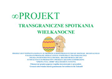 • PROJEKT TRANSGRANICZNE SPOTKANIA WIELKANOCNE PROJEKT JEST WSPÓŁFINANSOWANY ZE ŚRODKÓW EUROPEJSKIEGO FUNDUSZU ROZWOJU REGIONALNEGO W RAMACH PROGRAMU OPERACYJNEGO WSPÓŁPRACY TRANSGRANICZNEJ POLSKA (WOJEWÓDZTWO LUBUSKIE) –BRANDENBURGIA 2007-2013 FUNDUSZ MAŁYCH PROJEKTÓW I PROJEKTY SIECIOWE EUROREGIONU “SPREWA-NYSA –BÓBR” ORAZ BUDŻETU PAŃSTWA Pokonywać granice poprzez wspólne inwestowanie w przyszłość. Grenzen uberwinden durch gemeinsame Investition in die Zukunft PROGRAM PROJEKTU • • • • • • “Transgraniczne spotkania wielkanocne”-to kolejny wspólny projekt z udziałem polskich i niemieckich przedszkolaków mający na celu poznanie i przybliżenie tradycji wielkanocnych obu krajów. Podczas projektu dzieci z naszych zaprzyjaźnionych przedszkoli poznają tradycyjne obrzędy związane z Wielkanocą: tradycję przygotowywania wypieków wielkanocnych , tradycję zdobienia wielkanocnych bab tradycję malowani i kraszenia jaj tradycję wyplatania wielkanocnych palm i tworzenia wielkanocnych bukietów tradycję szukania czekoladowych jajeczek • • • • • • • Pierwsze spotkanie odbędzie się po stronie niemieckiej. Nasze przedszkolaki wyjadą na wycieczkę do manufaktury czekolady “ Confiserie Felicitas”w miejscowości Horrnow koło Cottbus w dniu 24.03.2015r . W manufakturze czekolady odbędą się : prezentacja filmu o tradycjach cukierniczych warsztaty zdobienia tabliczek czekolady degustacja czekolady pitnej Drugim etapem wycieczki jest wizyta w “Heimatmuseum” w miejscowości Dissen gdzie dzieci odbędą warsztaty malowania jaj wielkanocnych metodą pióra Wspólna zabawa pozwoli poznać zwyczaje i obrzędy przygranicznych landów. Będzie okazją do wspólnych zabaw integracyjnych , doskonalenia znajomości języka oraz utrwalania wiedzy o polskich i niemieckich tradycjach wielkanocnych . • • Drugie spotkanie odbędzie się w Zielonej Górze w dniu 26.03.2015r Składać się będzie z polsko- niemieckich warsztatów cukierniczych ,które odbędą się w cukierni “Jóźwiak” Dzieci odbędą wycieczkę do cukierni, pod okiem mistrza cukierniczego zajmą się wypiekiem wielkanocnych babeczek, które następnie samodzielnie przyozdobią . Uczestniczyć będą również w degustacji słodkości w kawiarni Charlotta-Caffe Następnie rozpoczną warsztaty plastyczne w grupach mieszanych polsko- niemieckich ,podczas których poznają tradycję wyplatania palemek wielkanocnych i tworzenia wielkanocnych bukietów. Wspólne działania pozwolą zintegrować dzieci oraz zachęcić do poznania nowych ciekawych technik plastycznych. Przyczynią się do nawiązania przyjaźni oraz skłonią do prostych konwersacji. Miłym akcentem będzie złożenie sobie wzajemnych życzeń przedświątecznych. Podczas realizacji projektu dzieci 5-6 letnie uczestniczyć będą w wspólnych posiłkach.