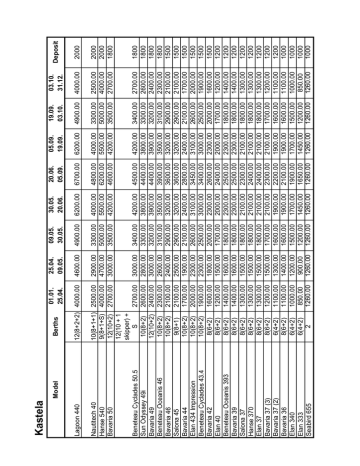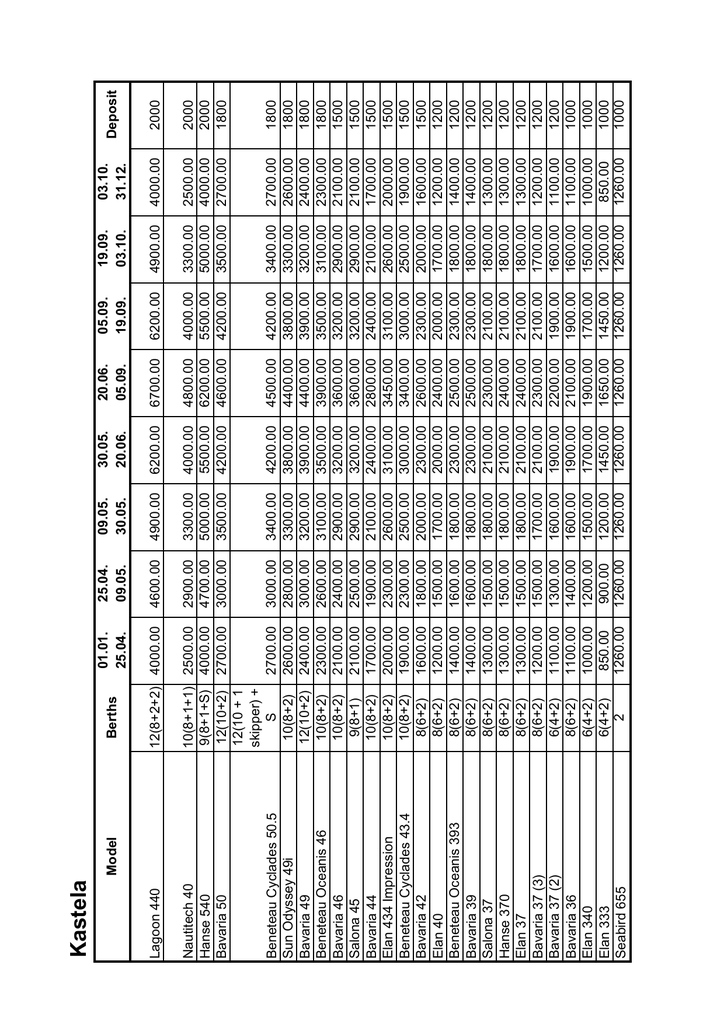 2900.00 4700.00 3000.00 3000.00 2800.00 3000.00 2600.00 2400.00 2500.00 1900.00 2300.00 2300.00 1800.00 1500.00 1600.00 1600.00 1500.00 1500.00 1500.00 1500.00 1300.00 1400.00 1200.00 900.00 1260.00 2500.00 4000.00 2700.00 2700.00 2600.00 2400.00 2300.00 2100.00 2100.00 1700.00 2000.00 1900.00 1600.00 1200.00 1400.00 1400.00 1300.00 1300.00 1300.00 1200.00 1100.00 1100.00 1000.00 850.00 1260.00 10(8+1+1) 9(8+1+S) 12(10+2) 12(10 + 1 skipper) + S 10(8+2) 12(10+2) 10(8+2) 10(8+2) 9(8+1) 10(8+2) 10(8+2) 10(8+2) 8(6+2) 8(6+2) 8(6+2) 8(6+2) 8(6+2) 8(6+2) 8(6+2) 8(6+2) 6(4+2) 8(6+2) 6(4+2) 6(4+2) 2 Nautitech 40 Hanse 540 Bavaria 50 Beneteau Cyclades 50.5 Sun Odyssey 49i Bavaria 49 Beneteau Oceanis 46 Bavaria 46 Salona 45 Bavaria 44 Elan 434 Impression Beneteau Cyclades 43.4 Bavaria 42 Elan 40 Beneteau Oceanis 393 Bavaria 39 Salona 37 Hanse 370 Elan 37 Bavaria 37 (3) Bavaria 37 (2) Bavaria 36 Elan 340 Elan 333 Seabird 655 4600.00 12(8+2+2) 4000.00 Lagoon 440 Berths 25.04. 09.05. Model 01.01. 25.04. Kastela 3400.00 3300.00 3200.00 3100.00 2900.00 2900.00 2100.00 2600.00 2500.00 2000.00 1700.00 1800.00 1800.00 1800.00 1800.00 1800.00 1700.00 1600.00 1600.00 1500.00 1200.00 1260.00 3300.00 5000.00 3500.00 4900.00 09.05. 30.05. 4200.00 3800.00 3900.00 3500.00 3200.00 3200.00 2400.00 3100.00 3000.00 2300.00 2000.00 2300.00 2300.00 2100.00 2100.00 2100.00 2100.00 1900.00 1900.00 1700.00 1450.00 1260.00 4000.00 5500.00 4200.00 6200.00 30.05. 20.06. 4500.00 4400.00 4400.00 3900.00 3600.00 3600.00 2800.00 3450.00 3400.00 2600.00 2400.00 2500.00 2500.00 2300.00 2400.00 2400.00 2300.00 2200.00 2100.00 1900.00 1650.00 1260.00 4800.00 6200.00 4600.00 6700.00 20.06. 05.09. 4200.00 3800.00 3900.00 3500.00 3200.00 3200.00 2400.00 3100.00 3000.00 2300.00 2000.00 2300.00 2300.00 2100.00 2100.00 2100.00 2100.00 1900.00 1900.00 1700.00 1450.00 1260.00 4000.00 5500.00 4200.00 6200.00 05.09. 19.09. 3400.00 3300.00 3200.00 3100.00 2900.00 2900.00 2100.00 2600.00 2500.00 2000.00 1700.00 1800.00 1800.00 1800.00 1800.00 1800.00 1700.00 1600.00 1600.00 1500.00 1200.00 1260.00 3300.00 5000.00 3500.00 4900.00 19.09. 03.10. 2700.00 2600.00 2400.00 2300.00 2100.00 2100.00 1700.00 2000.00 1900.00 1600.00 1200.00 1400.00 1400.00 1300.00 1300.00 1300.00 1200.00 1100.00 1100.00 1000.00 850.00 1260.00 2500.00 4000.00 2700.00 4000.00 03.10. 31.12. 1800 1800 1800 1800 1500 1500 1500 1500 1500 1500 1200 1200 1200 1200 1200 1200 1200 1200 1000 1000 1000 1000 2000 2000 1800 2000 Deposit Model Beneteau Cyclades 50.4 Sun Odyssey 49i Bavaria 46 Salona 45 Bavaria 44 Beneteau Oceanis 43 Bavaria 42 Sun Odyssey 40.3 Delphia 40 Bavaria 40 Beneteau Cyclades 39.3 Bavaria 39 Bavaria 38 Salona 37 Sun Odyssey 36i Bavaria 36 Lavezzi 40-4 Hanse 540 Sibenik 10(8+2) 9(8+1+S) 11(4+1 skipper+2 ) 10(8+2) 10(8+2) 9(8+1) 10(8+2) 10(8+2) 8(6+2) 8(6+2) 10(8+2) 8(6+2) 8(6+2) 8(6+2) 8(6+2) 8(6+2) 8(6+2) 8(6+2) Berths 25.04. 09.05. 2900.00 4700.00 3000.00 2800.00 2400.00 2500.00 1900.00 2300.00 1800.00 1600.00 1800.00 1700.00 1500.00 1600.00 1600.00 1500.00 1500.00 1400.00 01.01. 25.04. 2500.00 4000.00 2600.00 2600.00 2100.00 2100.00 1700.00 2000.00 1600.00 1400.00 1700.00 1500.00 1200.00 1400.00 1400.00 1300.00 1200.00 1100.00 3300.00 3300.00 2900.00 2900.00 2100.00 2600.00 2000.00 1800.00 2000.00 1900.00 1700.00 1800.00 1800.00 1800.00 1700.00 1600.00 09.05. 30.05. 3300.00 5000.00 4100.00 3800.00 3200.00 3200.00 2400.00 3100.00 2300.00 2200.00 2300.00 2300.00 2100.00 2300.00 2200.00 2100.00 2100.00 1900.00 30.05. 20.06. 4000.00 5500.00 4400.00 4400.00 3600.00 3600.00 2800.00 3450.00 2600.00 2500.00 2600.00 2600.00 2300.00 2500.00 2400.00 2300.00 2300.00 2100.00 20.06. 05.09. 4800.00 6200.00 4100.00 3800.00 3200.00 3200.00 2400.00 3100.00 2300.00 2200.00 2300.00 2300.00 2100.00 2300.00 2200.00 2100.00 2100.00 1900.00 05.09. 19.09. 4000.00 5500.00 3300.00 3300.00 2900.00 2900.00 2100.00 2600.00 2000.00 1800.00 2000.00 1900.00 1700.00 1800.00 1800.00 1800.00 1800.00 1600.00 19.09. 03.10. 3300.00 5000.00 2600.00 2600.00 2100.00 2100.00 1700.00 2000.00 1600.00 1400.00 1700.00 1500.00 1200.00 1400.00 1400.00 1300.00 1200.00 1100.00 03.10. 31.12. 2500.00 4000.00 1800 1800 1500 1500 1500 1500 1500 1200 1500 1200 1200 1200 1200 1200 1200 1000 2000 2000 Deposit