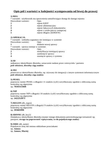 Opis pól i wartości w kolejności występowania od lewej do prawej 1) REG * warunek - użytkownik ma uprawnienia umożliwiające dostęp do danego rejestru Dozwolone wartości Opis 1 rejestr KIDT 2 rejestr alimentacyjny 3 rejestr fałszywych dokumentów 4 rejestr z tytułu pieczy zastępczej 5 rejestr długów (EDKKW) 2) OPERACJA * warunek - unikalna sygnatura nie istniejąca w systemie Dozwolone wartości Opis 1 dodanie nowej sprawy * warunek - sprawa istnieje w systemie Dozwolone wartości Opis 2 modyfikacja istniejącej sprawy 3 zamknięcie sprawy 4 usunięcie sprawy z systemu 3) ID unikatowy identyfikator dłużnika, oznaczenie nadane przez wierzyciela / partnera pole tekstowe, dowolny ciąg znaków 4) ID2 pomocniczy identyfikator dłużnika, np. używany do integracji z innym systemem informatycznym pole tekstowe, dowolny ciąg znaków 5) PESEL poprawny numer PESEL o długości 11 znaków (cyfr) weryfikowany zgodnie z obliczoną sumą kontrolną wg algorytmu np. 78103115660 6) NIP poprawny numer NIP o długości 10 znaków (cyfr) weryfikowany zgodnie z obliczoną sumą kontrolną wg algorytmu np. 2422252073 7) REGON (db_regon) poprawny numer REGON o długości 9 znaków (cyfr) weryfikowany zgodnie z obliczoną sumą kontrolną wg algorytmu np. 393603998 8) IDINNE (db_key2) Dodatkowy identyfikator dłużnika (numer innego dokumentu potwierdzającego tożsamość np. paszport, uwaga na poprawność wpisywania, co do pojedynczego znaku) 9) IMIE (db_name) Pojedyncze imię lub imiona oddzielone przecinkami np. Janusz np. Janusz, Maciej 10) NAZWISKO (db_surname) Pojedyncze nazwisko lub kilka nazwisk połączonych myślnikiem np. Frąckowiak np. Nowak-Łabądź 11) ADRES (db_address) nazwa ulicy, nr domu / nr mieszkania np. ul. Konopnickiej 15/7 12) KODPOCZTOWY (db_postcode) poprawny kod pocztowy w formacie DD-DDD (gdzie D to pojedyncza cyfra) np. 20-235 13) MIEJSCOWOSC (db_city) poprawna nazwa miejscowości lub miasta np. Warszawa 14) KRAJ (db_country) poprawna nazwa państwa, dozwolone znaki oprócz liter (myślnik, nawiasy pół-okrągłe) np. Polska 15) FIRMA (db_company_name) nazwa firmy np. Auto-komis „Samochodzik” S.p Z.o.o 16) REJESTRAD (db_administrative_register) ewidencja podmiotu gospodarczego pole tekstowe, nazwa własna 17) NRREJESTRAD (db_administrative_register_no) numer w ewidencji podmiotu gospodarczego związane z poprzednim polem, numer w tejże ewidencji ! opcjonalne, wypełnić jeśli rozróżniamy dodatkowo adres korespondencyjny, w przypadku gdy różni się z adresem zamieszkania / zameldowania) ! 18) KORESPADRES nazwa ulicy, nr domu / nr mieszkania 19) KORESPKODP poprawny kod pocztowy w formacie DD-DDD (gdzie D to pojedyncza cyfra) 20) KORESPMIEJSCOWOSC poprawna nazwa miejscowości lub miasta 21) KORESPKRAJ poprawna nazwa państwa 22) IDTYPDLUZNIKA 1 Osoba fizyczna (konsument) 2 Osoba fizyczna prowadząca działalność gospodarczą 3 Podmiot posiadający osobowość prawną 4 Forma nieokreślona (traktowany jako osoba fizyczna) 23) SYGNATURA jeśli pominięta, wygenerowana automatycznie z kolejnym numerem przez system w formacie SYG/[lp]/[miesiąc]/[rok]/[idpartnera] np. SYG/14332/3/2016/5 (możliwe użycie własnej sygnatury) ! wartości dla kwot pieniężnych podajemy wyrażone w groszach, zostaną one zinterpretowane jako wartości pieniężne przesuwając przecinek dwa miejsca w lewo ! ! to jaka waluta zostanie użyta wpisujemy w IDWALUTA (1 dla PLN) ! 24) NALEZNA kwota należna 26) ZALEGLA kwota zaległości 27) KWESTIONOWANA kwota kwestionowana np. 12345 (słownie sto dwadzieścia trzy złote i czterdzieści pięć groszy) ! data w formacie ISO 8601 -> RRRR-MM-DD (D dzień M miesiąc R rok) ! 25) DATAPOWSTANIA data powstania zaległości 28) DATAWYMAGANA wymagana data zapłaty 30) DATATYTUL data wezwania do zapłaty 31) DATASTART data utworzenia sprawy 32) DATASTOP data zakończenia sprawy np. 2016-09-03 (trzeci września 2016) 29) ORGAN nazwa organu orzekającego, pole tekstowe 33) IDSTATUS 1 Po pierwszym wezwaniu do zapłaty 2 Drugie wezwanie do zapłaty 3 Nie jest toczone postępowanie sądowe 4 W trakcie postępowania przed sądem 5 Wydano orzeczenie - nakaz zapłaty 6 Egzekucja sądowa 34) IDTYTUL 1 Wezwanie do zapłaty 2 Tytuł egzekucyjny 35) IDWALUTA 1 PLN (polski złoty) 2 USD (amerykański dolar) 3 EUR (euro) 4 GBP (funt brytyjski) 36) IDKATEGORIA 1 Zaległość 2-miesięczna (warunki płatności) 2 Zaległość 3-miesięczna (warunki płatności) 3 Przekroczona wartość zaległości (warunki płatności) 4 Błędne dane osobowe (niesolidność / oszustwo) 5 Przekroczenie warunków umowy (niesolidność / oszustwo) 6 Fraud (kradzież impulsów) 7 Zaległość alimentacyjna 8 Fałszerstwo dokumentów 9 Dłużnik z tytułu pieczy zastępczej 44) OPIS dodatkowy opis odnośnie sprawy, komentarz, szczegóły, notatki etc. pole tekstowe ! używane tylko w rejestrze dokumentów (3) ! 37) DOKUMENT 38) SERIANR 39) DATAWYDANIA 40) WYSTAWCA 41) POSIADACZ 42) DOKINFO 43) DOKORGAN nazwa dokumentu, tekst seria i numer dokumentu, tekst data wystawienia dokumentu (data w formacie ISO 8601 RRRR-MM-DD np. 2016-08-26) oznaczenia i dane wystawcy dokumentu. tekst dane osób, których dotyczy dokument, tekst dodatkowe informacje, tekst dane organu stwierdzającego nieprawidłowości, tekst