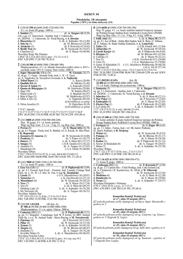 DZIEŃ 30 Niedziela, 18 sierpnia Pogodnie (+28°C), tor lekko elastyczny (2,9) 1 (239) 11 550 zł (6600-2640-1320-660-330) 4 l. i st. konie III grupy. 1600 m 1. Sambor (5) dż. A. Turgaev 62 (9,20) wał. c.gn. 4 l. Zarewitsch - Sambia, hod. J. Cukrowski, wł. ZIGPOL - J. Cukrowski, St. Trend Racing, tr J. Siwonia 2. Bissectrisa (4) k. dż. A. Kabardov 58 (13,49) 3. Solo Su (1) dż. M. Březina 62 (22,49) 4. Aischylos (3) dż. P. Krowicki 62 (8,43) 5. Really Fast (6) dż. W. Szymczuk 56 (16,87) 6. Charisma (2) dż. S. Mazur 54 (44,98) Wycofany Keep The Promise. 1’40.6” (8.3-32.6-30.5-29.2); pew.; 1¼-1¼-½-¾-3. ZWC 9,20 DWJ 37,20 TRJ 78,30 zł. 2 (240) 10 500 zł (6000-2400-1200-600-300) Międzynarodowa. 4 l. i st. kłusaki francuskie (sulki), które w 2013 r. uzyskały sumę 1451 € i więcej. Start wolny. 2400 m 1. Super Morainville (FRA) (4) W. Górniak (20,37) kl. sk.gn. 7 l. Gogo - Jurande Gede, hod. J., H. i E. Enos, wł. A. Najderska, St. Szczęśliwa Gwiazda, tr A. Najderski 2. Tribal Dance (1) Ł. Kuryś (20,99) 3. Qualida Pat (6) H. Miksha (31,48) 4. Saveur d’Anjou (9) A. Kupczak (25,65) 5. Quana de Bourgogne (8) M. Ostrowska (28,86) 6. Saga (10) W. Kałuża (49,47) 7. Pepite Gede (7) S. Bagiński (62,97) 8. Rani d’Orge (5) M. Matkowska (62,97) 0. Siblis d’Alci (2) A. Najderski (86,58) dyskwalifikacja za galop 0. Nitisa Josselyn (3) D. Ostrycharz (6,18) dyskwalifikacja za galop 3’15.6”; rekordy: 1’21.5”/1’21.9”/1’22.1”/1’22.5”/1’22.7”/1’23.5”/1’23.8”/1’24.8” ZWC 20,30 DWJ 118,30 PDK 44,50 TRJ 710,70 CZW 1853,80 zł. 3 (241) 8400 zł (4800-1920-960-480-240) Hcp. III grupy. 4 l. i st. konie arabskie. Wagi wg Hcp. Gen.: 5 l. i st. +3 kg, 4 l. wg Hcp. Gen. 2000 m 1. Pyrrus (8) dż. S. Mazur 64½ (26,70) og. gn. 6 l. Fangan - Paola, hod. K. Bukład, wł. G. Kozak, St. Max-Plast, tr K. Rogowski 2. Kasnarra El Amarna (2) dż. W. Szymczuk 62 (6,88) 3. Pradoria (3) dż. V. Popov 61 (16,77) 4. Dancer (7) k. dż. S. Mura 60½ (37,37) 5. Sangus (5) (-3) B. Giedyk 62½ (10,22) 6. Amadeia (1) dż. A. Turgaev 61 (27,83) 7. Maradonna (4) (-1) A. Falchi 58 (40,88) Wycofany Elburs. 2’24.2” (39.4-35.9-33.6-35.3); w wal.; łeb-k.łeb-1¾-łeb-5-2. ZWC 26,60 DWJ 80,00 PDK 30,80 TRJ 418,60 TPL 371,20 zł. 4 (242) 9800 zł (5600-2240-1120-560-280) 3 l. i st. konie IV grupy. 1300 m 1. Easy Go (GB) (1) dż. P. Piątkowski 63 (5,09) og. gn. 4 l. Exceed And Excel - Trennial, hod. Laundry Cottage Stud Farm, wł. J., D., W. i Ż. Sito, St. Tim, tr mgr K. Ziemiański 2. Luzak (8) (-1) A. Mazurkiewicz 56 (20,07) 3. Tematyka (2) u. K. Grzybowski 62 (23,12) 4. Moonshiner (6) dż. W. Szymczuk 59 (28,25) 5. Nere (7) dż. S. Mazur 59 (17,54) 6. Test (5) k. dż. S. Mura 60 (69,35) 7. Drinking Lady (3) k. dż. A. Kabardov 56 (76,28) 8. My Necessity (4) dż. A. Turgaev 60 (56,51) Wycofany Atlantic Star. 1’19” (18.5-29.3-31.2); b.łat.; 2-½-¾-1¾-5-16-6. ZWC 5,00 DWJ 19,10 PDK 15,10 TRJ 54,60 zł. 5 (243) ST. LEGER LR (kat. A) 87 500 zł (50 000-20 000-10 000-5000-2500) Międzynarodowa. 3 l. i st. ogiery i klacze. 2800 m 1. Camerun (IRE) (1) dż. P. Piątkowski 60 (5,51) og. gn. 5 l. Singspiel - Cantaloupe, hod. W. P. Iceton, wł. BHT Animal Trade Sp. z o.o., St. Animal Trade - Horse Racing, tr M. Nowakowski 2. Patronus (4) dż. P. Krowicki 54 (12,81) 3. Pillar (8) dż. W. Szymczuk 54 (11,54) 4. Tymon (5) k. dż. A. Kabardov 54 (45,53) 5. Toogris (6) dż. M. Březina 60 (40,47) 6. Dżulietta (7) dż. A. Turgaev 58 (76,24) 7. Invisible Dubai (3) k. dż. A. Mazurkiewicz 60 (46,83) Wycofana Frenchie Lebec. 2’55.4” (21.3-30.6-30.5-31.3-31.6-30.1); pew.; ¾-1-szy.-szy.-9-3. ZWC 5,50 DWJ 11,40 PDK 8,30 TRJ 11,70 zł. 6 (244) 6650 zł (3800-1520-760-380-190) Hcp. IV grupy. 4 l. i st. konie arabskie hodowli krajowej wpisane do Polskiej Księgi Stadnej Koni Arabskich Czystej Krwi (PASB). Wagi wg Hcp. Gen.: 5 l. i st. +9 kg, 4 l. +6 kg. 1600 m 1. Salih Amir (6) k. dż. S. Mura 58 (28,57) og. gn. 4 l. Ace of Bask - Safira Bint Sudani, hod. K. Bieg i Z. Tobiasz, wł. Z. Tobiasz, St. Stado Nedżdy Kuhailan, tr A. Laskowski 2. Zolin (10) (-3) B. Giedyk 60½ (12,84) 3. Akbaretka (9) dż. W. Szymczuk 59 (30,54) 4. Carski Kurjer (4) dż. P. Piątkowski 64 (8,95) 5. Hiszpan (5) dż. M. Březina 64½ (23,94) 6. Cedrolia (1) dż. S. Mazur 56 (32,21) 7. Nea (2) (-4) K. Grzybowski 61½ (24,60) 8. Citus (3) (-1) A. Mazurkiewicz 55 (70,86) 9. Ganas Al Khalediah (7) (-1) L. Reznikova-Wróblewska 50 (40,26) 10. Perenna (8) (-4) A. Gil 45 (57,14) 1’50.9” (7.8-32.5-34.6-36); s.wys.; 1¾-2-1-nos-4-2½-1¾-6-1¾. ZWC 28,50 DWJ 229,90 PDK 80,40 TRJ 2304,60 CZW nie traf. KWN 4708,30 TPL 72,40 zł. 7 (245) DEER LEAPA (kat. B) 42 000 zł (24 000-9600-4800-2400-1200) 3 l. i st. konie. Nadwagi nie są stosowane. 1300 m 1. Samareto (5) dż. A. Turgaev 53½ (43,11) og. gn. 3 l. Zarewitsch - Sambia, hod. J. Cukrowski, wł. ZIGPOL - J. Cukrowski, St. Trend Racing, tr J. Siwonia 2. Inheritor (3) k. dż. S. Mura 60 (22,11) 3. Star Poker (2) dż. P. Krowicki 57 (3,82) 4. Endorphin (4) dż. S. Mazur 56 (23,62) 5. Electro Pop (1) dż. P. Piątkowski 58 (22,69) 6. La Caletta (6) k. dż. A. Kabardov 52 (90,77) 1’17” (18-27.8-31.2); w wal.; łeb-łeb-2½-4-6. ZWC 43,10 DWJ 1442,00 TRJ 1366,20 zł. 8 (246) 12 600 zł (7200-2880-1440-720-360) 3 l. konie arabskie II grupy hodowli krajowej wpisane do Polskiej Księgi Stadnej Koni Arabskich Czystej Krwi (PASB). 1800 m 1. Fortunat (4) dż. V. Popov 58 (6,42) og. gn. 3 l. Sabat - Furina, hod. i wł. SK Janów Podlaski, St. Janów Podlaski, tr B. Strójwąs 2. Wakat (6) dż. W. Szymczuk 58 (8,53) 3. Pampas (2) dż. M. Březina 58 (51,17) 4. Ezar (5) dż. S. Mazur 58 (38,38) 5. Katina (3) dż. P. Piątkowski 58 (31,33) 6. Nowar Al Khalediah (8) dż. A. Turgaev 58 (20,47) 7. Mima (7) k. dż. A. Kabardov 56 (35,70) Wycofany Wilges. 2’10.7” (22.2-37-35.7-35.8); wys.; 2-½-3-1-2½-7. ZWC 6,40 DWJ 13,30 PDK 5,90 TRJ 49,30 zł. 9 (247) 16 625 zł (9500-380