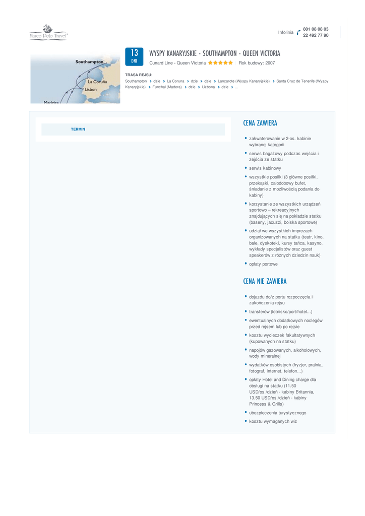 Infolinia 13 WYSPY KANARYJSKIE - SOUTHAMPTON - QUEEN VICTORIA DNI Cunard Line - Queen Victoria 801 08 08 03 22 492 77 90 | Rok budowy: 2007 TRASA REJSU: TERMIN Southampton dzie Kanaryjskie) Funchal (Madera) La Coruna dzie dzie dzie Lizbona Lanzarote (Wyspy Kanaryjskie) dzie Santa Cruz de Tenerife (Wyspy ... CENA ZAWIERA zakwaterowanie w 2-os. kabinie wybranej kategorii serwis bagażowy podczas wejścia i zejścia ze statku serwis kabinowy wszystkie posiłki (3 główne posiłki, przekąski, całodobowy bufet, śniadanie z możliwością podania do kabiny) korzystanie ze wszystkich urządzeń sportowo – rekreacyjnych znajdujących się na pokładzie statku (baseny, jacuzzi, boiska sportowe) udział we wszystkich imprezach organizowanych na statku (teatr, kino, bale, dyskoteki, kursy tańca, kasyno, wykłady specjalistów oraz guest speakerów z różnych dziedzin nauk) opłaty portowe CENA NIE ZAWIERA dojazdu do/z portu rozpoczęcia i zakończenia rejsu transferów (lotnisko/port/hotel...) ewentualnych dodatkowych noclegów przed rejsem lub po rejsie kosztu wycieczek fakultatywnych (kupowanych na statku) napojów gazowanych, alkoholowych, wody mineralnej wydatków osobistych (fryzjer, pralnia, fotograf, internet, telefon...) opłaty Hotel and Dining charge dla obsługi na statku (11.50 USD/os./dzień - kabiny Britannia, 13.50 USD/os./dzień - kabiny Princess & Grills) ubezpieczenia turystycznego kosztu wymaganych wiz