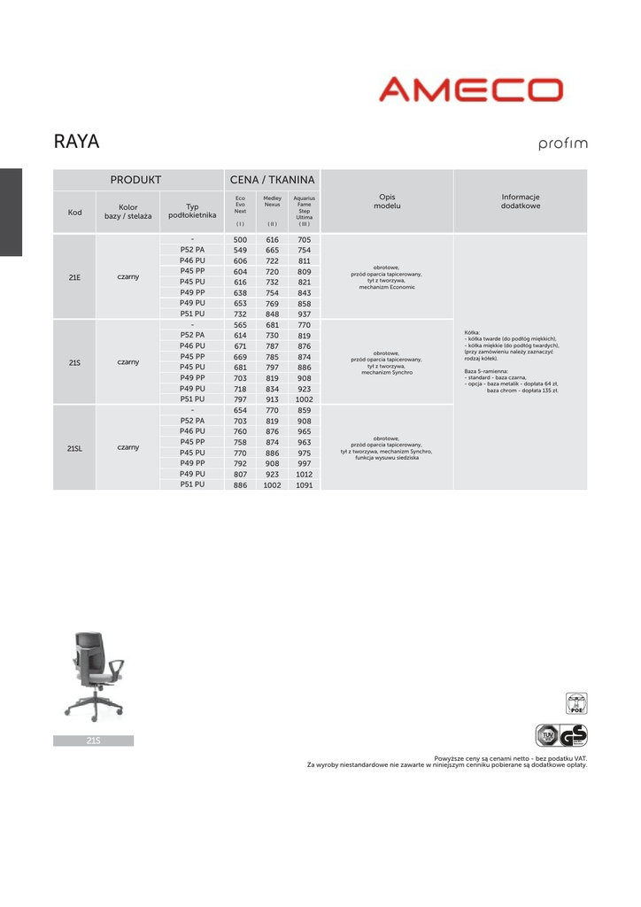 RAYA CENA / TKANINA PRODUKT Kolor bazy / stelaża Kod czarny 21E czarny 21S czarny 21SL Typ podłokietnika P52 PA P46 PU P45 PP P45 PU P49 PP P49 PU P51 PU P52 PA P46 PU P45 PP P45 PU P49 PP P49 PU P51 PU P52 PA P46 PU P45 PP P45 PU P49 PP P49 PU P51 PU Eco Evo Next Medley Nexus (I) ( II ) Aquarius Fame Step Ultima ( III ) 500 549 606 604 616 638 653 732 565 614 671 669 681 703 718 797 654 703 760 758 770 792 807 886 616 665 722 720 732 754 769 848 681 730 787 785 797 819 834 913 770 819 876 874 886 908 923 1002 705 754 811 809 821 843 858 937 770 819 876 874 886 908 923 1002 859 908 965 963 975 997 1012 1091 Opis modelu Informacje dodatkowe obrotowe, przód oparcia tapicerowany, tył z tworzywa, mechanizm Economic obrotowe, przód oparcia tapicerowany, tył z tworzywa, mechanizm Synchro Kółka: - kółka twarde (do podłóg miękkich), - kółka miękkie (do podłóg twardych), (przy zamówieniu należy zaznaczyć rodzaj kółek). Baza 5-ramienna: - standard - baza czarna, - opcja - baza metalik - dopłata 64 zł, baza chrom - dopłata 135 zł. obrotowe, przód oparcia tapicerowany, tył z tworzywa, mechanizm Synchro, funkcja wysuwu siedziska 21S Powyższe ceny są cenami netto - bez podatku VAT. Za wyroby niestandardowe nie zawarte w niniejszym cenniku pobierane są dodatkowe opłaty. RAYA CENA / TKANINA PRODUKT Kolor bazy / stelaża Kod czarny 23E czarny 23S czarny 23SL Typ podłokietnika P52 PA P46 PU P45 PP P45 PU P49 PP P49 PU P51 PU P52 PA P46 PU P45 PP P45 PU P49 PP P49 PU P51 PU P52 PA P46 PU P45 PP P45 PU P49 PP P49 PU P51 PU Eco Evo Next Medley Nexus (I) ( II ) Aquarius Fame Step Ultima ( III ) 525 574 631 629 641 663 678 757 590 639 696 694 706 728 743 822 679 728 785 783 795 817 832 911 651 700 757 755 767 789 804 883 716 765 822 820 832 854 869 948 805 854 911 909 921 943 958 1037 758 807 864 862 874 896 911 990 823 872 929 927 939 961 976 1055 912 961 1018 1016 1028 1050 1065 1144 Opis modelu Informacje dodatkowe obrotowe, oparcie w całości tapicerowane, mechanizm Economic obrotowe, oparcie w całości tapicerowane, mechanizm Synchro Kółka: - kółka twarde (do podłóg miękkich), - kółka miękkie (do podłóg twardych), (przy zamówieniu należy zaznaczyć rodzaj kółek). Baza 5-ramienna: - standard - baza czarna, - opcja - baza metalik - dopłata 64 zł, baza chrom - dopłata 135 zł. obrotowe, oparcie w całości tapicerowane, mechanizm Synchro, funkcja wysuwu siedziska 23SL Powyższe ceny są cenami netto - bez podatku VAT. Za wyroby niestandardowe nie zawarte w niniejszym cenniku pobierane są dodatkowe opłaty. RAYA PODŁOKIETNIKI CENA za komplet Opis modelu czarny 49 Podłokietnik stały, poliamidowy. PU czarny 106 Podłokietnik stały, poliuretanowy. PP czarny 104 Podłokietnik regulowany góra-dół (zakres regulacji 70 mm), nakładka polipropylenowa. PU czarny 116 Podłokietnik regulowany góra-dół (zakres regulacji 70 mm), nakładka poliuretanowa. PP czarny 138 Podłokietnik regulowany góra-dół (zakres regulacji 70 mm), nakładka przód-tył (+/- 18 mm), nakładka polipropylenowa. PU czarny 153 Podłokietnik regulowany góra-dół (zakres regulacji 70 mm), nakładka przód-tył (+/- 18 mm), nakładka poliuretanowa. PU czarny 232 Podłokietnik regulowany góra-dół (zakres regulacji 100 mm), regulacja odległości od siedziska (zakres regulacji 19 mm na stronę), nakładka poliuretanowa. Kod Typ nakładki Kolor stelaża P52 PA P46 P45 P49 P51 RAYA 21 RAYA 23 Powyższe ceny są cenami netto - bez podatku VAT. Za wyroby niestandardowe nie zawarte w niniejszym cenniku pobierane są dodatkowe opłaty. RAYA 970-1140 680 420 680 Dane techniczne 680 420 P45 200-270 P46 220 P49 170-240 P51 170-270 P52 210 690 450 (440) 670 0,20 m3 420 480 21E / 23E 6 550-620 680 (ø 720) 16,5 14,0 460-560 (400-500) 460 500 970-1140 480 21S / 23S 6 500-570 680 (ø 720) 18,5 16,0 460-560 (400-500) P45 200-270 450 (440) 640 0,20 m3 690 P46 220 P49 170-240 P51 170-270 P52 210 460 500 1000-1170 480 P45 200-270 P46 220 P49 170-240 P51 170-270 P52 210 390-440 (440) 640 460 0,20 m3 690 21SL / 23SL 6 540-610 680 (ø 720) 20,0 17,5 480-580 (420-520) 500 RAYA CENA / TKANINA PRODUKT Kod Kolor bazy / stelaża czarny 21H metalik chrom / satyna czarny 23H metalik chrom / satyna czarny 21V metalik chrom / satyna czarny 23V metalik chrom / satyna 21H / 23H Typ podłokietnika P46 PU P46 PU P46 PU P46 PU P46 PU P46 PU P46 PU P46 PU P46 PU P46 PU P46 PU P46 PU Eco Evo Next Medley Nexus (I) ( II ) Aquarius Fame Step Ultima ( III ) 449 555 456 562 520 626 474 580 481 587 545 651 449 555 457 563 539 645 474 580 482 588 564 670 565 671 572 678 636 742 600 706 607 713 671 777 565 671 573 679 655 761 600 706 608 714 690 796 654 760 661 767 725 831 707 813 714 820 778 884 654 760 662 768 744 850 707 813 715 821 797 903 Opis modelu Informacje dodatkowe konferencyjne, na nogach, przód oparcia tapicerowany, tył z tworzywa konferencyjne, na nogach, oparcie w całości tapicerowane konferencyjne, na płozie, przód oparcia tapicerowany, tył z tworzywa Kółka: - kółka twarde (do podłóg miękkich), - kółka miękkie (do podłóg twardych), (przy zamówieniu należy zaznaczyć rodzaj kółek). W modelach RAYA 21H/23H: - w standardzie kółka lub stopki, - w zamówieniu należy wyraźnie zaznaczyć wersję. konferencyjne, na płozie, oparcie w całości tapicerowane 21V / 23V Powyższe ceny są cenami netto - bez podatku VAT. Za wyroby niestandardowe nie zawarte w niniejszym cenniku pobierane są dodatkowe opłaty. RAYA Dane techniczne 610 610 420 420 450 (440) 500 540 530 530 590 21H / 23H 16,5 590 21V / 23V 16,0 690 1030 13,5 670 980 500 (430) 500 (430) 670 980 540 450 (440) 480 500 480 690 1030 13,0 0,50 m3 0,50 m3