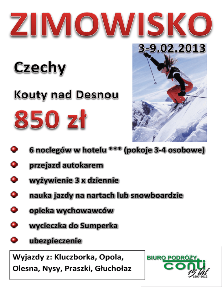 6 noclegów w hotelu *** (pokoje 3-4 osobowe) przejazd autokarem wyżywienie 3 x dziennie nauka jazdy na nartach lub snowboardzie opieka wychowawców wycieczka do Sumperka ubezpieczenie Wyjazdy z: Kluczborka, Opola, Olesna, Nysy, Praszki, Głuchołaz Kompleks narciarski Kouty to największy ośrodek narciarski na Morawach posiadający pierwszą sześcioosobową kolejkę krzesełkową w Czechach. Kolejka jest w stanie obsłużyć 3200 osób na godzinę. Czas dojazdu na górę wynosi 6 min 48 sek. Kompleks oferuje cztery trasy zjazdowe, w tym dwie o długości ponad 2 km i wyjątkowej szerokości ponad 50 m. Hotel Dlouhé Stráně - duży hotel, oferujący łącznie 700 miejsc; zakwaterowanie w pokojach w \budynku \Górnym** w pokojach 3-4 osobowych z prysznicem i WC oraz w segmentach 2-pokojowych z prysznicem i WC. W hotelu znajduje się restauracja, jadalnia, basen kryty, sauna, stoły do tenisa, świetlice z TV. W odległości 500 metrów od hotelu znajduje się stok narciarski i wyciąg (300m). Cena zawiera przejazd autokarem; zakwaterowanie: 6 noclegów w Budynku Górnym ** wyżywienie: 3 posiłki dziennie (pobyt zaczyna się obiadem, a kończy śniadaniem + prowiant na drogę powrotną) opiekę kwalifikowanych przez Kuratorium Oświaty wychowawców naukę i doskonalenie jazdy na nartach lub snowboardzie pod opieką jeżdżących na nartach wychowawców zabawy, zawody i konkursy wejście na basen kryty wycieczkę autokarową do Śumperka ubezpieczenie Info narciarskie Zajęcia jazdy na nartach odbywać się będą w 3 grupach (początkującej, średnio-zaawansowanej, zaawansowanej), warunkiem przystąpienia do zajęć jest sprawny sprzęt narciarski (istnieje możliwość wypożyczenia na miejscu w cenie ok. 190 zł (narty, buty, kijki) za 6 dni Karnety: ok. 1000 – 2800 kć w zależności od poziomu zaawansowania jazdy na nartach Istnieje możliwość kupienia dodatkowego ubezpieczenia: SPRZĘTU (do 1100 EUR) + OC RZECZOWE (do 3000 EURO) + OC OSOBOWE (do 15 000 EURO) Cena za dodatkowe ubezpieczenie / dziecko / pobyt: 30 PLN Obowiązkowo uczestnik musi posiadać KASK (istnieje możliwość wypożyczenia na miejscu) ZIMOWISKO RODZINNE: Osoba dorosła jadąca z dzieckiem: 720 zł (6 noclegów, przejazd autokarem, wyżywienie 2x dziennie, ubezpieczenie)