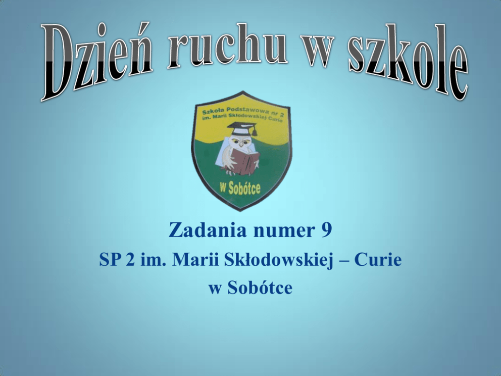 Zadania numer 9 SP 2 im. Marii Skłodowskiej – Curie w Sobótce 08.10.2014 r. w naszej szkole był Dniem Ruchu. W zajęciach brało udział 126 uczniów obecnych w danym dniu z klas 0 – VI, nauczyciele edukacji wczesnoszkolnej: mgr Bogumiła Mankiewicz, mgr Anna Górniak, mgr Beata Zmyślona, mgr Renata Błahuta oraz nauczycielka wychowania fizycznego mgr Anna Zuchowska. Przed zawodami odbyła się rozgrzewka , a następnie zawodnicy udali się na wyznaczone stanowiska do poszczególnych konkurencji. Uczniowie wzajemnie sobie kibicowali . Pomimo rywalizacji panował przyjacielski nastrój Zaplanowane zajęcia : zostały następujące - klasa 0 – warsztaty taneczne dla - klasy I – III trójbój składający się z rzutów piłeczką, skokiem w dal oraz biegiem na 60 m. - klasy V–VI trójbój lekkoatletyczny składający się z rzutów piłeczką, skokiem w dal oraz biegiem na 60 m. - klasy IV – VI – zajęcia taneczne oraz zabawy sportowe. Zajęcia taneczne na małej sali gimnastycznej dla chętnych uczniów klas 0 - IV Zabawy sprawnościowe kl. V - VI Nauczycielka wychowania fizycznego, p. Anna Zuchowska przeprowadziła w kl. IV – VI trójbój lekkoatletyczny, na który składały się następujące konkurencje: skok w dal, bieg na 60 m, rzut piłeczką palantową. Uzyskane przez uczniów wyniki zostały przez nauczycielkę omówione i podsumowane. Wśród dziewcząt i chłopców wybrano po troje najsprawniejszych uczniów Poniżej przedstawiamy tabelę z wynikami niektórych uczniów. Zawody w trójboju lekkoatletycznym chłopców w SP2 w Sobótce 08.10.14 Zawody w trójboju lekkoatletycznym dziewcząt kl. IV – VI SP2 Sobótka 08.10.14 Uczniowie z klas V- VI, którzy nie brali udziału w trójboju lekkoatletycznym uczestniczyli w konkurencjach sportowych oraz zajęciach tanecznych na dużej hali sportowej. Po zakończeniu zawodów zostały wręczone medale dla dla zwycięzców poszczególnych grup wiekowych. Klasa II Klasa I Klasa IV Klasa III Dzień Ruchu w szkole był bardzo aktywnym dniem. Uczniowie jak i nauczyciele, przy pięknej pogodzie jak na tę porę roku, miło i przyjemnie spędzili ten czas. Uczniowie byli zaangażowani i zdyscyplinowani jak na sportowców przystoi. Pomimo zmęczenia dzieci pozytywnie oceniły ten dzień pełen zajęć. Na podstawie informacji uzyskanych od nauczycieli opracowały Renata Błahuta, Melania Sitkiewicz