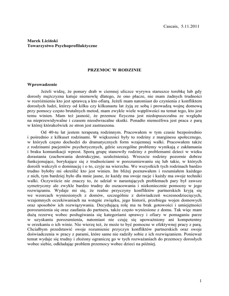Cascais, 5.11.2011 Marek Liciński Towarzystwo Psychoprofilaktyczne PRZEMOC W RODZINIE Wprowadzenie Jeżeli widzę, że ponury drab w ciemnej uliczce wyrywa staruszce torebkę lub gdy dorosły mężczyzna katuje niemowlę dlatego, że ono płacze, nie mam żadnych trudności w rozróżnieniu kto jest sprawcą a kto ofiarą. Jeżeli mam natomiast do czynienia z konfliktem dorosłych ludzi, którzy od kilku czy kilkunastu lat żyją ze sobą i prowadzą wojnę domową przy pomocy często brutalnych metod, mam zwykle wiele wątpliwości na temat tego, kto jest temu winien. Mam też jasność, że przemoc fizyczna jest niedopuszczalna ze względu na nieprzewidywalne i czasem nieodwracalne skutki. Ponadto niemożliwa jest praca z parą w której którakolwiek ze stron jest zastraszona. Od 40-tu lat jestem terapeutą rodzinnym. Pracowałem w tym czasie bezpośrednio i pośrednio z kilkuset rodzinami. W większości były to rodziny z marginesu społecznego, w których często dochodzi do dramatycznych form wzajemnej walki. Pracowałem także z rodzinami pacjentów psychotycznych, gdzie szczególne problemy wynikają z zakłamania i braku komunikacji wprost. Sporą grupę stanowiły rodziny z problemami dzieci w wieku dorastania (zachowania destrukcyjne, uzależnienia). Wreszcie rodziny pozornie dobrze funkcjonujące, borykające się z trudnościami w porozumiewaniu się lub takie, w których dorośli walczyli o dominację i o to, czyje na wierzchu. We wszystkich tych rodzinach bardzo trudno byłoby mi określić kto jest winien. Im bliżej poznawałem i rozumiałem każdego z nich, tym bardziej było dla mnie jasne, że każdy ma swoje racje i każdy ma swoje techniki walki. Oczywiście nie znaczy to, że udział w narastających problemach pary był zawsze symetryczny ale zwykle bardzo trudny do oszacowania i niekoniecznie pomocny w jego rozwiązaniu. Wydaje mi się, że realne przyczyny konfliktów partnerskich kryją się we wzorcach wyniesionych z domów, szczególnie z doświadczeń wczesnodziecięcych, wzajemnych oczekiwaniach na wstępie związku, jego historii, przebiegu wojen domowych oraz sposobów ich rozwiązywania. Decydującą rolę ma tu brak gotowości i umiejętności porozumienia się oraz zaufania do partnera, także często wyniesione z domu. Tak więc mam dużą rezerwę wobec posługiwania się kategoriami sprawcy i ofiary w pomaganiu parze w uzyskaniu porozumienia, natomiast nie czuję się upoważniony ani kompetentny w orzekaniu o ich winie. Nie wierzę też, że może to być pomocne w efektywnej pracy z parą. Chciałbym przedstawić swoje rozumienie przyczyn konfliktów partnerskich oraz swoje doświadczenia w pracy z parami, które same nie radziły sobie z ich rozwiązaniem. Ponieważ temat wydaje się trudny i złożony ograniczę go w tych rozważaniach do przemocy dorosłych wobec siebie, odkładając problem przemocy wobec dzieci na później. 1 Wczesne przyczyny konfliktów partnerskich W ciągu ostatnich 100-150 lat realne funkcje rodziny oraz relacje pomiędzy jej członkami uległy radykalnej zmianie. Rodzina przestała być formą życia zabezpieczającą możliwość biologicznego przeżycia jej członkom, szczególnie starym, kobietom i dzieciom. Poza rodziną nie mieli oni zbytnich szans przetrwania. Dzisiaj rodzina zaspokaja raczej tylko potrzeby psychologiczne, szczególnie emocjonalne. Nie wymaga więc tak bezwzględnie lojalności, zgodności i starannego podziału ról. Dzisiaj jest też wiele instytucji społecznych gwarantujących zaspokojenie podstawowych potrzeb słabszym: dzieciom, biednym, chorym, starym czy samotnym. Kiedyś, ze względu na znacznie krótszy czas życia, rodzina trwała zaledwie dwadzieścia parę lat i rzadko była 3-pokoleniowa. Dzisiaj często może trwać 50-60 lat i zwykle jest 3-4-pokoleniowa. Dawniej kobieta pod wieloma względami była zależna od mężczyzny. Częściej on dysponował wspólną własnością, był lepiej wykształcony, miał jasny status społeczny itp. Dzisiaj kobieta ma takie same prawa jak mężczyzna, coraz częściej nie ustępuje mu pod względem wykształcenia, zarobków, pozycji społecznej, natomiast jeśli tylko chce może całkowicie kontrolować prokreację decydując o statusie i sytuacji rodziny. Dzieci chowa się nie poprzez dawanie im wskazówek i prawienie morałów. Żyjąc z nami na co dzień biorą z nas wzór i niejako „nasiąkają” nami. Niestety przejmują wszystkie nasze cechy: i te dobre i złe, i te jawne i te nieświadome. Jeżeli wierzyć wynikom współczesnych badań psychoneurologicznych szczególne znaczenie w kształtowaniu charakteru dziecka mają najwcześniejsze lata. Potem coraz większe znaczenie mają jego własne doświadczenia, w których nadal zresztą odgrywamy niepoślednią rolę. Tak więc to dziedzictwo kulturowe przekazujemy następnym pokoleniom przede wszystkim w ich wczesnym dzieciństwie. Zanim swoim własnym dorosłym życiem i doświadczeniem zdołamy zweryfikować i uadekwatnić przekazane nam przez naszych rodziców wzorce i wartości. Kiedy około pięćdziesiątki zaczynamy rozumieć otaczający nas świat i prawidłowości nim rządzące, wtedy właśnie nasze dwudziestoparoletnie dzieci programują nasze wnuki. Niestety nieświadomie przekazują im wzorce i wyobrażenia, które we wczesnym dzieciństwie, równie nieświadomie przejęli od nas. Mechanizm tego przekazu gwarantuje jego ciągłość, ale uniemożliwia szybką adaptację do współczesnych realiów. Weryfikacja tych wzorców następuje z paropokoleniowym opóźnieniem powodując w naszych, często nieświadomych oczekiwaniach, wobec siebie i innych wiele sprzeczności i nieporozumień. Kobieta chciałaby zarazem mieć równe prawa do kariery, niezależności, wpływu i równego udziału w dorobku a jednocześnie opiekę, ochronę i taryfę ulgową. Mężczyzna chciałby dominować, decydować, być niezależnym i wolnym od obowiązków domowych a zarazem oczekuje prawa do 