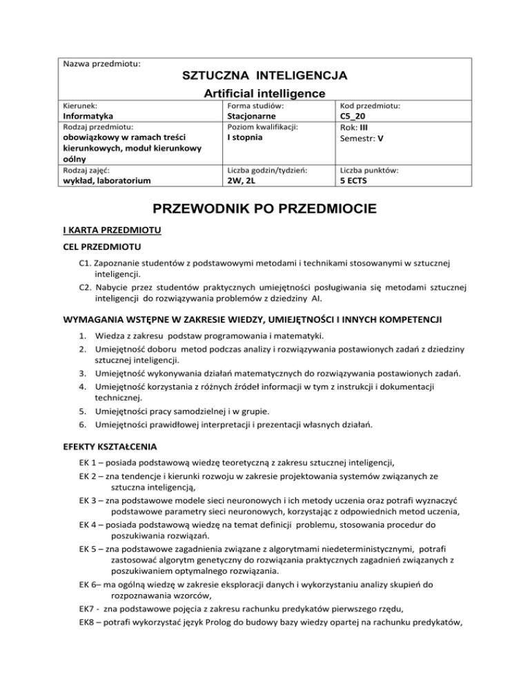 Nazwa przedmiotu: SZTUCZNA INTELIGENCJA Artificial intelligence Kierunek: Forma studiów: Kod przedmiotu: Informatyka Stacjonarne Rodzaj przedmiotu: Poziom kwalifikacji: obowiązkowy w ramach treści kierunkowych, moduł kierunkowy oólny I stopnia C5_20 Rok: III Semestr: V Rodzaj zajęć: Liczba godzin/tydzień: Liczba punktów: wykład, laboratorium 2W, 2L 5 ECTS PRZEWODNIK PO PRZEDMIOCIE I KARTA PRZEDMIOTU CEL PRZEDMIOTU C1. Zapoznanie studentów z podstawowymi metodami i technikami stosowanymi w sztucznej inteligencji. C2. Nabycie przez studentów praktycznych umiejętności posługiwania się metodami sztucznej inteligencji do rozwiązywania problemów z dziedziny AI. WYMAGANIA WSTĘPNE W ZAKRESIE WIEDZY, UMIEJĘTNOŚCI I INNYCH KOMPETENCJI 1. Wiedza z zakresu podstaw programowania i matematyki. 2. Umiejętność doboru metod podczas analizy i rozwiązywania postawionych zadań z dziedziny sztucznej inteligencji. 3. Umiejętność wykonywania działań matematycznych do rozwiązywania postawionych zadań. 4. Umiejętność korzystania z różnych źródeł informacji w tym z instrukcji i dokumentacji technicznej. 5. Umiejętności pracy samodzielnej i w grupie. 6. Umiejętności prawidłowej interpretacji i prezentacji własnych działań. EFEKTY KSZTAŁCENIA EK 1 – posiada podstawową wiedzę teoretyczną z zakresu sztucznej inteligencji, EK 2 – zna tendencje i kierunki rozwoju w zakresie projektowania systemów związanych ze sztuczna inteligencją, EK 3 – zna podstawowe modele sieci neuronowych i ich metody uczenia oraz potrafi wyznaczyć podstawowe parametry sieci neuronowych, korzystając z odpowiednich metod uczenia, EK 4 – posiada podstawową wiedzę na temat definicji problemu, stosowania procedur do poszukiwania rozwiązań. EK 5 – zna podstawowe zagadnienia związane z algorytmami niedeterministycznymi, potrafi zastosować algorytm genetyczny do rozwiązania praktycznych zagadnień związanych z poszukiwaniem optymalnego rozwiązania. EK 6– ma ogólną wiedzę w zakresie eksploracji danych i wykorzystaniu analizy skupień do rozpoznawania wzorców, EK7 - zna podstawowe pojęcia z zakresu rachunku predykatów pierwszego rzędu, EK8 – potrafi wykorzystać język Prolog do budowy bazy wiedzy opartej na rachunku predykatów, EK9 – zna podstawowe zagadnienia związane z przetwarzaniem języka naturalnego, syntezy mowy oraz sieci semantycznych, EK 10 – posiada ogólna wiedzę w zakresie logiki rozmytej i budowy systemów rozmytych, EK11 – zna podstawowe zagadnienia z systemów eksperckich i robotyki, EK 12 – potrafi przygotować sprawozdanie z przebiegu realizacji ćwiczeń. TREŚCI PROGRAMOWE Forma zajęć – WYKŁADY W 1 – Wprowadzenie do AI, historia rozwoju oraz przykładowe projekty. W 2 – Sztuczne sieci neuronowe jednokierunkowe, ich modele i uczenie. W 3 – Sztuczne sieci neuronowe samoorganizujące się, ich modele i uczenie. W 4 – Metody szukania nieukierunkowanego. W 5 – Metody szukania heurystycznego. W 6 – Gry planszowe, przykładowe algorytmy. W 7 – Algorytmy niedeterministyczne. W 8 – Eksploracja danych z wykorzystaniem analizy skupień. W 9 – Podstawy rachunku predykatów pierwszego rzędu. W 10 – Sieci semantyczne W 11 – Przetwarzanie języka naturalnego, synteza mowy. W 12 – Podstawy teorii logiki rozmytej. W 13 – Sterowniki rozmyte W 14 – Systemy eksperckie, budowa i przykłady zastosowań. W 15 – Robotyka, podstawowe pojęcia i przykłady zastosowań. Forma zajęć – LABORATORIUM L 1 – Wprowadzenie do środowiska Scilab. L 2 – Tworzenie zbiorów uczących liniowo-separowalnych. L 3 – Zaprojektowanie sieci neuronowej jednowarstwowej. L 4 – Uczenie i testowanie sieci jednowarstwowej, prezentacja otrzymanych wyników. L 5 – Zaprojektowanie sieci neuronowej wielowarstwowej. L 6 – Uczenie i testowanie sieci wielowarstwowej, prezentacja otrzymanych wyników. L 7 – Zaprojektowanie sieci neuronowej samoorganizującej się. L 8 – Uczenie i testowanie sieci samoorganizującej się. L 9 – Algorytm genetyczny – tworzenie populacji początkowej, kodowanie osobników. L 10 – Algorytm genetyczny – realizacja metody selekcji osobników. L 11 – Implementacja algorytmu genetycznego z przykładową funkcją celu. L 12 – Język Prolog – wprowadzenie do języka. L 13 – Język Prolog – zapisywanie faktów, reguł oraz wykonywanie zapytań. L 14 – Zastosowanie języka Prolog do znajdowanie rozwiązań przykładowych zadań. L 15 – Zastosowanie języka Prolog do budowy prostego systemu ekspertowego. Liczba godzin 2 2 2 2 2 2 2 2 2 2 2 2 2 2 2 Liczba godzin 2 2 2 2 2 2 2 2 2 2 2 2 2 2 2 NARZĘDZIA DYDAKTYCZNE 1. – wykład z wykorzystaniem prezentacji multimedialnych 2. – ćwiczenia laboratoryjne, opracowanie sprawozdań z realizacji przebiegu ćwiczeń 3. – przykładowe programy realizujące techniki sztucznej inteligencji 4. – środowisko programistyczne do symulacji metod sztucznej inteligencji 5. – instrukcje do wykonania ćwiczeń laboratoryjnych 2 SPOSOBY OCENY ( F – FORMUJĄCA, P – PODSUMOWUJĄCA) F1. – ocena przygotowania do ćwiczeń laboratoryjnych F2. – ocena umiejętności stosowania zdobytej wiedzy podczas wykonywania ćwiczeń F3. – ocena sprawozdań z realizacji ćwiczeń objętych programem nauczania F4. – ocena aktywności podczas zajęć P1. – ocena umiejętności rozwiązywania postawionych problemów oraz sposobu prezentacji uzyskanych wyników – zaliczenie na ocenę* P2. – ocena opanowania materiału nauczania będącego przedmiotem wykładu – zaliczenie wykładu (lub egzamin) *) warunkiem uzyskania zaliczenia jest otrzymanie pozytywnych ocen ze wszystkich ćwiczeń laboratoryjnych, OBCIĄŻENIE PRACĄ STUDENTA Forma aktywności Godziny kontaktowe z prowadzącym Średnia liczba godzin na zrealizowanie aktywności 30W 30L 60 h Godziny konsultacji z prowadzącym 5h Zapoznanie się ze wskazaną literaturą 20 h Przygotowanie do ćwiczeń laboratory