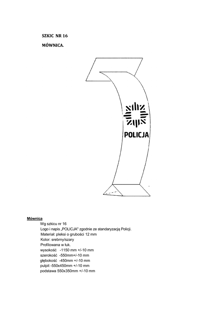 Mównica Wg szkicu nr 16 Logo i napis „POLICJA" zgodnie ze standaryzacją Policji. Materiał: pleksi o grubości 12 mm Kolor: srebrny/szary Profilowana w łuk. wysokość -1150 mm +/-10 mm szerokość -550mm+/-10 mm głębokość -450mm +/-10 mm pulpit -550x450mm +/-10 mm podstawa 550x350mm +/-10 mm