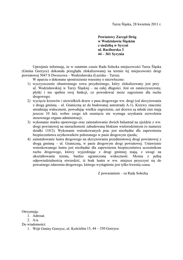 Turza Śląska, 28 kwietnia 2011 r. Powiatowy Zarząd Dróg w Wodzisławiu Śląskim z siedzibą w Syryni ul. Raciborska 3 44 – 361 Syrynia Uprzejmie informuję, że w ostatnim czasie Rada Sołecka miejscowości Turza Śląska (Gmina Gorzyce) dokonała przeglądu zlokalizowanej na terenie tej miejscowości drogi powiatowej 5047 S Dworcowa – Wodzisławska (Łaziska – Turza). W oparciu o dokonane spostrzeżenia wnosimy o niezwłoczne: 1) wyczyszczenie obustronnego rowu przydrożnego, który zlokalizowany jest przy ul. Wodzisławskiej w Turzy Śląskiej – na całej długości. Jest on zanieczyszczony, płytki i nie spełnia swej funkcji, co powodować może zagrożenie dla ruchu drogowego; 2) wycięcie krzewów i niewielkich drzew z pasa drogowego ww. drogi (od skrzyżowania z drogą gminną – ul. Graniczną aż do budowanej autostrady A-1). Krzewy znacznie utrudniają widoczność, powodując wielkie zagrożenie, zaś drzewa są młode (nie mają jeszcze 10 lat), wobec czego ich usunięcie nie wymaga uzyskania zezwolenia stosownego organu administracji; 3) wykonanie murku oporowego oraz zainstalowanie dwóch balustrad na zjeździe z ww. drogi powiatowej na nieruchomość zabudowaną blokiem wielorodzinnym (o numerze działki 110/2). Wykonanie wnioskowanych prac jest niezbędne dla zapewnienia bezpieczeństwa użytkowników położonego w pasie drogowym zjazdu; 4) zainstalowanie lustra drogowego na skrzyżowaniu przedmiotowej drogi powiatowej z drogą gminną – ul. Graniczną, w pasie drogowym drogi powiatowej. Ustawienie wnioskowanego lustra jest niezbędne dla zapewnienia bezpieczeństwa uczestnikom ruchu drogowego, którzy wyjeżdżając z drogi gminnej mają, z uwagi na ukształtowanie terenu, bardzo ograniczoną widoczność. Można z pełną odpowiedzialnością stwierdzić, iż brak lustra w ww. miejscu przyczyni się do poważnego zdarzenia drogowego, którego wystąpienie jest tylko kwestią czasu. Z poważaniem – za Radę Sołecką Otrzymują: 1. Adresat. 2. A/a. Do wiadomości: 1. Wójt Gminy Gorzyce, ul. Kościelna 15, 44 – 350 Gorzyce.