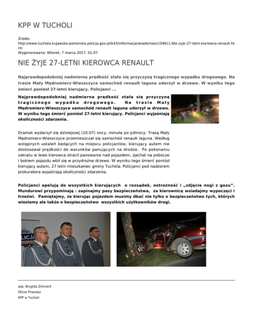 KPP W TUCHOLI Źródło: http://www.tuchola.kujawsko-pomorska.policja.gov.pl/k43/informacje/wiadomosci/34611,Nie-zyje-27-letni-kierowca-renault.ht ml Wygenerowano: Wtorek, 7 marca 2017, 01:07 NIE ŻYJE 27-LETNI KIEROWCA RENAULT Najprawdopodobniej nadmierna prędkość stała się przyczyną tragicznego wypadku drogowego. Na trasie Mały Mędromierz-Wieszczyce samochód renault laguna uderzył w drzewo. W wyniku tego śmierć poniósł 27-letni kierujący. Policjanci ... Najprawdopodobniej nadmierna prędkość stała się przyczyną tragicznego wypadku drogowego. Na trasie Mały Mędromierz-Wieszczyce samochód renault laguna uderzył w drzewo. W wyniku tego śmierć poniósł 27-letni kierujący. Policjanci wyjaśniają okoliczności zdarzenia. Dramat wydarzył się dzisiejszej (10.07) nocy, minutę po północy. Trasą Mały Mędromierz-Wieszczyce przemieszczał się samochód renault laguna. Według wstępnych ustaleń będących na miejscu policjantów, kierujący autem nie dostosował prędkości do warunków panujących na drodze. Po pokonaniu zakrętu w lewo kierowca stracił panowanie nad pojazdem, zjechał na pobocze i bokiem pojazdu wbił się w przydrożne drzewo. W wyniku tego śmierć poniósł kierujący autem, 27 letni mieszkaniec gminy Tuchola. Policjanci pod nadzorem prokuratora wyjaśniają okoliczności zdarzenia. Policjanci apelują do wszystkich kierujących o rozsądek, ostrożność i „zdjęcie nogi z gazu”. Mundurowi przypominają : zapinajmy pasy bezpieczeństwa, za kierownicę wsiadajmy wypoczęci i trzeźwi. Pamiętajmy, że kierując pojazdem musimy dbać nie tylko o bezpieczeństwo tych, których wieziemy ale także o bezpieczeństwo wszystkich użytkowników drogi. asp. Brygida Zimnoch Oficer Prasowy KPP w Tucholi Autor: red2.kppt Publikacja: red2.kppt Ocena: 0/5 (0) Tweetnij