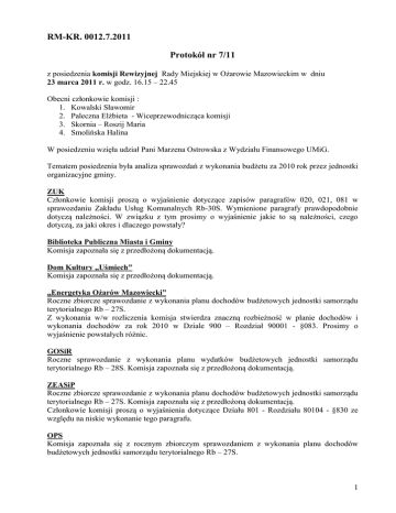 RM-KR. 0012.7.2011 Protokół nr 7/11 z posiedzenia komisji Rewizyjnej Rady Miejskiej w Ożarowie Mazowieckim w dniu 23 marca 2011 r. w godz. 16.15 – 22.45 Obecni członkowie komisji : 1. Kowalski Sławomir 2. Paleczna Elżbieta - Wiceprzewodnicząca komisji 3. Skornia – Roszij Maria 4. Smolińska Halina W posiedzeniu wzięła udział Pani Marzena Ostrowska z Wydziału Finansowego UMiG. Tematem posiedzenia była analiza sprawozdań z wykonania budżetu za 2010 rok przez jednostki organizacyjne gminy. ZUK Członkowie komisji proszą o wyjaśnienie dotyczące zapisów paragrafów 020, 021, 081 w sprawozdaniu Zakładu Usług Komunalnych Rb-30S. Wymienione paragrafy prawdopodobnie dotyczą należności. W związku z tym prosimy o wyjaśnienie jakie to są należności, czego dotyczą, za jaki okres i dlaczego powstały? Biblioteka Publiczna Miasta i Gminy Komisja zapoznała się z przedłożoną dokumentacją. Dom Kultury „Uśmiech” Komisja zapoznała się z przedłożoną dokumentacją. „Energetyka Ożarów Mazowiecki” Roczne zbiorcze sprawozdanie z wykonania planu dochodów budżetowych jednostki samorządu terytorialnego Rb – 27S. Z wykonania w/w rozliczenia komisja stwierdza znaczną rozbieżność w planie dochodów i wykonania dochodów za rok 2010 w Dziale 900 – Rozdział 90001 - §083. Prosimy o wyjaśnienie powstałych różnic. GOSiR Roczne sprawozdanie z wykonania planu wydatków budżetowych jednostki samorządu terytorialnego Rb – 28S. Komisja zapoznała się z przedłożoną dokumentacją. ZEASiP Roczne zbiorcze sprawozdanie z wykonania planu dochodów budżetowych jednostki samorządu terytorialnego Rb – 27S. Komisja zapoznała się z przedłożoną dokumentacją. Członkowie komisji proszą o wyjaśnienia dotyczące Działu 801 - Rozdziału 80104 - §830 ze względu na niskie wykonanie tego paragrafu. OPS Komisja zapoznała się z rocznym zbiorczym sprawozdaniem z wykonania planu dochodów budżetowych jednostki samorządu terytorialnego Rb – 27S. 1 Następnie komisja zajęła się analizą dostarczonej na dzisiejsze posiedzenie dokumentacji. Członkowie komisji ponownie wrócili do pism przedłożonych przez Dyrektora ZUK dotyczących realizacji umów w związku z dodatkowymi wyjaśnieniami z dnia 23 marca 2011 r. a dotyczącymi wydatkowania środków związanych z rozliczeniem, przedmiotów umów: a) Oczyszczanie terenu Miasta i Gminy b) Konserwacja kanalizacji deszczowej Ze sprawozdań dostarczonych przez Dyrektora w dniu 23.03.2011 r. wynika, że rozdysponowanie środków finansowych będących przedmiotem umowy przedstawiało się w sposób następujący: 1. Zimowe utrzymanie - 197.900 zł 2. Oczyszczanie terenu - 571.125 zł 3. Konserwacja zieleni - 134.000 zł 4. Konserwacja zieleni na cmentarzach - 21.000 zł co daje łączną kwotę 924.025 zł, natomiast na podstawie rozliczenia tej samej umowy dostarczonego przez Dyrektora ZUK w dniu 15.02.2011 r. rozliczenie środków finansowych na przedmiot umowy przedstawiało się w sposób następujący: 1. Wynagrodzenia + pochodne - 726.567 zł 2. Materiały, usługi - 197.458 zł co daje ogólną kwotę 924.025 zł Podobna sytuacja ma miejsce w przypadku rozliczenia umowy dotyczącej konserwacji kanalizacji deszczowej. Na podstawie rozliczenia tej umowy dostarczonej komisji w dniu 23.03.2011 r. pismem ZUK/120/2011, rozliczenie przedmiotu umowy przedstawia się w następujący sposób: 1. Konserwacja sieci kanalizacji deszczowej - 181.760 zł 2. Konserwacja i czyszczenie separatorów ulicznych - 12.100 zł 3. Obsługa i konserwacja osłon na przepustach - 2.000 zł co daje łączną kwotę 195.860 zł, natomiast w zestawieniu widnieje kwota 195.531,55 zł, natomiast na podstawie rozliczenia tej samej umowy dostarczonego przez Dyrektora ZUK w dniu 15.02.2011 r. rozliczenie środków finansowych na przedmiot umowy przedstawiało się w sposób następujący: 1. Wynagrodzenia pracowników + pochodne - 181.760 zł 2. Usługi specjalistyczne - 12.100 zł 3. Wymiana i uzupełnienie kradzionych elementów żeliwnych - 1.671,55 zł co daje łączną kwotę 195.531,55 zł Następnie komisja dokonała analizy dostarczonych przez Dyrektora ZUK faktur dokumentujących realizację przedmiotowych umów. Faktury nie precyzują zakresu wykonanych robót, nie są opisane. Sumowane kwoty z przedstawionych faktur bilansują się z kwotami zawartymi w przedmiocie umów. Treści faktur nie uwzględniają jakichkolwiek wydatków poniesionych na wynagrodzenia w związku z realizacją tych umów, a informację taką otrzymała komisja pismem z dnia 15 lutego 2011 roku. Ponadto, co komisja zaznaczyła w poprzednich protokołach, przedmiotem zarówno jednej jak i drugiej umowy nie były kwoty przysługujące na wynagrodzenia z tytułu realizacji tych umów. W związku z powyższym komisja składa wniosek do Burmistrza oraz do Przewodniczącej Rady o zajęcie stanowiska w sprawie rozbieżności w rozliczeniach realizacji przedmiotu w/w umów zawartych między UMiG a ZUK w roku 2010. W załączeniu kserokopie dokumentacji przedłożonej przez ZUK – zał. nr 1. Komisja w dalszym ciągu nie otrzymała informacji dotyczącej przyczyn wykazanej różnicy w wysokości kwot wykazanych notami księgowymi i protokołami przekazania na doposażenie punktów dożywiania w placówkach oświatowych przez OPS. 2 Komisja zwraca się z wnioskiem do Pana Burmistrza o wyjaśnienie prawidłowości sposobu rozliczenia kwot przekazanych przez OPS na dofinansowanie punktów dożywiania w placówkach oświatowych tj. Szkole Podstawowej Nr1 w Ożarowie Mazowieckim, Szkole Podstawowej i Gimnazjum w Płochocinie oraz doposażenie 3 istniejących punktów żywieniowych (jakich to punktów dotyczy?). W załączeniu kserokopie dokumentacji dostarczonej przez OPS – zał. nr 2. Komisja w dalszym ciągu nie otrzymała szczegółowej wartości poszczególnych sprzętów opisanych w protokole zdawczo – odbiorczym, zgodnie z fakturą na kwotę 327.143 zł (b