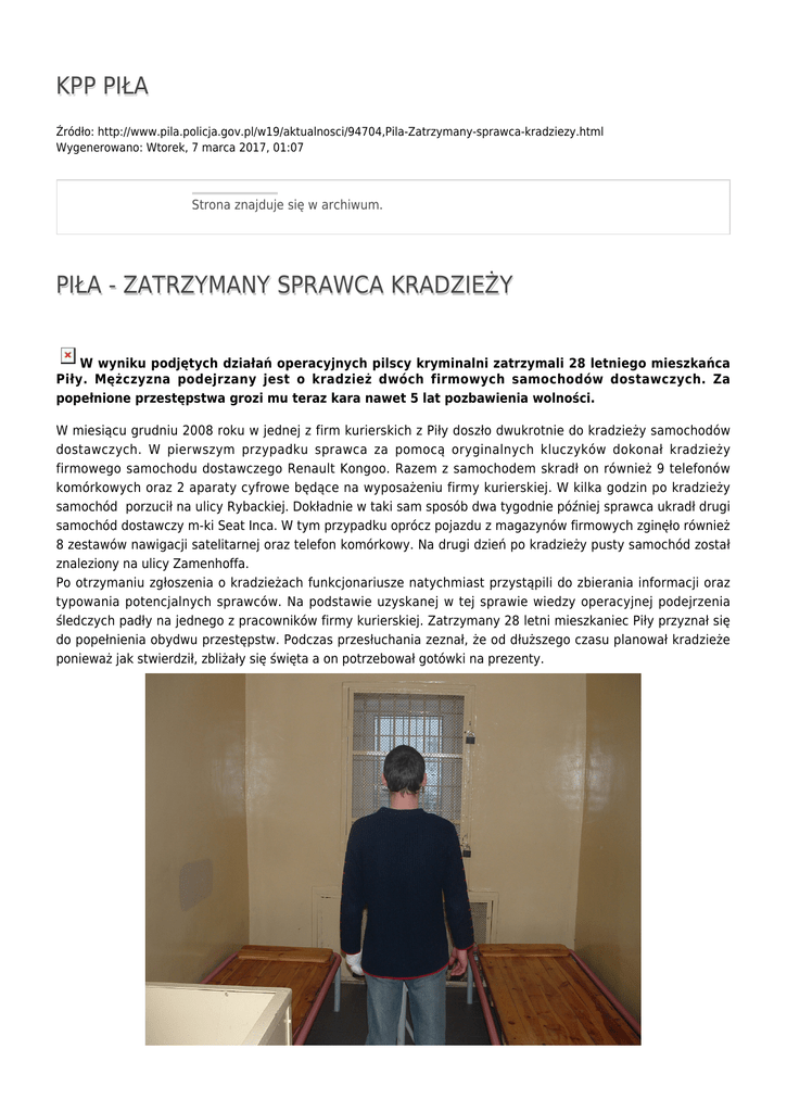 KPP PIŁA Źródło: http://www.pila.policja.gov.pl/w19/aktualnosci/94704,Pila-Zatrzymany-sprawca-kradziezy.html Wygenerowano: Wtorek, 7 marca 2017, 01:07 Strona znajduje się w archiwum. PIŁA - ZATRZYMANY SPRAWCA KRADZIEŻY W wyniku podjętych działań operacyjnych pilscy kryminalni zatrzymali 28 letniego mieszkańca Piły. Mężczyzna podejrzany jest o kradzież dwóch firmowych samochodów dostawczych. Za popełnione przestępstwa grozi mu teraz kara nawet 5 lat pozbawienia wolności. W miesiącu grudniu 2008 roku w jednej z firm kurierskich z Piły doszło dwukrotnie do kradzieży samochodów dostawczych. W pierwszym przypadku sprawca za pomocą oryginalnych kluczyków dokonał kradzieży firmowego samochodu dostawczego Renault Kongoo. Razem z samochodem skradł on również 9 telefonów komórkowych oraz 2 aparaty cyfrowe będące na wyposażeniu firmy kurierskiej. W kilka godzin po kradzieży samochód porzucił na ulicy Rybackiej. Dokładnie w taki sam sposób dwa tygodnie później sprawca ukradł drugi samochód dostawczy m-ki Seat Inca. W tym przypadku oprócz pojazdu z magazynów firmowych zginęło również 8 zestawów nawigacji satelitarnej oraz telefon komórkowy. Na drugi dzień po kradzieży pusty samochód został znaleziony na ulicy Zamenhoffa. Po otrzymaniu zgłoszenia o kradzieżach funkcjonariusze natychmiast przystąpili do zbierania informacji oraz typowania potencjalnych sprawców. Na podstawie uzyskanej w tej sprawie wiedzy operacyjnej podejrzenia śledczych padły na jednego z pracowników firmy kurierskiej. Zatrzymany 28 letni mieszkaniec Piły przyznał się do popełnienia obydwu przestępstw. Podczas przesłuchania zeznał, że od dłuższego czasu planował kradzieże ponieważ jak stwierdził, zbliżały się święta a on potrzebował gotówki na prezenty. Zatrzymany mężczyzna był już wcześniej notowany przez policję. Teraz za kradzież grozi mu kara nawet 5 lat pozbawienia wolności. Ocena: 0/5 (0) Tweetnij