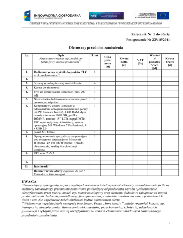 PROJEKT WSPÓŁFINANSOWANY PRZEZ UNIĘ EUROPEJSKĄ Z EUROPEJSKIEGO FUNDUSZU ROZWOJU REGIONALNEGO Załącznik Nr 1 do oferty Postępowanie Nr ZP/15/2011 Oferowany przedmiot zamówienia Lp. Opis Nazwa asortymentu, typ, model, nr katalogowy, nazwa producenta*) Il. szt. Radiometryczny czytnik do pasków TLC w ukompletowaniu: *) 1 2. Screeny o podwyższonej rozdzielczości 4 3. Kaseta do ekspozycji 1 4. Płyn do przemywania screenów (min. 200 ml) Naświetlarka do kasowania screenów przed ponownym użyciem Komputerowy zestaw sterujący z odpowiednim oprogramowaniem nie gorszy niż PC Procesor Intel i5, 4 GB RAM, dysk twardy minimum 1000 GB, grafika 1024MB, monitor 19" LCD, napęd DVDRW, mysz optyczną, klawiaturę, system operacyjny MS Windows 7 Professional, 4 x USB 2.0 pakiet MS Office 1 I. Cena jedn. netto [zł] Kwota netto [zł] VAT [%} Wartoś ć podatku VAT [zł] Kwota brutto [zł] 1. 5. 6. 7. 8. 9. Oprogramowanie specjalistyczne pracujące pod systemem operacyjnym Microsoft Windows XP Pro lub Windows 7 Pro do obrazowania, analizy i archiwizacji wyników UPS min. 2 kVA 1 1 1 1 1 n. II. Inne koszty**) Razem wartość oferty (wpisana do pkt 1 Formularza Ofertowego) UWAGA *) Zamawiający wymaga aby w poszczególnych wierszach tabeli wymienić elementy ukompletowania (o ile są możliwe) zamawianego przedmiotu zamówienia pochodzące od producenta wyrobu i jednoznacznie identyfikowalne przez nazwę, model, typ, numer katalogowy oraz elementy dodatkowe zakupione od innych producentów niezbędne do prawidłowego funkcjonowania przedmiotu zamówienia wraz z podaniem ich ilości i cen. Nie wypełnienie tabeli skutkować będzie odrzuceniem oferty. **) Wykonawca wypełnia jeżeli występują inne koszty. Przez „Inne koszty” należy rozumieć koszty: np. transportu, ubezpieczenia, tłumaczenia dokumentów, przechowania, szkolenia, udzielonych gwarancji i rękojmi jeżeli nie są uwzględnione w cenach elementów składowych zamawianego przedmiotu zamówienia. 1 PROJEKT WSPÓŁFINANSOWANY PRZEZ UNIĘ EUROPEJSKĄ Z EUROPEJSKIEGO FUNDUSZU ROZWOJU REGIONALNEGO Opis oferowanego przedmiotu zamówienia Opis przedmiotu zamówienia Wymagania Zamawiającego Wypełnia Wykonawca Radiometryczny czytnik do pasków TLC będzie wykorzystywany do analizowania skanów płytek rozwijanych za pomocą cienkowarstwowej chromatografii TLC w celu badania właściwości otrzymanych nowych radiofarmaceutyków. Urządzenie ma umożliwić rejestrację obrazu płytek wykorzystywanych w radiochromatografii cienkowarstwowej TLC. Opis Wykonawcy Typ: Model: Nazwa producenta: Oferowane urządzenie następujące normy: (system) spełnia (należy wymienić wszystkie wskazując źródła w ofercie) Radiometryczny czytnik do pasków TLC musi spełniać następujące parametry techniczne: Lp. Wymagane możliwość rejestracji w formacie 2-D radionuklidów beta i gamma 1 2 3 Oferowane Zamawiający wymaga aby Wykonawca w swoim opisie dotyczącym poszczególnych punktów Wymagań Zamawiającego podał rzeczywiste dane oferowanego przedmiotu zamówienia wskazując źródła w dokumentacji dołączonej do oferty bez kopiowania informacji z rubryki obok rozdzielczość pozycyjna: • nie gorsza niż 2.5 lp/mm dla CTF=33% dla C-14, • nie gorsza niż 2.5 lp/mm dla CTF=70% dla H-3 możliwość skanowania z zadaną rozdzielczością w granicach: 150 dpi do 600 dpi 2 PROJEKT WSPÓŁFINANSOWANY PRZEZ UNIĘ EUROPEJSKĄ Z EUROPEJSKIEGO FUNDUSZU ROZWOJU REGIONALNEGO czułość dla: • C-14 lepsza niż 2 DPM/mm2/godz • P-32 lepsza niż 1 DPM/mm2/godz • H-3 lepsza niż 3 DPM/mm2/godz 4 5 zakres dynamiki: 1 – 100000 liniowość: +/- 5% std. w całym zakresie dynamiki system skanowania zapewniający stałą odległość (drogę optyczną) podczas odczytu dowolnego punktu screenu możliwość skanowania screenów o powierzchni ponad 530 cm2 czas skanowania dowolnego screenu poniżej 10 min zestaw startowy zawarty w dostawie: • cztery screeny o podwyższonej rozdzielczości, • kaseta do ekspozycji szt.1 • płyn do przemywania screenów (min. 200 ml) • naświetlarka do kasowania screenów przed ponownym użyciem. 6 7 8 9 10 I. Wymagania dodatkowe: Wymagania Zamawiającego Wypełnia Wykonawca 1. Komputerowy zestaw sterujący z Oświadczam, że: odpowiednim oprogramowaniem nie gorszy niż PC Procesor Intel i5, 4 GB RAM, dysk twardy minimum 1000 GB, grafika 1024MB, monitor 19" LCD, napęd DVD-RW, mysz optyczną, klawiaturę, system operacyjny MS Windows 7 Professional, 4 x USB 2.0, pakiet MS Office. 2. Oprogramowanie specjalistyczne pracujące pod systemem operacyjnym Microsoft Windows XP Pro lub Windows 7 Pro do obrazowania, analizy i archiwizacji wyników. 3 PROJEKT WSPÓŁFINANSOWANY PRZEZ UNIĘ EUROPEJSKĄ Z EUROPEJSKIEGO FUNDUSZU ROZWOJU REGIONALNEGO UPS min. 2 kVA. Bateria z czasem podtrzymywania pracy aparatu przy obciążeniu 50% / 30 min i 100% / 15 min. 4. Instrukcje obsługi w języku angielskim lub polskim obejmujące zasadnicze informacje niezbędne dla prawidłowego użytkowania i obsługi przez użytkownika. 5. Zamawiający wymaga udzielenia na dostarczany radiometryczny czytnik do pasków TLC min. 24-miesięcznej gwarancji liczonej od daty realizacji zamówienia. Lokalizacja serwisu musi być w Warszawie. 6. Oferowana aparatura musi być fabrycznie nowa, wyprodukowana w 2011 roku. 7. Naprawa w okresie trwania gwarancji wydłuży okres gwarancji na naprawiane elementy o czas ich naprawy. Jeżeli naprawa uszkodzonego elementu nie będzie możliwa, Wykonawca zrealizuje ją poprzez podmianę uszkodzonego elementu na nowy, bez wad. 8. Wykonawca zapewni serwis pogwarancyjny przez okres co najmniej 5 lat z zapewnieniem części zamiennych. 9. Zamówienie musi być zrealizowane z uruchomieniem radiometrycznego czytnika do pasków TLC, wraz z końcowym przetestowaniem oraz przeszkoleniem personelu Zamawiającego w zakresie obsługi urządzenia (min. 5 osób). 3. ......................................................dnia..........