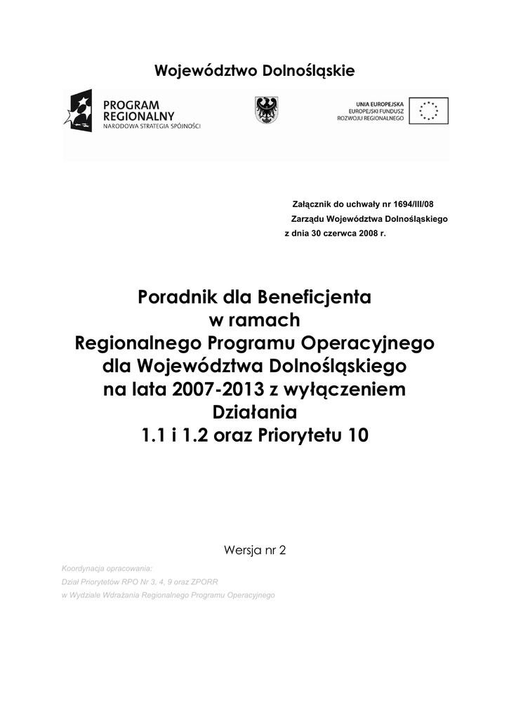 Województwo Dolnośląskie Załącznik do uchwały nr 1694/III/08 Zarządu Województwa Dolnośląskiego z dnia 30 czerwca 2008 r. Poradnik dla Beneficjenta w ramach Regionalnego Programu Operacyjnego dla Województwa Dolnośląskiego na lata 2007-2013 z wyłączeniem Działania 1.1 i 1.2 oraz Priorytetu 10 Wersja nr 2 Koordynacja opracowania: Dział Priorytetów RPO Nr 3, 4, 9 oraz ZPORR w Wydziale Wdrażania Regionalnego Programu Operacyjnego Spis treści Słowniczek 5 Wprowadzenie, cel i zakres Poradnika dla Benenficjenta _______________________ 12 Rozdział 1. Informacje ogólne, podstawowe dokumenty dotyczące RPO WD na lata 2007-2013 ____________________________________________________ 13 1.1.Podstawowe Dokumenty Programowe _____________________________________ 13 1.2.Obszar wsparcia Programu ______________________________________________ 14 1.3.Cel główny Programu ___________________________________________________ 15 1.4.Cele szczegółowe Programu oraz cele Priorytetów ____________________________ 15 1.5.Potencjalni Beneficjenci w ramach RPO WD _________________________________ 16 Rozdział 2. Podmioty uczestniczące w zarządzaniu i wdrażaniu RPO WD i ich główne zadania ______________________________________________________ 18 2.1. Instytucja Zarządzająca RPO WD ________________________________________ 18 2.2. Pozostałe instytucje uczestniczące w procesie realizacji RPO WD _______________ 19 2.2.1.Ministerstwo Rozwoju Regionalnego (MRR) ____________________________ 19 2.2.2. Instytucja Certyfikująca (IC) – Ministerstwo Rozwoju Regionalnego _________ 20 2.2.3.Instytucja Pośrednicząca w Certyfikacji (IPOC)-Wojewoda Dolnośląski _______ 21 2.2.4.Instytucja Audytowa (IA) - Generalny Inspektor Kontroli Skarbowej __________ 21 2.3.Komitet Monitorujący RPO WD (KM RPO WD) ______________________________ 22 2.4.Instytucja, której powierzone zostało wdrażanie części Priorytetu 1 RPO WD – Instytucja Pośrednicząca (IP RPO WD) ________________________________________________ 22 Rozdział 3. Ramowy Plan Realizacji RPO WD ________________________________ 22 Rozdział 4. Podstawowe zasady przygotowania oraz realizacji projektów finansowanych ze środków EFRR w ramach RPO WD na lata 2007-2013 24 4.1.Montaż finansowy _____________________________________________________ 24 4.1.1.Wkład wspólnotowy _______________________________________________ 24 4.1.2.Wkład krajowy ___________________________________________________ 25 4.1.3.Minimalna i maksymalna wartość projektu _____________________________ 30 4.2.Elastyczne finansowanie projektów (cross financing) __________________________ 30 4.3.Partnerstwo w realizacji projektu __________________________________________ 31 4.4.Zlecanie zadań w ramach realizacji projektu _________________________________ 33 4.5.Kwalifikowalność ______________________________________________________ 34 4.5.1.Zasady ogólne ___________________________________________________ 34 4.5.2.Okres kwalifikowalności wydatków ___________________________________ 35 4.5.3.Wydatki niekwalifikowalne na poziomie krajowym ________________________ 36 4.6.Zgodność z politykami horyzontalnymi _____________________________________ 37 4.6.1.Ochrona środowiska i polityka zrównoważonego rozwoju __________________ 38 4.6.2.Równość szans __________________________________________________ 39 4.6.3.Społeczeństwo informacyjne ________________________________________ 39 4.6.4.Polityka konkurencji i zamówień publicznych ___________________________ 40 Strona 1 4.7.Zamówienia Publiczne __________________________________________________ 40 4.8.Rodzaje, zakres i zasady stosowania pomocy publicznej w ramach RPO WD _______ 46 4.9. Trwałość projektu _____________________________________________________ 48 4.10. Projekty generujące dochód ____________________________________________ 49 4.11.Zasady poprawnego przygotowania i wypełnienia formularza wniosku o dofinansowanie projektu w ramach RPO WD 2007-2013 _______________________________________ 50 4.12. Metodologia opracowania Studium Wykonalności ___________________________ 53 4.13. Sposób doboru wskaźników monitoringowych ______________________________ 53 4.14. Najczęściej popełniane błędy ___________________________________________ 57 Rozdział 5. Tryby naboru, ocena i wybór projektów ___________________________ 58 5.1. Tryby naboru projektów ________________________________________________ 58 5.2. Ocena formalna ______________________________________________________ 59 5.3. Ocena merytoryczna ___________________________________________________ 59 5.4.Wybór projektów przez Zarząd Województwa Dolnośląskiego ___________________ 60 Rozdział 6. Nabór i ocena wniosków o dofinansowanie projektów w trybie konkursowym ________________________________________________ 60 6.1. Nabór wniosków ______________________________________________________ 60 6.2. Składanie wniosków ___________________________________________________ 62 6.3. Rejestracja wniosku o dofinansowanie realizacji projektu ______________________ 63 6.4. Ocena formalna ______________________________________________________ 64 6.5. Ocena merytoryczna ___________________________________________________ 67 6.6. Wybór projektów przez Zarząd Województwa Dolnośląskiego ___________________ 68 6.7. Procedura odwoławcza _________________________________________________ 69 Rozdział 7. Nabór i ocena wniosków o dofinansowanie projektów w trybie systemowym _________________________________________________ 72 7.1. Zaproszenie do składania propozycji projektów ______________________________ 72 7.2. Zgłaszanie propozycji projektów w Bazie Projektów Systemowych _______________ 73 7.3. Etap preselekcji_______________________________________________________ 73 7.4. Zaproszenie do składania wniosków o dofinansowanie realizacji projektu __________ 74 7.5.Składanie wniosków o dofinansowanie realizacji projektu oraz rejestrac