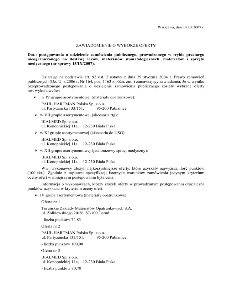 Warszawa, dnia 07.09.2007 r. ZAWIADOMIENIE O WYBORZE OFERTY Dot.: postępowania o udzielenie zamówienia publicznego, prowadzonego w trybie przetargu nieograniczonego na dostawę leków, materiałów stomatologicznych, materiałów i sprzętu medycznego (nr sprawy 15/IX/2007). Działając na podstawie art. 92 ust. 2 ustawy z dnia 29 stycznia 2004 r. Prawo zamówień publicznych (Dz. U. z 2006 r. Nr 164, poz. 1163 z późn. zm. ) zamawiający zawiadamia, Ŝe w wyniku przeprowadzonego postępowania o udzielenie zamówienia publicznego zostały wybrane oferty nw. wykonawców: w IV grupie asortymentowej (materiały opatrunkowe): PAUL HARTMAN Polska Sp. z o.o. ul. Partyzancka 133/151, 95-200 Pabianice w VII grupie asortymentowej (akcesoria rtg): BIALMED Sp. z o.o. ul. Konopnickiej 11a, 12-230 Biała Piska w XI grupie asortymentowej (akcesoria do USG): BIALMED Sp. z o.o. ul. Konopnickiej 11a, 12-230 Biała Piska w XII grupie asortymentowej (jednorazowy sprzęt medyczny): BIALMED Sp. z o.o. ul. Konopnickiej 11a, 12-230 Biała Piska Ww. wykonawcy złoŜyli najkorzystniejsze oferty, które uzyskały najwyŜszą ilość punktów (100 pkt.). Zgodnie z zapisami specyfikacji istotnych warunków zamówienia jedynym kryterium oceny ofert w niniejszym postępowaniu była cena. Informacja o wykonawcach, którzy złoŜyli oferty w prowadzonym postępowaniu oraz liczba punktów uzyskana w kryterium oceny ofert: IV grupa asortymentowa (materiały opatrunkowe) Oferta nr 1 Toruńskie Zakłady Materiałów Opatrunkowych S.A. ul. śółkiewskiego 20/26, 87-100 Toruń - liczba punktów 74,83 Oferta nr 2 PAUL HARTMAN Polska Sp. z o.o. ul. Partyzancka 133/151, 95-200 Pabianice - liczba punktów 100,00 Oferta nr 3 BIALMED Sp. z o.o. ul. Konopnickiej 11a, 12-230 Biała Piska - liczba punktów 80,70 VII grupa asortymentowa (akcesoria rtg): Oferta nr 3 BIALMED Sp. z o.o. ul. Konopnickiej 11a, 12-230 Biała Piska - liczba punktów 100,00 XI grupa asortymentowa (akcesoria do USG) Oferta nr 3 BIALMED Sp. z o.o. ul. Konopnickiej 11a, 12-230 Biała Piska - liczba punktów 100,00 XII grupa asortymentowa (jednorazowy sprzęt medyczny) Oferta nr 3 BIALMED Sp. z o.o. ul. Konopnickiej 11a, 12-230 Biała Piska - liczba punktów 100,00