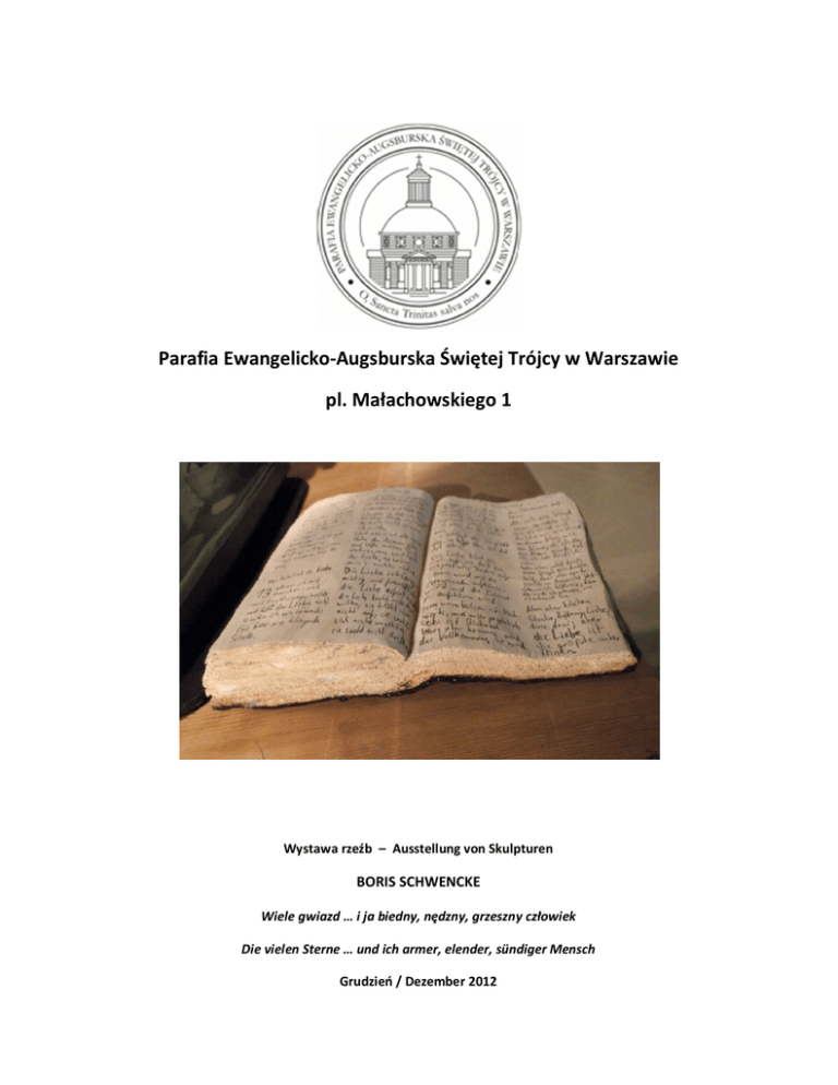 Parafia Ewangelicko-Augsburska Świętej Trójcy w Warszawie pl. Małachowskiego 1 Wystawa rzeźb – Ausstellung von Skulpturen BORIS SCHWENCKE Wiele gwiazd … i ja biedny, nędzny, grzeszny człowiek Die vielen Sterne … und ich armer, elender, sündiger Mensch Grudzień / Dezember 2012 Wiele gwiazd … i ja biedny, nędzny, grzeszny człowiek Rozum!...Jak ważny jest rozum i o ile bardziej interesujące jest to, czego nie rozumiem. Wszechświat i człowiek, Droga Mleczna i odruch prolaktynowy, narodziny, miłość i wyrzuty sumienia, marzenia i wspomnienia, które nieobecne czynią obecnym. To czarujące „nierozumienie” dobrze opisują słowa Immanuela Kanta o dwóch rzeczach, które napełniają umysł/duszę podziwem i czcią: niebo gwiaździste nade mną i prawo moralne we mnie. Obok słów Kanta można znaleźć podobny wyraz zdziwienia w piosence dla dzieci „Wiesz, ile gwiazdek świeci” pochodzącej z ewangelickiego śpiewnika, oraz słowami zaczerpniętymi z tekstu ewangelickiej spowiedzi powszechnej/modlitwy spowiedniej „ja biedny, nędzny, człowiek”. Świat i człowiek – niezrozumiały zewnętrzny Kosmos, któremu przeciwstawia się tak samo tajemniczy Kosmos wewnętrzny. Jak kruchy i czuły jest ten świat wewnętrzny, jak niedoskonały i delikatny – świat w napięciu pomiędzy marzeniami, głupimi myślami, obowiązkami i odpowiedzialnością. Czy świadomość własnej ograniczoności i niedoskonałości nie powinna stawiać nas w roli poszukujących? Skąd rzeźbiarz powinien wiedzieć, jak kierować swoją rękę a człowiek swoim życiem? Z pewnością żadną cnotą nie jest chwalenie się własnymi wadami i słabościami… ale właśnie jak bardzo potrzebujemy czasami mieć możliwość paru głupich przemyśleń i popełniania błędów. Czy zawsze musimy znać odpowiedź na każde pytanie? Boris Schwencke Die vielen Sterne … und ich armer, elender, sündiger Mensch Verstand! ... Wie wichtig ist der Verstand und doch um wie viel interessanter ist das, was ich nicht verstehe. Weltall und Mensch, Milchstraße und Stillreflex, Geburt, Liebe und schlechtes Gewissen, Träume, Gedanken und Erinnerungen, die Abwesendes anwesend machen. Dieses zauberhafte Nichtverstehen kann man vielleicht gut mit Immanuel Kants Worten und seiner immer neu und zunehmenden Bewunderung und Ehrfurcht über den bestirnten Himmel über mir und das moralische Gesetz in mir beschreiben. Ohne Kants Worte findet man vielleicht eine ähnliche Verwunderung in dem Kinderlied „Weißt Du wie viel Sternlein stehen“ aus dem evangelischen Gesangbuch und in der mit den Worten „ich armer, elender, sündiger Mensch“ einsetzenden evangelischen allgemeinen Beichtformel. Welt und Mensch - ein unverständlicher äußerer Kosmos, dem ein ebenso geheimnisvoller innerer Kosmos gegenüber steht. Und wie zerbrechlich und empfindlich ist diese innere Welt, wie unvollkommen und verletzlich sie ist - eine Welt im Spannungsfeld von Träumereien, dummen Gedanken, Pflichten und Verantwortung. Und wie sollte das Bewusstsein der eigenen Begrenztheit und Unvollkommenheit nicht dazu führen, dass wir zu Suchenden werden? Woher sollte ein Bildhauer eine sichere Hand und woher ein Mensch einen sicheren Schritt durchs Leben nehmen? Es ist sicherlich keine Tugend sich der eigenen Schwächen und Laster zu rühmen … und doch … wie sehr brauchen wir die Möglichkeit ein paar dumme Gedanken zu haben, ein bisschen unwissend zu sein und ein paar Fehler im Leben zu begehen. Boris Schwencke