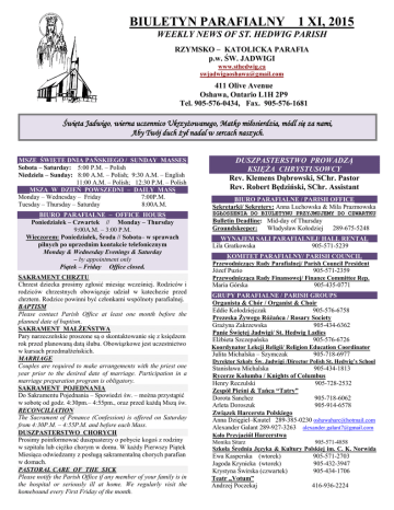 BIULETYN PARAFIALNY 1 XI, 2015 WEEKLY NEWS OF ST. HEDWIG PARISH RZYMSKO – KATOLICKA PARAFIA p.w. ŚW. JADWIGI www.sthedwig.ca [email protected] 411 Olive Avenue Oshawa, Ontario L1H 2P9 Tel. 905-576-0434, Fax. 905-576-1681 Święta Jadwigo, wierna uczennico Ukrzyżowanego, Matko miłosierdzia, módl się za nami, Aby Twój duch żył nadal w sercach naszych. MSZE ŚWIĘTE DNIA PAŃSKIEGO / SUNDAY MASSES Sobota – Saturday: 5:00 P.M. – Polish Niedziela – Sunday: 8:00 A.M. – Polish; 9:30 A.M. – English 11:00 A.M. – Polish; 12:30 P.M. – Polish MSZA W DZIEŃ POWSZEDNI – DAILY MASS Monday – Wednesday – Friday 7:00P.M. Tuesday – Thursday – Saturday 8:00A.M. BIURO PARAFIALNE – OFFICE HOURS Poniedziałek – Czwartek // Monday – Thursday 9:00A.M. – 3:00 P.M. Wieczorem: Poniedziałek, Środa // Sobota– w sprawach pilnych po uprzednim kontakcie telefonicznym Monday & Wednesday Evenings & Saturday – by appointment only Piątek – Friday Office closed. SAKRAMENT CHRZTU Chrzest dziecka prosimy zgłosić miesiąc wcześniej. Rodziców i rodziców chrzestnych obowiązuje udział w katechezie przed chrztem. Rodzice powinni być członkami wspólnoty parafialnej. BAPTISM Please contact Parish Office at least one month before the planned date of baptism. SAKRAMENT MAŁŻEŃSTWA Pary narzeczeńskie proszone są o skontaktowanie się z księdzem rok przed planowaną datą ślubu. Obowiązkowe jest uczestnictwo w kursach przedmałżeńskich. MARRIAGE Couples are required to make arrangements with the priest one year prior to the desired date of marriage. Participation in a marriage preparation program is obligatory. SAKRAMENT POJEDNANIA Do Sakramentu Pojednania – Spowiedzi św. – można przystąpić w sobotę od godz. 4:30pm.– 4:55pm., oraz przed każdą Mszą św. RECONCILIATION The Sacrament of Penance (Confession) is offered on Saturday from 4:30P.M. – 4:55P.M. and before each Mass. DUSZPASTERSTWO CHORYCH Prosimy poinformować duszpasterzy o pobycie kogoś z rodziny w szpitalu lub ciężko chorym w domu. W każdy Pierwszy Piątek Miesiąca odwiedzamy z posługą sakramentalną chorych parafian w domach. PASTORAL CARE OF THE SICK Please notify the Parish Office if any member of your family is in the hospital or seriously ill at home. We regularly visit the homebound every First Friday of the month. DUSZPASTERSTWO PROWADZĄ KSIĘŻA CHRYSTUSOWCY Rev. Klemens Dąbrowski, SChr. Pastor Rev. Robert Będziński, SChr. Assistant BIURO PARAFIALNE / PARISH OFFICE Sekretarki/ Sekretery: Anna Luchowska & Mila Prazmowska ZGŁOSZENIA DO BIULETYNU PRZYJMUJEMY DO CZWARTKU Bulletin Deadline: Mid-day of Thursday Groundskeeper: Władysław Kołodziej 289-675-5248 WYNAJEM SALI PARAFIALNEJ/ HALL RENTAL Lila Gratkowska 905-571-5239 KOMITET PARAFIALNY/ PARISH COUNCIL Przewodniczący Rady Parafialnej/ Parish Council President Józef Puzio 905-571-2359 Przewodnicząca Rady Finansowej/ Finance Committee Rep. Maria Górska 905-435-0771 GRUPY PARAFIALNE / PARISH GROUPS Organista & Chór / Organist & Choir Eddie Kołodziejczak 905-576-6758 Prezeska Żywego Różańca / Rosary Society Grażyna Zakrzewska 905-434-6362 Panie Świętej Jadwigi/ St. Hedwig Ladies Elżbieta Szczepańska 905-576-6726 Koordynator Lekcji Religii/ Religion Education Coordinator Julita Michalska – Szymczak 905-718-6977 Dyrektor Szkoły Św. Jadwigi /Director Polish St. Hedwig’s School Stanisława Michalska 905-434-1813 Rycerze Kolumba / Knights of Columbus Henry Reczulski 905-728-2532 Zespół Pieśni & Tańca “Tatry” Dorota Sanchez 905-718-6062 Arleta Doroszuk 905-914-6578 Związek Harcersta Polskiego Anna Dzięgiel–Knutel 289-385-0230 [email protected] Alexander Galant 289-927-3263 [email protected] Koło Przyjaciół Harcerstwa Monika Sitarz 905-571-4858 Szkoła Średnia Języka & Kultury Polskiej im. C. K. Norwida Ewa Kasperska (wtorek) Jagoda Krynicka (wtorek) Krystyna Świrska (czwartek) Teatr „Votum” Andrzej Poczekaj 905-571-2703 905-432-3947 905-434-1706 416-936-2224 INTENCJE MSZALNE NA 31 NIEDZIELĘ ZWYKŁĄ/ MASS INTENTIONS FOR 31st SUNDAY IN ORDINARY TIME OCTOBER / PAŹDZIERNIK 31, SATURDAY – SOBOTA 5:00PM O światło Ducha Świętego, opiekę Matki Bożej, zdrowie i potrzebne łaski dla Rafała z okazji 30 urodzin – Rodzice i Brat NOVEMBER /LISTOPAD 1 , SUNDAY – NIEDZIELA ~ALL SAINTS DAY – UROCZYSTOŚĆ WSZYSTKICHŚWIĘTYCH~ 8:00AM † Elżbieta (72 rocz. śm.) – Elżbieta z Mężem 9:30AM †† Mary & John Banbula – Daughter 11:00AM † Danuta Stankowska – Siostra Zenia >>> MSZA NA CMENTARZU ZMARTWYCHWSTANIA PAŃSKIEGO <<< 2:00PM †† Za Zmarłe Członkinie z Towarzystwa Różańca Świętego 2:00PM †† Za Zmarłych z Wypominek Nowenna. # 1 NOVEMBER /LISTOPAD 2, MONDAY – PONIEDZIAŁEK ~ALL SOULS’ DAY ~ WSZYSTKICH WIERNYCH ZMARŁYCH~ 8:00AM Intencje Księży 8:00AM Wypominki Nowenna #1 10:00AM W intencjach Ojca Świętego Franciszka 10:00AM † Edmund Krasiński (4 rocz. śm.) – Żona z Rodziną 7:00PM †† Wiktoria Teklak i zmarli z Rodziny – Rodzina 7:00PM †† Krystyna Specht i Wanda Kulczycka – Rodzina Świrskich 8:00PM Bazarowo - Organizacyjne Zebranie NOVEMBER /LISTOPAD 3, TUESDAY – WTOREK 8:00AM Wypominki Nowenna #2 8:00AM † Józef Protasowski – Rodzina NOVEMBER /LISTOPAD 4, WEDNESDAY – ŚRODA 7:00PM Wypominki Nowenna #3 7:00PM †† Józef Protasowski oraz zmarłych z Rodzin: Hodorowicz i Górski – Rodzina NOVEMBER /LISTOPAD 5, THURSDAY – CZWARTEK 8:00AM Wypominki Nowenna #4 8:00AM †† Katarzyna i Wojciech Hodorowicz – Rodzina NOVEMBER /LISTOPAD 6, FIRST FRIDAY – PIERWSZY PIĄTEK 6:00PM Wystawienie Najświętszego Sakramentu & Nabożeństwo Rożańcowe 8:00AM Wypominki Nowenna #5 7:00PM † Danuta Stankowska „Nasza modlitwa za zmarłych nie tylko może im pomóc, lecz także sprawia, że staje się skuteczne ich wstawiennictwo za nami.” Katechizm Kościoła Katolickiego . NOVEMBER /LISTOPAD 7, SATURDAY – SOBOTA 8:00AM Wypomink