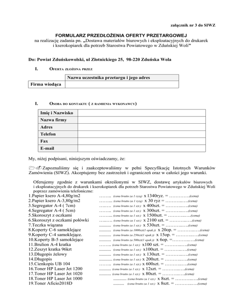 załącznik nr 3 do SIWZ FORMULARZ PRZEDŁOŻENIA OFERTY PRZETARGOWEJ na realizację zadania pn. „Dostawa materiałów biurowych i eksploatacyjnych do drukarek i kserokopiarek dla potrzeb Starostwa Powiatowego w Zduńskiej Woli” Do: Powiat Zduńskowolski, ul Złotnickiego 25, 98-220 Zduńska Wola I. OFERTA ZŁOŻONA PRZEZ Nazwa uczestnika przetargu i jego adres Firma wiodąca I. OSOBA DO KONTAKTU ( Z RAMIENIA WYKONAWCY) Imię i Nazwisko Nazwa firmy Adres Telefon Fax E-mail My, niżej podpisani, niniejszym oświadczamy, że: 1. Zapoznaliśmy się i zaakceptowaliśmy w pełni Specyfikację Istotnych Warunków Zamówienia (SIWZ). Akceptujemy bez zastrzeżeń i ograniczeń oraz w całości jego warunki. Oferujemy zgodnie z warunkami określonymi w SIWZ, dostawę artykułów biurowych i eksploatacyjnych do drukarek i kserokopiarek dla potrzeb Starostwa Powiatowego w Zduńskiej Woli poprzez zamówienia telefoniczne: 1.Papier ksero A-4,80g/m2 2.Papier ksero A-3,80g/m2 3.Segregator A-4 ( 7cm) 4.Segregator A-4 ( 5cm) 5.Skoroszyt z oczkami 6.Skoroszyt z oczkami połówki 7.Teczka wiązana 8.Koperty C-6 samoklejące 9.Koperty C-4 samoklejące. 10.Koperty B-5 samoklejące 11.Brulion A-4 kratka 12.Zeszyt kratka 96krt 13.Długopis żelowy 14.Długopis 15.Cienkopis UB 104 16.Toner HP Laser Jet 1200 17.Toner HP Laser Jet 1020 18.Toner HP Laser Jet 1000 19.Toner Aficio2018D …….. (cena brutto za 1 ryzę) x 1340ryz. = ………….(cena) ……... (cena brutto za 1 ryzę) x 30 ryz = ………..….(cena) ….…. (cena brutto za 1 szt.) x 400szt. = ………..….(cena) …….. (cena brutto za 1 szt.) x 300szt. = ………..….(cena) ……... (cena brutto za 1 szt.) x 1500szt. = ………..….(cena) …..…. (cena brutto za 1 szt.) x 2100 szt. = ………..….(cena) .......... (cena brutto za 1 szt.) x 530szt. = ………..….(cena) .......... (cena brutto za 1000szt(1 opak.)) x 20op. = ………..….(cena) .......... (cena brutto za 250szt(1 opak.)) x 15op. = ………..….(cena) .......... (cena brutto za 500szt(1 opak.)) x 6op. =………..….(cena) …….. (cena brutto za 1 szt.) x100 szt. = ………..….(cena) .......... (cena brutto za 1 szt.) x100szt. = ………..….(cena) .......... (cena brutto za 1 szt.) x 130szt. = ………..….(cena) ........... (cena brutto za 1 szt.) x 200szt. = ………..….(cena) …….. (cena brutto za 1 szt.) x 600szt. = ………..….(cena) .......... (cena brutto za 1 szt.) x 12szt. = ………..….(cena) .......... (cena brutto za 1 szt.) x 80szt. = ………..….(cena) ........... (cena brutto za 1 szt.) x 8szt. = ………..….(cena) ......... (cena brutto za 1 szt.) x 8szt. = ………..….(cena) 20.Toner HP Laser Jet 1100 .......... (cena brutto za 1 szt.) 21.Toner MITA Vi 150/155 ........... (cena brutto za 1 szt.) 22.Toner Lexmark E323 ........... (cena brutto za 1 szt.) 23. Toner Lexmark E120 .......... (cena brutto za 1 szt.) 24. Toner Lexmark E340 ......... (cena brutto za 1 szt.) 25.Toner Konica Minolta–Page Pro 1300W ......... (cena brutto za 1 szt.) 26.Toner UTAX C 148 .......... (cena brutto za 1 szt.) 27.Toner HP Laser Jet 5000 .......... (cena brutto za 1 szt.) 28.Toner HP Laser Jet P1505n .......... (cena brutto za 1 szt.) 29.Toner HP PSC 1315 .......... (cena brutto za 1 szt.) 30.Toner Samsung ML 2010p .......... (cena brutto za 1 szt.) 31.Toner Samsung ML 2250 .......... (cena brutto za 1 szt.) 25szt. = ………..….(cena) 60szt. = ………..….(cena) x 17szt. = ………..….(cena) x 84szt. = ………..….(cena) x 6szt. = ………..….(cena) x 17szt. = ………..….(cena) x 3szt. = ………..….(cena) x 5szt. = ………..….(cena) x 4szt. = ………..….(cena) x 6szt. = ………..….(cena) x 6szt. = ………..….(cena) x 4szt. = ………..….(cena) Razem cena brutto ........................................................ zł (słownie złotych: .........................................................................................................) w tym podatek VAT .......................... zł (słownie złotych: ..................................................) , razem cena netto ................................................... zł (słownie złotych: .....................................), Uwaga: zarówno ceny jednostkowe jak i łączne należy podać w PLN z dokładnością do 1 gr tj. dwóch miejsc po przecinku, w przypadku zaokrągleń stosujemy reguły matematyczne. 2. Zamówienie zrealizujemy w okresie jednego roku od dnia podpisania umowy. 3. Oświadczamy, że: 1) spełniamy warunki określone w art. 22 ustawy Prawo zamówień publicznych, 2) nie jesteśmy wykluczeni z postępowania na podstawie art. 24 ustawy Prawo zamówień publicznych, 3) spełniamy warunki udziału w postępowaniu, 4) niezalegamy z opłacaniem składek ZUS i opłacaniem podatków w Urzędzie Skarbowym, 4. Oferta jest ważna przez okres 30 dni od daty ostatecznego terminu składania ofert, tj. do ……………….. 1) Załączniki: 1) …………………….. 2) …………… itd. (wymienić wszystkie wymagane w SIWZ dokumenty) ...................................................................................... Podpis/y osób upoważnionych do podpisania oferty w imieniu wykonawcy Miejsce i data: .................................................. Pieczątka firmy/przedsiębiorstwa: ...................................................................................... (Podpisy osób upoważnionych do podpisania oferty w imieniu wykonawcy)