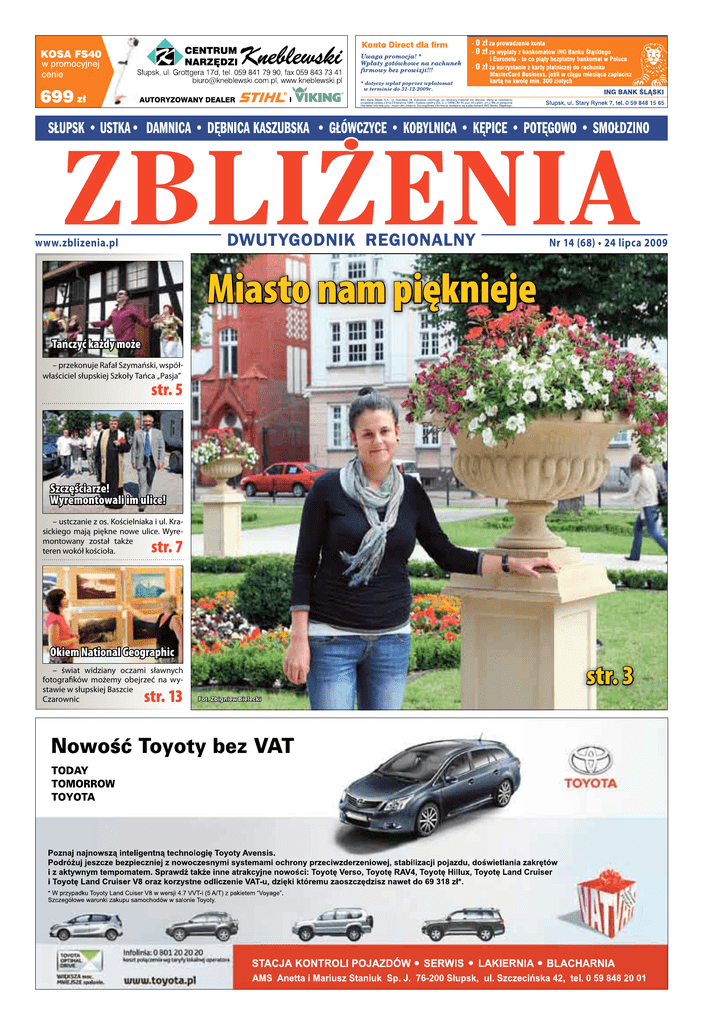 www.zblizenia.pl Nr 14 (68) • 24 lipca 2009 Miasto nam pięknieje Tańczyć każdy może – przekonuje Rafał Szymański, współwłaściciel słupskiej Szkoły Tańca „Pasja” str. 5 Szczęściarze! Wyremontowali im ulice! – ustczanie z os. Kościelniaka i ul. Krasickiego mają piękne nowe ulice. Wyremontowany został także teren wokół kościoła. str. 7 Okiem National Geographic – świat widziany oczami sławnych fotografików możemy obejrzeć na wystawie w słupskiej Baszcie Czarownic str. 13 str. 3 Fot. Zbigniew Bielecki REKLAMA 24 lipca 2009 AKTUALNOŚCI 24 lipca 2009 Rowerowe Dwumiasto Komentarz Wiceprezydent Słupska Ryszard Kwiatkowski i Marcin Dudka reprezentujący Pracownię Projektową Euro-Alians z Gdańska podpisali umowę na wykonanie koncepcji programowo- przestrzennej ścieżki rowerowej łączącej Dwumiasto: Słupsk i Ustkę. W przedsięwzięciu uczestniczą cztery samorządy: miasto i gmina Słupsk oraz miasto i gmina Ustka. W uroczystym podpisaniu uczestniczyli także: burmistrz Ustki Jan Olech, wójt gminy Ustka Anna Sobczuk-Jodłowska oraz wicewójt gminy Słupsk Bernard Rybak. – Ścieżka może liczyć od 17 do 27 kilometrów. Ma mieć od 3 do 4 metrów szerokości. Będzie dwukierunkowa. Zostanie wykonana najprawdopodobniej z betonu asfaltowego, a w miej- scowościach z materiału rozbieralnego, by w razie awarii bez problemu dostać się do podziemnej infrastruktury – powiedział Wiesław Kurtiak, dyrektor Zarządu Dróg Miejskich w Słup- sku. Burmistrz Olech ujawnił, że jest szansa, aby budowę ścieżki sfinansował gdański oddział Generalnej Dyrekcji Dróg Krajowych i Autostrad. A to dlatego, że w przyszłym roku ma być modernizowana droga krajowa nr 21 ze Słupska do Ustki. Powinna być przy niej ścieżka rowerowa. Jeśli jednak ścieżka powstanie osobno, to może zastąpić tę przy drodze 21. Koncepcja ścieżki ma być gotowa do 13 grudnia. Ma odpowiedzieć na pytania, którędy powinna przebiegać i ile ma kosztować. Wstępnie zakłada się, że pobiegnie malowniczą trasą przez Strzelino, Gałęzinowo, Charnowo i Wodnicę. (LL) Fot. Zbigniew Bielecki Kolorowe kwiatowe ozdoby W parku przy alei Sienkiewicza w Słupsku po raz pierwszy pojawiły się cztery kwiatowe gazony obsadzone różnokolorowymi surfiniami. Cieszą oczy przechodniów i wypoczywających na parkowych ławeczkach. – Bardzo mi się podobają. Są ozdobą naszego miasta – mówi Barbara Perczek, która przychodzi do parku z wnukami. – Gazony są wykonane ze sztucznego piaskowca. Kosztowały około 16 tysięcy złotych. Ustawiliśmy na razie tylko cztery, bo tak zdecydował plastyk miejski – powiedział nam Zbigniew Ingielewicz, dyrektor Zarządu Terenów Zieleni Miejskiej i Cmentarzy Komunalnych w Słupsku. – Nie wiemy jeszcze, czy w przyszłym roku dokupimy gazonów, czy może zdecydujemy się na inne obiekty małej architektury parkowej. Decyzje w tej sprawie zapadają w ratuszu – dodał dyrektor. W tym roku Zarząd wydał już na kwiaty około 70 tysięcy złotych. Mniej, niż planowano, albowiem udało się znaleźć tańszego producenta roślin. Sam zegar kwiatowy przy ul. Starzyńskiego kosztował 30 tysięcy. (l) Fot. Zbigniew Bielecki Monika Tym w parku przy alei Sienkiewicza Nowe kierunki kształcenia Państwowa Komisja Akredy- Akademii Pomorskiej w Słupsku czyli licencjatu, jest to kulturotacyjna wydała uchwały pozy- nowych kierunków kształcenia. – znawstwo i fizyka techniczna, a na tywnie opiniujące otwarcie na Na poziomie pierwszego stopnia, poziomie drugiego stopnia, czyli studiów magisterskich, edukacja artystyczna w zakresie sztuki Wyrazy serdecznego współczucia muzycznej. Do ich uruchomienia wymagana jest już jedynie zgoda Panu Janowi Rudewiczowi i Ministerstwa Nauki i Szkolnictwa Pani Ewie Weitmann-Rudewicz Wyższego, która formalnie opiez powodu odejścia ra się na. decyzji Państwowej Komisji Akredytacyjnej – informuje Ojca i Teścia Marzena Łukasik, rzecznik AP składają w Słupsku. – Rekrutację rozpoprzyjaciele z firmy Fotech w Słupsku czniemy w połowie sierpnia. (l) DWUTYGODNIK Nakład: 10000 egz. ISSN 138-0745 REGIONALNY Wydawca: AUH FOTECH 76-200 Słupsk al. Sienkiewicza 1/2 Druk: AGORA S.A. Piła Redaktor naczelna Leokadia Lubiniecka Sekretarz redakcji Ryszard Hetnarowicz Dyrektor wydawnictwa Zbigniew Bielecki Skład i grafika Bednarek Media - Studio Grafiki Reklamowej, Ilona Gostyńska-Rymkiewicz Kałuża z rurą czy morze wodnych igraszek? Maciej Maraszkiewicz i Kamil Brzeziński ze Stowarzyszenia Młodych demokratów zrobili happening przed słupskim ratuszem. Moczyli nogi w dziecięcym baseniku i domagali się od prezydenta miasta budowy kilku basenów zamiast zabiegów o budowę jednego wielkiego aquaparku. Stwierdzili, ze mieszkańcom wystarczy „kałuża z rurą”, jak prezydent nazwał kiedyś aquapark powstający w podsłupskim Redzikowie. Wystosowali petycję do Macieja Kobylińskiego, w której podają przykłady podobnych lub mniejszych miast z kilkoma basenami. Taka na przykład stutysięczna Legnica ma aż pięć pływalni. A 37-tysięczny Sopot nie dość, że ma morze i baseny, to jeszcze i aquapark. Prawda, że to niesprawiedliwe? Rzecznik prezydenta miasta obśmiał obu młodych demokratów. Uznał, że ich happening był mało oryginalny, a nawet żenujący. Obejrzało go raptem kilku dziennikarzy i dwóch znanych w mieście braci. Ma rację rzecznik, ze aquapark to byłaby prawdziwa atrakcja nie tylko dla słupszczan, ale także dla m i e s z k a ń có w powiatu słupskiego. Może mniej dla turystów, bo ci przyjeżdżają głównie nad morze. Ale nie w tym rzecz. Żadną miarą nie mogę pojąć jak to się dzieje, że jeden biznesmen spod Sławna był w stanie udźwignąć finansowy ciężar budowy parku wodnego w Darłówku. I jakoś mu się chyba opłaca ten interes, skoro nie zbankrutował. Nie wierzę, by dokładał do niego z innej działalności, bo w biznesie sentymentów 