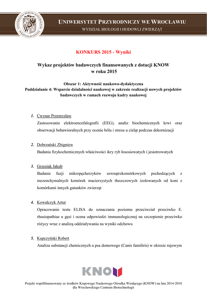 UNIWERSYTET PRZYRODNICZY WE WROCŁAWIU WYDZIAŁ BIOLOGII I HODOWLI ZWIERZĄT KONKURS 2015 - Wyniki Wykaz projektów badawczych finansowanych z dotacji KNOW w roku 2015 Obszar 1: Aktywność naukowo-dydaktyczna Poddziałanie 4: Wsparcie działalności naukowej w zakresie realizacji nowych projektów badawczych w ramach rozwoju kadry naukowej 1. Cwynar Przemysław Zastosowanie elektroencefalografii (EEG), analiz biochemicznych krwi oraz obserwacji behawioralnych przy ocenie bólu i stresu u cieląt podczas dekornizacji 2. Dobrzański Zbigniew Badania fizykochemicznych właściwości ikry ryb łososiowatych i jesiotrowatych 3. Grzesiak Jakub Badanie fuzji mikropęcherzyków zewnątrzkomórkowych pochodzących z mezenchymalnych komórek macierzystych tłuszczowych izolowanych od koni z komórkami innych gatunków zwierząt 4. Kowalczyk Artur Opracowanie testu ELISA do oznaczania poziomu przeciwciał przeciwko E. rhusiopathiae u gęsi i ocena odpowiedzi immunologicznej na szczepienie przeciwko różycy wraz z analizą oddziaływania na wyniki odchowu 5. Kupczyński Robert Analiza substancji chemicznych u psa domowego (Canis familiris) w okresie rujowym Projekt współfinansowany ze środków Krajowego Naukowego Ośrodka Wiodącego (KNOW) na lata 2014-2018 dla Wrocławskiego Centrum Biotechnologii UNIWERSYTET PRZYRODNICZY WE WROCŁAWIU WYDZIAŁ BIOLOGII I HODOWLI ZWIERZĄT 6. Łukaszewicz Ewa Opracowanie efektywnego rozcieńczalnika do krótko- (w stanie płynnym) i długotrwałego (w stanie zamrożonym) przechowywania nasienia kogutów 7. Proćków Jarosław Określenie zawartości wybranych pierwiastków (w tym metali ciężkich) w galasach powodowanych przez Livia junci (Hemiptera: Liviinae) 8. Śmieszek Agnieszka Wpływ metforminy na odbudowę tkanki kostnej – implikacje dla medycyny regeneracyjnej 9. Śpitalniak Kinga Ocena suplementacji wielonienasyconych kwasów tłuszczowych na odporność i rozwój cieląt 10. Wojtas Edyta Wpływ dodatku lecytyny sojowej do dawki pokarmowej cieląt na wskaźniki biochemiczne krwi, poziom cholesterolu w kale oraz wyniki ich wychowu 11. Zielak-Steciwko Anna Genomowe uwarunkowania chorób zakaźnych i inwazyjnych (BVDV, IBR/IPV, neosporoza, chlamydioza) w stadach bydła rasy polskiej czerwono-białej (ZR) oraz polskiej holsztyńsko-fryzyjskiej (PHF) 12. Zwyrzykowska Anna Ekstrakcja biologicznie aktywnych saponin z Ilex sp. na drodze ekstrakcji do fazy stałej (SPE) Projekt współfinansowany ze środków Krajowego Naukowego Ośrodka Wiodącego (KNOW) na lata 2014-2018 dla Wrocławskiego Centrum Biotechnologii UNIWERSYTET PRZYRODNICZY WE WROCŁAWIU WYDZIAŁ BIOLOGII I HODOWLI ZWIERZĄT KONKURS 2015 - Wyniki Wykaz projektów badawczych w ramach dotacji KNOW w roku 2015, które będę finansowane pod warunkiem wykorzystania w pierwszej kolejności posiadanej infrastruktury technicznej znajdującej się na Wydziale Biologii i Hodowli Zwierząt lub w innych Jednostkach Uczelni. Obszar 1: Aktywność naukowo-dydaktyczna Poddziałanie 4: Wsparcie działalności naukowej w zakresie realizacji nowych projektów badawczych w ramach rozwoju kadry naukowej 1. Kowalska Elżbieta Czy Jura Polska stanowiła refugium w maksimum zlodowaceń? Molekularna analiza filogeograficzna Discus perspectivus (Megerle von Muehlfeld, 1818) 2. Marszałek – Kruk Bożena Poszukiwanie nowych mutacji w genach POLR1C oraz POLR1D u chorych z zespołem Treachera Collinsa 3. Moska Magdalena Struktura genetyczna populacji popielicy (Glis glis) w Górach Sowich. 4. Rabiniak Emilia Badania aDNA i historyczno-faunistyczna analiza szczątków wymarłych przedstawicieli rodziny Leporidae ze stanowisk późnego plejstocenu Europy Centralnej Projekt współfinansowany ze środków Krajowego Naukowego Ośrodka Wiodącego (KNOW) na lata 2014-2018 dla Wrocławskiego Centrum Biotechnologii UNIWERSYTET PRZYRODNICZY WE WROCŁAWIU WYDZIAŁ BIOLOGII I HODOWLI ZWIERZĄT 5. Strzała Tomasz Wykorzystanie najnowszych technik sekwencjonowania wysokoprzepustowego (NGS) w systematyce oraz filogenetyce molekularnej przedstawicieli rodzaju Tapirus 6. Urantówka Adam Wykorzystanie sekwencji pełnych genomów mitochondrialnych do określenia prawdziwych relacji filogenetycznych w obrębie plemienia Arini (rząd Psittaciformes; podrodzina Arinae). Projekt współfinansowany ze środków Krajowego Naukowego Ośrodka Wiodącego (KNOW) na lata 2014-2018 dla Wrocławskiego Centrum Biotechnologii UNIWERSYTET PRZYRODNICZY WE WROCŁAWIU WYDZIAŁ BIOLOGII I HODOWLI ZWIERZĄT KONKURS 2015 - Wyniki Wykaz projektów badawczych niefinansowanych z dotacji KNOW w roku 2015 Obszar 1: Aktywność naukowo-dydaktyczna Poddziałanie 4: Wsparcie działalności naukowej w zakresie realizacji nowych projektów badawczych w ramach rozwoju kadry naukowej 1. Adamski Maciej Wpływ wybranych czynników na zawartość lotnych związków aromatycznych w mleku 2. Bodkowski Robert Obrona zgłoszenia patentowego wynalazku oznaczonego numerem P-398771 Suplement diety dla przeżuwaczy, zwłaszcza dla krów mlecznych 3. Knecht Damian Rozkład kwasów tłuszczowych tłuszczu podskórnego w tuszach wieprzowych polskiego pogłowia masowego tuczników 4. Patkowska – Sokoła Bożena Wpływ estrów etylowych oleju lnianego na potencjał reprodukcyjny oraz profil kwasów tłuszczowych nasienia i krwi knurów, psów i królików. Projekt współfinansowany ze środków Krajowego Naukowego Ośrodka Wiodącego (KNOW) na lata 2014-2018 dla Wrocławskiego Centrum Biotechnologii