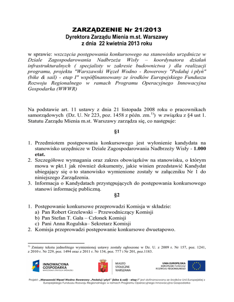ZARZĄDZENIE Nr 21/2013 Dyrektora Zarządu Mienia m.st. Warszawy z dnia 22 kwietnia 2013 roku w sprawie: wszczęcia postępowania konkursowego na stanowisko urzędnicze w Dziale Zagospodarowania Nadbrzeża Wisły – koordynatora działań infrastrukturalnych ( specjalisty w zakresie budownictwa ) dla realizacji programu, projektu "Warszawski Węzeł Wodno - Rowerowy "Pedałuj i płyń" (bike & sail) - etap I" współfinansowany ze środków Europejskiego Funduszu Rozwoju Regionalnego w ramach Programu Operacyjnego Innowacyjna Gospodarka (WWWR) Na podstawie art. 11 ustawy z dnia 21 listopada 2008 roku o pracownikach samorządowych (Dz. U. Nr 223, poz. 1458 z późn. zm.1)) w związku z §4 ust 1. Statutu Zarządu Mienia m.st. Warszawy zarządza się, co następuje: §1 1. Przedmiotem postępowania konkursowego jest wyłonienie kandydata na stanowisko urzędnicze w Dziale Zagospodarowania Nadbrzeży Wisły - 1.000 etat. 2. Szczegółowe wymagania oraz zakres obowiązków na stanowisku, o którym mowa w pkt.1 jak również dokumenty, jakie winien przedstawić Kandydat ubiegający się o to stanowisko wymienione zostały w załączniku Nr 1 do niniejszego Zarządzenia. 3. Informacja o Kandydatach przystępujących do postępowania konkursowego stanowi informację publiczną. §2 1. Postępowanie konkursowe przeprowadzi Komisja w składzie: a) Pan Robert Grzelewski – Przewodniczący Komisji b) Pan Stefan T. Gała – Członek Komisji c) Pani Anna Rogulska– Sekretarz Komisji 2. Komisja przeprowadzi postępowanie konkursowe dwuetapowo. 1) Zmiany tekstu jednolitego wymienionej ustawy zostały ogłoszone w Dz. U. z 2009 r. Nr 157, poz. 1241, z 2010 r. Nr 229, poz. 1494 oraz z 2011 r. Nr 134, poz. 777 i Nr 201, poz.1183. Projekt: „Warszawski Węzeł Wodno-Rowerowy „Pedałuj i płyń” (bike & sail) - etap I” jest dofinansowany ze środków Unii Europejskiej z Europejskiego Funduszu Rozwoju Regionalnego w ramach Programu Operacyjnego Innowacyjna Gospodarka a) w pierwszym etapie Komisja dokona oceny zgodności złożonych ofert z ogłoszeniem. b) w drugim etapie zostanie przeprowadzona rozmowa kwalifikacyjna na podstawie złożonej przez Kandydatów aplikacji oraz wymagań im stawianych. §3 1. Zgłoszenia kandydatów odbywać się będą na podstawie ogłoszenia o konkursie opublikowanego w Biuletynie Informacji Publicznej ZMW, wywieszonego na tablicy ogłoszeń w siedzibie ZMW oraz ogłoszenia w prasie. 2. Zgłoszenia kandydatów będą przyjmowane w siedzibie ZMW w terminie do dnia 06 maja 2013 roku (decyduje data wpływu do ZMW). 3. Zgłoszenia, które wpłyną po terminie ustalonym w pkt 2 nie będą rozpatrywane. W takim przypadku kandydaci nie będą informowani o odrzuceniu ich oferty. §4 1. Kandydaci zainteresowani udziałem w konkursie mają prawo zasięgać informacji o ZMW w zakresie, w którym nie stanowi to tajemnicy uwzględniając charakter i stanowisko pracy, mają również prawo do zapoznania się ze szczegółowymi zasadami konkursu. 2. Osobą upoważnioną do udzielania informacji, o której mowa w pkt.1 jest Zastępca Dyrektora ds. inwestycyjnych Pan Robert Grzelewski. 3. Informacje udzielane są wyłącznie w terminie określonym do składania ofert. §5 Etap I Ocena dokumentów przedstawionych przez Kandydatów 1. Dokumenty złożone przez kandydatów będą analizowane przez Komisję o której mowa w § 2 pod kątem spełnienia wymagań formalnych określonych w ogłoszeniu. 2. Po dokonaniu analizy sporządzona zostanie lista wszystkich kandydatów, którzy przystąpili do postępowania konkursowego. 3. Nie dopuszcza się do dalszego postępowania konkursowego osób, które złożyły dokumenty po terminie wskazanym w treści ogłoszenia oraz osób, Projekt: „Warszawski Węzeł Wodno-Rowerowy „Pedałuj i płyń” (bike & sail) - etap I” jest dofinansowany ze środków Unii Europejskiej z Europejskiego Funduszu Rozwoju Regionalnego w ramach Programu Operacyjnego Innowacyjna Gospodarka które nie spełniają wymagań formalnych. W takim przypadku kandydaci nie będą informowani o odrzuceniu ich oferty. 4. Niezwłocznie po dopuszczeniu kandydata do dalszego etapu postępowania konkursowego zostanie on powiadomiony telefonicznie. 5. ZMW nie pokrywa kosztów wyżywienia i dojazdów kandydatów na rozmowę kwalifikacyjną. §6 Etap II Rozmowa kwalifikacyjna 1. Rozmowa kwalifikacyjna z kandydatami zostanie przeprowadzona w dniu 08 maja 2013 roku w siedzibie ZMW o godz. ustalonej telefonicznie z kandydatami. 2. Rozmowy będą się odbywały indywidualnie. Rozmowa kwalifikacyjna służy zweryfikowaniu znajomości zagadnień wynikających z opisu stanowiska pracy. 3. Celem rozmowy kwalifikacyjnej jest nawiązanie bezpośredniego kontaktu z kandydatem i weryfikacja informacji zawartych w aplikacji oraz możliwość oceny: predyspozycji i umiejętności kandydata gwarantujących prawidłowe wykonywanie powierzonych obowiązków, w tym znajomości przepisów niezbędnych do zajmowanego stanowiska, posiadanej wiedzy na temat zadań na stanowisku, o które ubiega się kandydat, doświadczeń zawodowych zdobytych na stanowiskach zajmowanych poprzednio przez kandydata. 4. Komisja dokonuje oceny Kandydatów w formie punktowej w skali 0-10 pkt. §7 1. Ogłoszenie wyników następuje zgodnie z przepisami. 2. Za najlepszego kandydata uważa się osobę, która zdobyła najwyższą ocenę Komisji. 3. Ocena Komisji winna być wyrażona w formie sumarycznej punktowej wraz z uzasadnieniem. 4. Kandydat, który wygrał konkurs zobowiązany jest do złożenia oświadczenia o wyrażeniu zgody na zatrudnienie na stanowisku, o które ubiegał się w postępowaniu konkursowym. Projekt: „Warszawski Węzeł Wodno-Rowerowy „Pedałuj i płyń” (bike & sail) - etap I” jest dofinansowany ze środków Unii Europejskiej z Europejskiego Funduszu Rozwoju Regionalnego w ramach Programu Operacyjnego Innowacyjna Gospodarka 5. Decyzja Komisji odnośnie merytorycznej oceny Kandydata nie podle