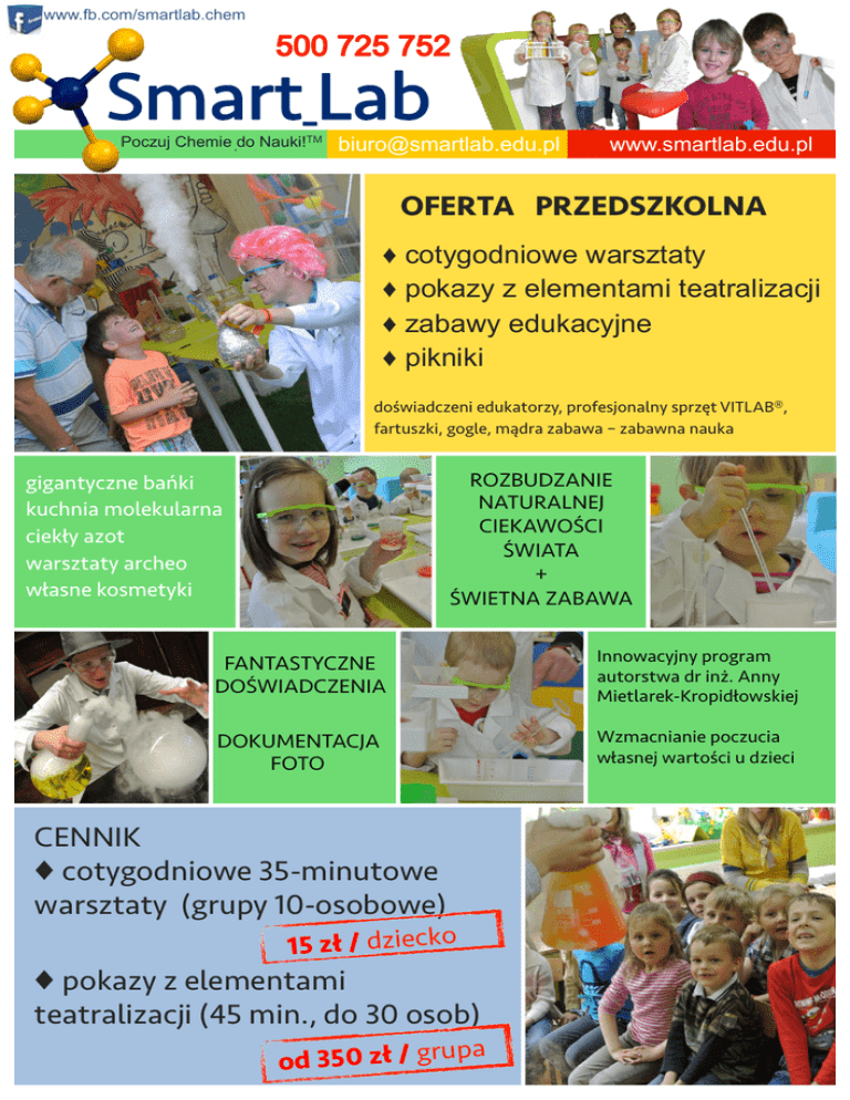 www.fb.com/smartlab.chem TM Poczuj Chemię do Nauki! Poczuj Chemie , do Nauki! [email protected] TM www.smartlab.edu.pl OFERTA PRZEDSZKOLNA ♦ cotygodniowe warsztaty ♦ pokazy z elementami teatralizacji ♦ zabawy edukacyjne ♦ pikniki doświadczeni edukatorzy, profesjonalny sprzęt VITLAB®, fartuszki, gogle, mądra zabawa – zabawna nauka ROZBUDZANIE NATURALNEJ CIEKAWOŚCI ŚWIATA + ŚWIETNA ZABAWA gigantyczne bańki FASCYNUJACE kuchnia molekularna ciekłyEKSPERYMENTY azot warsztaty archeo własne kosmetyki ZABAWY EDUKACYJNE FANTASTYCZNE DOŚWIADCZENIA Innowacyjny program autorstwa dr inż. Anny Mietlarek-Kropidłowskiej DOKUMENTACJA FOTO Wzmacnianie poczucia własnej wartości u dzieci CENNIK ♦ cotygodniowe 35-minutowe warsztaty (grupy 10-osobowe) 15 zł / dziecko ♦ pokazy z elementami teatralizacji (45 min., do 30 osob) a od 350 zł / grup