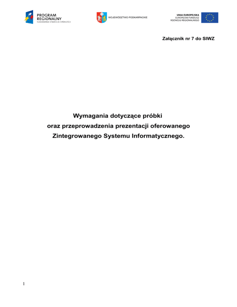 WOJEWÓDZTWO PODKARPACKIE Załącznik nr 7 do SIWZ Wymagania dotyczące próbki oraz przeprowadzenia prezentacji oferowanego Zintegrowanego Systemu Informatycznego. 1 WOJEWÓDZTWO PODKARPACKIE 1. Wymagania dotyczące próbki oferowanego ZSI W celu weryfikacji Szpitalnego Systemu Informatycznego (HIS) z wymaganiami opisanymi Załączniku nr 6b do SIWZ, Zamawiący wymaga od Wykonawcy próbki oferowanego systemu w formie prezentacji na komputerze z zainstalowaną bazą danych , niezbędnymi do prawidłowego działania elementami systemu (zmienne środowisko, biblioteki systemowe, serwery www, komponenty systemu operacyjnego, wymagane przeglądarki internetowe) umożliwiającego uruchomienie modułów przedstawionych w ofercie. Celem prezentacji próbki jest przedstawienie funkcjonalnści modułów opisanych w scenariuszu, który Zamawiajacy prześle Wykonawcy na 7 dni przed prezentacją systemu która będzie miała miejsce w siedziebie Zamawiającego. Scenariusz będzie określał ktore funkcjonalności systemu będą weryfikowane przez Zamawiającego. Dostarczona próbka Szpitalnego Systemu Informatycznego będzie w pełni funkcjonalna tzn. będzie w pełni skonfigurowe oprogramowanie dziedzinowe i bazodanowe na dostarczonym komputerze ze wszystkimi wymaganymi modułami (zmienne środowisko, biblioteki systemowe, serwery www, komponenty systemu operacyjnego). Podczas prezentacji nie będzię wymagana prezentacja funkcjonalności integracji wymaganych modułów. Celem prezentacji jest umożliwienie zweryfikowania i porównania oferowanych SSI z wymaganiami zawartymi w SIWZ. 1. Wymagania dotyczące komputera: a. komputer musi posiadać wszelkie parametry techniczne umożliwiające sprawne działanie SSI, b. Zamawiający nie wymaga haseł użytkowników posiadających prawa administracyjne do systemu operacyjnego zainstalowanego na sprzęcie stanowiącym próbkę, 2. Wymagania dotyczące testowej bazy danych: a. Baza danych powinna zawierać co najmniej 500 rekordów testowych, b. Baza nie może zawierać danych osobowych rzeczywistych osób, c. Zamawiający nie wymaga haseł użytkowników posiadających prawa administracyjne do serwera bazy danych, 3. Wymagania dotyczące SSI będącego próbką: a. Oprogramowanie stanowiące próbkę musi być zgodne z przedstawioną ofertą, z działającymi wszystkimi funkcjonalnościami (zgodnie z poniższym wykazem modułów), zgodnie z wymogami przedstawionymi w SIWZ, b. Oprogramowanie stanowiące próbkę musi zawierać następujące moduły części medycznej: • Ruch Chorych (Izba przyjęć, Oddział, Statystyka, Administrator), • Apteczka oddziałowa, • Przychodnia - (Rejestracja, Gabinet lekarski, Gabinet zabieg. ), • Rozliczenia z NFZ, • Obsługa dokumentacji medycznej, • Obsługa punktów pobrań, • Laboratorium analityczne, serologia, Bank krwi, 2 WOJEWÓDZTWO PODKARPACKIE • • • • • Pracownie diagnostyczne, Blok operacyjny, Rehabilitacja, Zakażenia szpitalne, Obsługa zleceń (oddziały i poradnie), c. Zamawiający wymaga założenia konta użytkownika SSI posiadającego prawa administracyjne do oprogramowania, tak aby możliwe było założenie nowego użytkownika systemu, wprowadzenie danych testowych, wykonywanie wykazów oraz wszelkich innych czynności umożliwiających przeprowadzenie weryfikacji oferowanego systemu celem potwierdzenia, iż oferta odpowiada treści SIWZ, d. Wykonawca ustanowi login użytkownika posiadającego prawa administracyjne do oprogramowania o treści: ADMIN e. Wykonawca ustanowi hasło użytkownika posiadającego prawa administracyjne do oprogramowania o treści: ADMIN 4. Wraz z komputerem stanowiącym próbkę SSI, Wykonawca dostarczy, zapisane w plikach PDF lub DOC, instrukcje stanowiskowe opisujące obsługę SSI w zakresie oferowanych modułów dla administratora oraz użytkownika końcowego. 2. Wymagania dotyczące prezentacji próbki oferowanego SSI Prezentacja zostanie przeprowadzona według niżej opisanych zasad: 1. Prezentacja zostanie przeprowadzona w terminie wskazanym przez Zamawiającego w zaproszeniu. 2. Wykonawca w czasie prezentacji reprezentować będzie osoba uprawniona do działania w imieniu Wykonawcy (ujawniona we właściwym rejestrze) lub upoważniona na podstawie pełnomocnictwa załączonego do oferty lub złożonego w oryginale lub notarialnie potwierdzonej kopii bezpośrednio przed prezentacją. Zamawiający bezpośrednio przed prezentacją zweryfikuje uprawnienia osób prezentujących do reprezentowania Wykonawcy. 3. Zamawiający zastrzega sobie możliwośc prawa do dokumentowania przeprowadzanej prezentacji w formie nagrania video. 4. Prezentacje poszczególnych Wykonawców będą odbywały się w kolejnych, wyznaczonych przez Zamawiającego dniach, zgodnie z zasadą, że pierwszy prezentuje Wykonawca, którego oferta wpłynęła najwcześniej. 5. Wykonawca zobowiązany jest do zabezpieczenia sobie wszelkiego niezbędnego do przeprowadzenia prezentacji sprzętu tj. komputera, ekranu, rzutnika, czytnika kodów, drukarki itp. koniecznych do przeprowadzenia pełnej prezentacji zgodnie ze scenariuszem. 6. W wyznaczonym dniu prezentacji Wykonawca przygotuje, w ciągu maksymalnie 60 minut, przeprowadzenie prezentacji. 7. Prezentacje zostaną przeprowadzone według identycznego dla wszystkich Wykonawców scenariusza. 8. Zamawiający zastrzega sobie prawo do zażądania od Wykonawcy przeprowadzenia prezentacji na komputerze Zamawiającego, na którym przygotowane będą aktualne wersje przeglądarek WWW: Firefox, Internet Explorer, Chrome. 9. Prezentacja zostanie przeprowadzona w dzień roboczy. Zamawiający na 3 WOJEWÓDZTWO PODKARPACKIE prezentację przeznacza maksymalnie 6 godzin. 10. Prezentacje systemów przez poszczególnych Wykonawców są jawne, co oznacza że inni Wykonawcy mają prawo wziąć udział w prezentacji, za wyjątkiem sytuacji, w której Wykonawca obejmie prezentowane fragmenty SSI tajemnicą (tzn. Wykonawca w składanej ofercie wykaże, iż prez