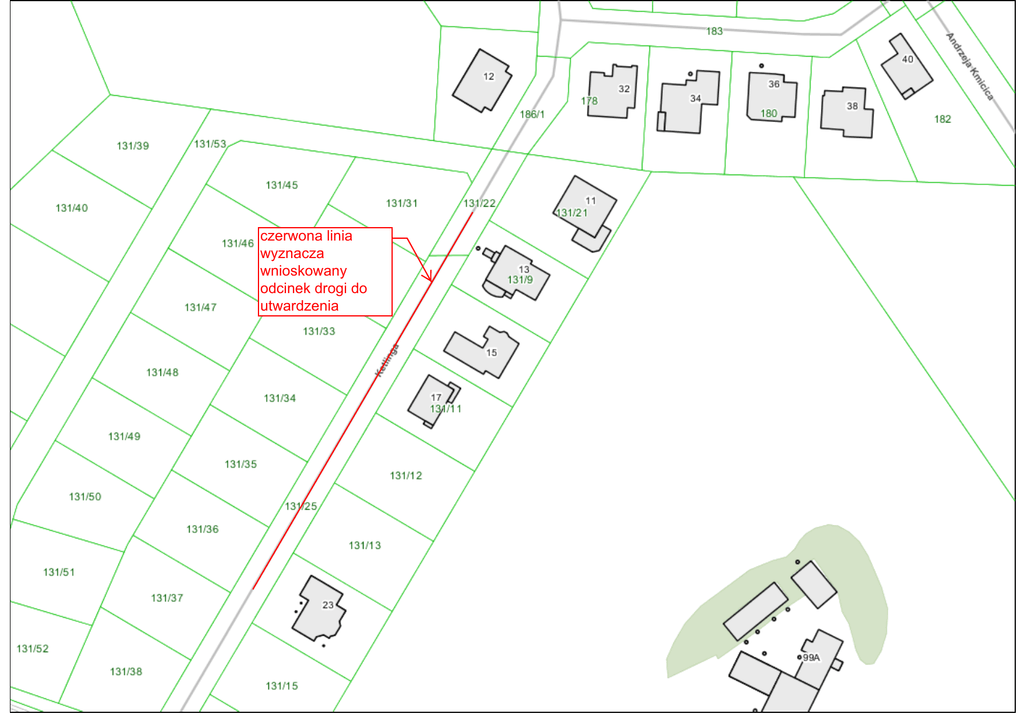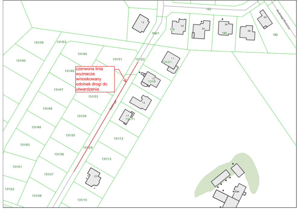 czerwona linia wyznacza wnioskowany odcinek drogi do utwardzenia