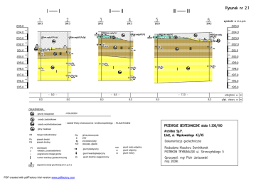 OBJAŚNIENIA: grunty nasypowe - HOLOCEN osady zastoiskowe osady wodnolodowcowe - stadiał Warty zlodowacenia środkowopolskiego - PLEJSTOCEN gliny zwałowe nN nasyp niebudowlany Ps Pd piasek średni piasek drobny (+) // domieszki wkładki, przewarstwienia pogranicze innego gruntu grunt plastyczny numer warstwy geotechnicznej grunt średnio zagęszczony / sączenia wody gruntowej (m.n.p.m.) PDF created with pdfFactory trial version www.pdffactory.com Gp KO glina piaszczysta pyły pył piaszczysty otoczaki, głaziki grunt twardoplastyczny mw w m grunt mało wilgotny grunt wilgotny grunt mokry