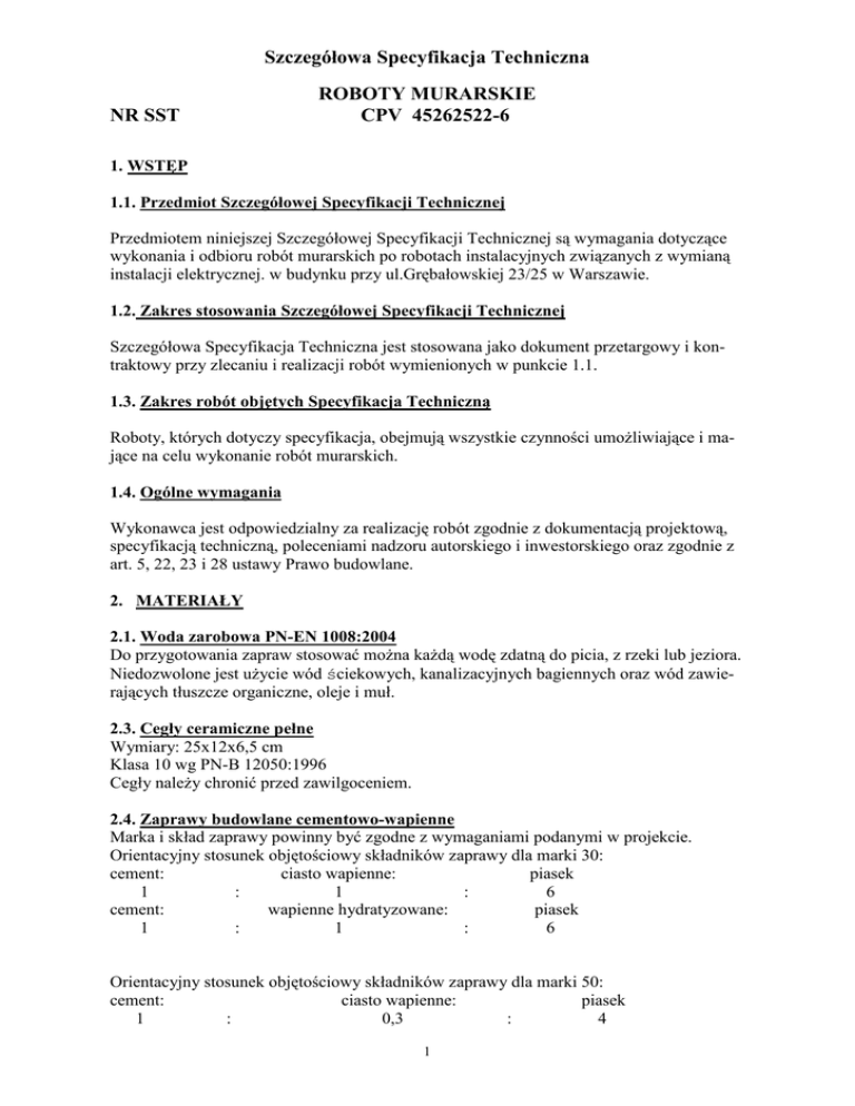 Szczegółowa Specyfikacja Techniczna NR SST ROBOTY MURARSKIE CPV 45262522-6 1. WSTĘP 1.1. Przedmiot Szczegółowej Specyfikacji Technicznej Przedmiotem niniejszej Szczegółowej Specyfikacji Technicznej są wymagania dotyczące wykonania i odbioru robót murarskich po robotach instalacyjnych związanych z wymianą instalacji elektrycznej. w budynku przy ul.Grębałowskiej 23/25 w Warszawie. 1.2. Zakres stosowania Szczegółowej Specyfikacji Technicznej Szczegółowa Specyfikacja Techniczna jest stosowana jako dokument przetargowy i kontraktowy przy zlecaniu i realizacji robót wymienionych w punkcie 1.1. 1.3. Zakres robót objętych Specyfikacja Techniczną Roboty, których dotyczy specyfikacja, obejmują wszystkie czynności umoŜliwiające i mające na celu wykonanie robót murarskich. 1.4. Ogólne wymagania Wykonawca jest odpowiedzialny za realizację robót zgodnie z dokumentacją projektową, specyfikacją techniczną, poleceniami nadzoru autorskiego i inwestorskiego oraz zgodnie z art. 5, 22, 23 i 28 ustawy Prawo budowlane. 2. MATERIAŁY 2.1. Woda zarobowa PN-EN 1008:2004 Do przygotowania zapraw stosować moŜna kaŜdą wodę zdatną do picia, z rzeki lub jeziora. Niedozwolone jest uŜycie wód ściekowych, kanalizacyjnych bagiennych oraz wód zawierających tłuszcze organiczne, oleje i muł. 2.3. Cegły ceramiczne pełne Wymiary: 25x12x6,5 cm Klasa 10 wg PN-B 12050:1996 Cegły naleŜy chronić przed zawilgoceniem. 2.4. Zaprawy budowlane cementowo-wapienne Marka i skład zaprawy powinny być zgodne z wymaganiami podanymi w projekcie. Orientacyjny stosunek objętościowy składników zaprawy dla marki 30: cement: ciasto wapienne: piasek 1 : 1 : 6 cement: wapienne hydratyzowane: piasek 1 : 1 : 6 Orientacyjny stosunek objętościowy składników zaprawy dla marki 50: cement: ciasto wapienne: piasek 1 : 0,3 : 4 1 cement: wapienne hydratyzowane: piasek 1 : 0,3 : 4 - Przygotowanie zapraw do robót murowych powinno być wykonywane mechanicznie. - Zaprawę naleŜy przygotować w takiej ilości, aby mogła być wbudowana moŜliwie wcześnie po jej przygotowaniu tj. ok. 3 godzin. Do zapraw murarskich naleŜy stosować piasek rzeczny lub kopalniany. Do zapraw cementowo-wapiennych naleŜy stosować cement portlandzki z dodatkiem ŜuŜla lub popiołów lotnych 25 i 35 oraz cement hutniczy 25 pod warunkiem, Ŝe temperatura otoczenia w ciągu 7 dni od chwili zuŜycia zaprawy nie będzie niŜsza niŜ +5°C. Do zapraw cementowo-wapiennych naleŜy stosować wapno suchogaszone lub gaszone w postaci ciasta wapiennego otrzymanego z wapna niegaszonego, które powinno tworzyć jednolitą i jednobarwną masę, bez grudek niegaszonego wapna i zanieczyszczeń obcych. Skład objętościowy zapraw naleŜy dobierać doświadczalnie, w zaleŜności od wymaganej marki zaprawy oraz rodzaju cementu i wapna. 3. SPRZĘT Wykonawca jest zobowiązany do uŜywania jedynie takiego sprzętu, który nie spowoduje niekorzystnego wpływu na jakość wykonywanych robót, zarówno w miejscu tych robót, jak teŜ przy wykonywaniu czynności pomocniczych oraz w czasie transportu i załadunku rozebranych materiałów. 4. TRANSPORT I SKŁADOWANIE Transport materiałów dowolnymi środkami transportu kołowego. PrzewoŜony ładunek zabezpieczyć przed spadaniem i przesuwaniem. 5. WYKONANIE ROBÓT Wymagania ogólne: a) Przymurowania i uzupełnienia ścian naleŜy wykonywać warstwami, z zachowaniem prawidłowego wiązania i grubości spoin, do pionu i sznura, z zachowaniem zgodności z rysunkiem co do odsadzek, wyskoków i otworów. b) Przymurowania i uzupełnienia ścian naleŜy wznosić moŜliwie równomiernie na całej ich długości. W miejscu połączenia murów wykonanych niejednocześnie naleŜy stosować strzępia zazębione końcowe. c) Cegły układane na zaprawie powinny być czyste i wolne od kurzu. e) Przymurowania i uzupełnienia ścian powinny być wykonywane przy temperaturze powyŜej 0ºC. 6. KONTROLA JAKOŚCI ROBÓT Wymagania dla robót murarskich podano w pkt. 4 i 5. 6.1. Cegły pełne ceramiczne. Przy odbiorze cegieł naleŜy przeprowadzić na budowie: - sprawdzenie zgodności klasy oznaczonej na cegłach z zamówieniem i wymaganiami stawianymi w dokumentacji technicznej, - próby doraźnej przez oględziny, opukiwanie i mierzenie: - wymiarów i kształtu cegieł, - liczby szczerb i pęknięć, - odporności na uderzenia, 2 6.2. Zaprawy. W przypadku, gdy zaprawa wytwarzana jest na placu budowy, naleŜy kontrolować jej markę i konsystencję w sposób podany w obowiązującej normie. Wyniki odbiorów materiałów i wyrobów powinny być kaŜdorazowo wpisywane do dziennika budowy. 6.3. Dopuszczalne odchyłki wymiarów dla murów przyjmować wg poniŜszej tabeli. Lp. Rodzaj odchyłek Dopuszczalne odchyłki mm mury spoinowane mury niespoinowane 1. Zwichrowania i skrzywienia: - na 1 metrze długości 3 - na całej powierzchni 10 2. Odchylenia od pionu - na wysokości 1 m 3 - na wys. kondygnacji 6 - na całej wysokości 20 3. Odchylenia kaŜdej warstwy od poziomu - na 1 m długości 1 - na całej długości 15 4. Odchylenia górnej warstwy od poziomu - na 1 m długości 1 - na całej długości 10 5. Odchylenia wymiarów otworów w świetle o wymiarach: do 100 cm szerokość +6,-3 wysokość + 15,-10 6 20 6 10 30 2 30 2 20 +6,-3 + 15,-10 ponad 100 cm szerokość wysokość + 10,-5 + 15,-10 + 10,-5 + 15,-10 7. ODBIÓR ROBÓT Wszystkie roboty murarskie podlegają zasadom odbioru robót zanikających. Odbiór robót murarskich powinien się odbyć przed wykonaniem tynków i innych robót wykończeniowych. Podstawę do odbioru robót murarskich powinny stanowić następujące dokumenty: a) dokumentacja techniczna, b) dziennik budowy, c) zaświadczenia o jakości materiałów i wyrobów dostarczonych na budowę, d) protokóły odbioru poszczególnych etapów robót zanikających, e) protokóły odbioru materiałów i wyrobów, f) wyniki badań laboratoryjnych, jeśli takie były zlecane przez budowę. 8. OBMIAR ROBÓT O