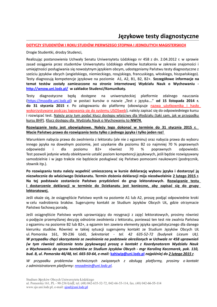 Językowe testy diagnostyczne DOTYCZY STUDENTÓW I ROKU STUDIÓW PIERWSZEGO STOPNIA I JEDNOLITYCH MAGISTERSKICH Drogie Studentki, drodzy Studenci, Realizując postanowienia Uchwały Senatu Uniwersytetu Łódzkiego nr 458 z dn. 2.04.2012 r. w sprawie zasad osiągania przez studentów Uniwersytetu Łódzkiego efektów kształcenia w zakresie znajomości i umiejętności posługiwania się nowożytnym językiem obcym, udostępniamy Państwu testy diagnostyczne z sześciu języków obcych (angielskiego, niemieckiego, rosyjskiego, francuskiego, włoskiego, hiszpańskiego). Testy diagnozują kompetencje językowe na poziomie A1, A2, B1, B2, B2+. Szczegółowe informacje na temat testów zostały zamieszczone na stronie internetowej Wydziału Nauk o Wychowaniu http://wnow.uni.lodz.pl/ w zakładce Studenci/Komunikaty. Testy diagnostyczne będą dostępne na uniwersyteckiej platformie zdalnego nauczania (https://moodle.uni.lodz.pl) w postaci kursów o nazwie „Test z języka….” od 15 listopada 2014 r. do 31 stycznia 2015 r. Po zalogowaniu do platformy (obowiązuje nazwa użytkownika i hasło wykorzystywane podczas logowania się do systemu USOSweb), należy zapisać się do odpowiedniego kursu i rozwiązać test. Należy przy tym podać klucz dostępu właściwy dla Wydziału (taki sam, jak w przypadku kursu BHP). Klucz dostępu dla Wydziału Nauk o Wychowaniu to NW74. Rozwiązanie testu jest obowiązkowe. Należy tego dokonać w terminie do 31 stycznia 2015 r. Macie Państwo prawo do rozwiązania testu tylko z jednego języka i tylko jeden raz! Warunkiem nabycia prawa do zwolnienia z lektoratu (ale nie z egzaminu) oraz nabycia prawa do wyboru innego języka na dowolnym poziomie, jest uzyskanie dla poziomu B2 co najmniej 70 % poprawnych odpowiedzi i dla poziomu B2+ również 70 % poprawnych odpowiedzi. Test pozwoli jedynie wtedy obiektywnie ustalić poziom kompetencji językowych, jeśli będzie rozwiązywany samodzielnie i w jego trakcie nie będziecie posługiwać się Państwo pomocami naukowymi (podręcznik, słownik itp.). Po rozwiązaniu testu należy wypełnić umieszczoną w kursie deklarację wyboru języka i dostarczyć ją niezwłocznie do właściwego Dziekanatu. Termin złożenia deklaracji mija nieodwołalnie 2 lutego 2015 r. Na tej podstawie zostaniecie Państwo przydzieleni do grup lektoratowych. Rozwiązanie testu i dostarczenie deklaracji w terminie do Dziekanatu jest konieczne, aby zapisać się do grupy lektoratowej. Jeśli okaże się, że osiągnęliście Państwo wynik na poziomie A1 lub A2, proszę podjąć odpowiednie kroki w celu nadrobienia braków. Sugerujemy kontakt ze Studium Języków Obcych UŁ, gdzie otrzymacie Państwo fachową poradę. Jeśli osiągnęliście Państwo wynik uprawniający do rezygnacji z zajęć lektoratowych, prosimy również o podjęcie przemyślanej decyzję odnośnie zwolnienia z lektoratu, ponieważ ten test nie zwalnia Państwa z egzaminu na poziomie B2 lub B2+, a egzamin ten zawiera elementy języka specjalistycznego dla danego kierunku studiów. Również w takiej sytuacji sugerujemy kontakt ze Studium Języków Obcych UŁ ul. Pomorska 161, 90-236 Łódź, Sekretariat - tel. 42 635-52-72 (budynek Liceum UŁ). W przypadku chęci skorzystania ze zwolnienia na podstawie określonych w Uchwale nr 458 uprawnień (w tym również zaliczenia testu językowego) proszę o kontakt z Koordynatorem Wydziału Nauk o Wychowaniu do spraw kontaktów ze Studium Języków Obcych - mgr Karoliną Kaczmarek, pok. 110, bud. B, ul. Pomorska 46/48, tel. 665-50-64, e-mail: [email protected] najpóźniej do 2 lutego 2015 r. W przypadku problemów technicznych związanych z obsługą platformy, prosimy o kontakt z administratorem platformy: [email protected]. Studium Języków Obcych Uniwersytetu Ł ódzkiego ul. Pomorska 161, PL - 90-236 Ł ódź, tel. (48) 042-635-52-72, 042-66-55-114, fax. (48) 042-66-55-114 www.sjo.uni.lodz.pl, e-mail: [email protected]