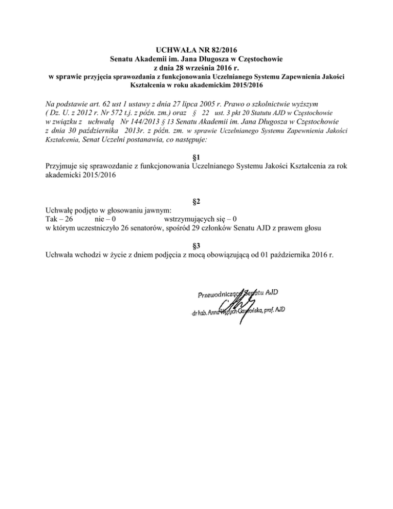 UCHWAŁA NR 82/2016 Senatu Akademii im. Jana Długosza w Częstochowie z dnia 28 września 2016 r. w sprawie przyjęcia sprawozdania z funkcjonowania Uczelnianego Systemu Zapewnienia Jakości Kształcenia w roku akademickim 2015/2016 Na podstawie art. 62 ust 1 ustawy z dnia 27 lipca 2005 r. Prawo o szkolnictwie wyższym ( Dz. U. z 2012 r. Nr 572 t.j. z późn. zm.) oraz § 22 ust. 3 pkt 20 Statutu AJD w Częstochowie w związku z uchwałą Nr 144/2013 § 13 Senatu Akademii im. Jana Długosza w Częstochowie z dnia 30 października 2013r. z późn. zm. w sprawie Uczelnianego Systemu Zapewnienia Jakości Kształcenia, Senat Uczelni postanawia, co następuje: §1 Przyjmuje się sprawozdanie z funkcjonowania Uczelnianego Systemu Jakości Kształcenia za rok akademicki 2015/2016 §2 Uchwałę podjęto w głosowaniu jawnym: Tak – 26 nie – 0 wstrzymujących się – 0 w którym uczestniczyło 26 senatorów, spośród 29 członków Senatu AJD z prawem głosu §3 Uchwała wchodzi w życie z dniem podjęcia z mocą obowiązującą od 01 października 2016 r. Załącznik do Uchwały Nr 82/2016 Senatu AJD w Częstochowie z dnia 28 września 2016 r. Sprawozdanie z działalności Uczelnianego Systemu Zapewnienia Jakości Kształcenia w Akademii im. Jana Długosza w Częstochowie w roku akademickim 2015/2016 do przedstawienia na posiedzeniu Senatu Akademii 28 września 2015 roku W roku akademickim 2015/2016 realizowano działania mające na celu stałą poprawę jakości kształcenia, a także ewaluację Uczelnianego Systemu Zapewnienia Jakości Kształcenia (USZJK). USZJK wspierało działania jednostek w przygotowaniu programów kształcenia dostosowanych do profilu ogólnoakademickiego lub praktycznego zgodnie z wymaganiami określonymi w ustawie Prawo o szkolnictwie wyższym. Przeprowadzono kolejne badania ankietowe zajęć dydaktycznych (po semestrze zimowym i po semestrze letnim) oraz badania ankietowe pracy dziekanatów (zgodnie z decyzją wydziału). Wyniki badań ankietowych zostały poddane analizie a informacje o nich umieszczone na stronach jednostek oraz na stronie USZJK. Większość ocen poprawiła się w stosunku do ubiegłych lat. W przypadkach poszczególnych wdrożono działania naprawcze. Przeprowadzono po raz kolejny badanie ankietowe oceny jakości kształcenia w Akademii przez studentów, doktorantów i słuchaczy studiów podyplomowych. Badanie uwzględnia szeroki zakres pytań dotyczących warunków kształcenia w Akademii i stopnia zadowolenia studentów, doktorantów i słuchaczy z odbywanych studiów. Wszystkie uwagi podlegają analizie. Podejmowane są działania mające na celu poprawę wskazanych braków. Wszystkie uwagi podlegają analizie (z uwzględnieniem marginesu błędu - np. w ankietach pojawiły się oceny biblioteki wydziałowej Wydziału Pedagogicznego, której nie ma). Podejmowane są działania mające na celu poprawę wskazanych braków, takie jak: - liczba zajęć praktycznych w programie kształcenia; - zmiany w zakresie PSW; - zmiany w zakresie systemu Erasmus Plus - kwestia możliwości wyjazdów, informacji na temat systemu, transferu punktów ECTS; - kwestia funkcjonowania punktów ECTS; - kilka razy pojawiła się kwestia akceptowania przez kadrę akademicką ściągania, kopiowania, itd. - doskonalenie sieci Wi-Fi; - wprowadzenie zasad umieszczania aktualnych informacji o odwołaniu zajęć (zarządzenie Rektora); - korzystniejsze dla studentów plany zajęć; - dostęp do ksero; - parkingi i dostęp do nich; - działania mające na celu większe uwzględnianie potrzeb osób z niepełnosprawnościami; - większość Wydziałów zwracało uwagę na niski stopień korzystania z biblioteki. Równocześnie sporo uwag jest dla funkcjonowania Uczelni bardzo dobrych, wiele osób zdecydowanie tak odpowiedziało na pytanie dotyczące ponownego wyboru Uczelni i kierunku studiów. Tym bardziej należy dążyć do poprawy tych kwestii, które są przez studentów i doktorantów podnoszone jako ważne. Wyniki ankiet są dostępne na stronie USZJK. Jednostki Uczelni poproszone zostały o szczegółowe odniesienie się do uwag i zastrzeżeń. W ramach USZJK wprowadzono zarządzenie dotyczące jednolitego systemu informacyjnego, umożliwiającego gromadzenie, przetwarzanie i wykorzystywanie informacji powstających w następstwie stosowania USZJK, w tym procedur, badających dostępność i aktualność publikowanych informacji. Prowadzono prace nad wprowadzeniem badania ankietowego, które pozwoliłoby na ocenę skuteczności procesów zarządzania informacją, w szczególności adekwatności zakresu gromadzonych danych do potrzeb interesariuszy wewnętrznych i zewnętrznych oraz zadowolenia interesariuszy ze sposobów raportowania i prezentowania informacji. Uczelniany Zespół ds. Ankietyzacji i Ewaluacji przygotował projekt ankiety skierowanej do interesariuszy. Kontynuowano prace nad opracowaniem i wprowadzeniem badania ankietowego dla pracowników naukowo-dydaktycznych i pracowników administracji. W roku akademickim 2015/2016 przeprowadzono hospitacje według nowego wzoru arkusza, uwzględniając znaczenie tej formy ewaluacji jako istotnego sposobu podnoszenia jakości kształcenia. USZJK brał udział w procesie wprowadzania w Uczelni form i metod kształcenia on-line (przeprowadzenie szkolenia 50 pracowników Uczelni oraz stworzenie w strukturach Uczelni Centrum Kształcenia na Odległość, które będzie nadzorować działalność dydaktyczną prowadzoną z wykorzystaniem technik kształcenia on-line). Uczelniany Zespół ds. Ankietyzacji i Ewaluacji przygotował sylabus nowego przedmiotu „Metody uczenia się i studiowania”, który będzie obowiązkowym przedmiotem w pierwszym semestrze studiów pierwszego stopnia każdego kierunku. Odbyły się Warsztaty Dobrych Praktyk służące wymianie doświadczeń z zakresu jakości kształcenia. Warsztaty dotyczyły wprowadzenia do programów kształcenia w Akademii zajęć z zakresu tutoringu. Jakość k