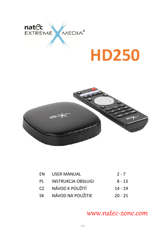 HD250 EN PL CZ SK USER MANUAL INSTRUKCJA OBSŁUGI NÁVOD K POUŽITÍ NÁVOD NA POUŽITIE 2-7 8 - 13 14 - 19 20 - 25 www.natec-zone.com -1- EN - NATEC EXTREME MEDIA HD250 – USER MANUAL Introduction Thank you for purchasing our Smart TV box ideal for entertainment and studying. Device also allows to watch TV channels via IPTV. Please read the following instructions carefully before operating the Smart TV dongle. Keep it for future reference. For proper operation of the equipment and the ability to enjoy all the applications available for the device during initial startup is recommended to perform software updates. To do this action it is required connect device to internet access. To update the device please enter into Settings tab then information about the device and there System Update. The update process will automatically download the updates files and then ask you if you want to install the software where you should click OK and wait until the device will restart and complete the update. General description Product Features Turns any TV with HDMI port into smart TV, Allows to watch TV channels, e.g. IPTV, Allows to enjoy thousands of free apps and games, Powerful processor running on Android operating system, Supports hardware H.265/HEVC 4K 30fps video decoding, Ethernet port for stable internet connection, Remote control in set. Specifications Android 4.4 operating system Allwinner H3 Quad Core ARM-Cortex A7 up to 1.2GHz main frequency Quad core Mali400 GPU 3D Graphics engine with OpenGL ES 2.0 GPU RAM: 1G DDR3 FLASH memory: 8GB Wi-Fi 802.11 b/g/n Ethernet port (RJ-450) -2- TF micro SD card slot for extension memory 4GB~32GB 2x USB 2.0 ports: allows connection of accessories (keyboard, mouse) Ultra HD 4K HDMI output (NTSC/PAL) AV video output (3.5mm jack) Supports Ultra HD 4096x2160P@30fps video decoding Video formats: AVI, DIVX, XVID, RM, RMVB, MKV, WMV, MOV, MP4, MPEG, DAT (VCD), VOB (DVD), PMP, MPEG, MPG, FLV, ASF, TS, TP, 3GP, MPG Audio formats: MP3, WMA, FLAC, OGG, APE, AAC, AMR, ADPCM, L-PCM, AC3 Picture formats: JPG, BMP, PNG, GIF etc. Language: Multilingual Supports online Android application software, dictionary, E-book reading, PPTV, all kinds of applications can be downloaded at end user choices Size: 101,6*101,6*23,6mm Power adapter: input – AC 100V-240V, output – DC 5V/2000mA Instruction for use Connection Connect device to free HDMI port in TV, after this connect DC adapter to DC port on device and plug to power supply. Device will turn on automatically and enter into android OS Menu after booting. Power off: Press power key on operating panel to enter into power off status. Standby mode: Press power key to enter into standby mode. To turn on device from standby mode press any key on keyboard or mouse. To save energy power off the device if it’s not in use. Homepage Homepage will show up after booting the operating system. User can choose between 2 types of homepage. Selection of homepage can be done by pressing the homepage icon (please confirm if you want to use selected homepage “Always” or “Just once”) or in menu Settings -> Home screen. Icon functions on homepage Return key, return to the parent directory no matter on what page you are. Homepage. return to the homepage wherever you are. Background program icon. Click to see running programs. Volume -/+. Press to volume up or down. Power button, click on “Power” icon to shut power down. Notification Bar. Displaying strength of Wi-Fi signal and time. -3- Menu button, click to pop up the menu. Settings Android setup can be individualized basing on personal preference. Click the notification bar or setting icon in menu list to enter into setting interface as the pictures shows. Wi-Fi If the Wi-Fi connection is around you, please go to Wi-Fi settings and click ON/OFF icon. Potential WiFi network will be searched and listed down on the right side. Connecting: If Wi-Fi network has no password, device will connect to it automatically, otherwise, please type the password into pop up window and click “Connect” to connect. Advanced Wi-Fi setup:click the icons on top right corner for advanced settings. Notice: It is advised to turn off Wi-Fi to save power. Data usage: This option can show the state of Wi-Fi and working flow of background data. For restrict background data flow, please click top right corner icon for advanced settings. Sound This function allow to set volume and touch tone. Display settings: In this function you can set desktop wallpaper, screensaver and font size. -4- Screen In these setting you can turn HDMI on & off, set HDMI resolution and screen zoom. Applications This function shows all applications installed in this device. You can unload applications, remove data caused during usage and change the storage location. Notice:Applications storage can be moved between internal memory and TF card. Language & input In this function you can set system and keyboard language and other input methods. You can also download and install more input methods. Play Store Users can download android smart games and many different applications by clicking icon Play Store and put them to APK files which can be used after installing. Video This Smart TV dongle support Full HD 1080P 60fps video decoding. Click on Media player icon to enter movie files list. Click on screen during playing video, operating panel will come out and now you can set the functions according to your interests. -5- Music Click on Music player icon to enter music files list. You can sort all your music by select one of four options. USB Operation Connect USB cable to computer, USB connecting icon appear on screen, click "turn on USB storage". Open "My computer", two removable disks will appear, first one is TF card reader (it can not be opened if the TF Card is not inserted), the second one is internal memory. Notice: Don't execute USB connection while other functions, such as playing music, movie, game etc. are running, otherwi